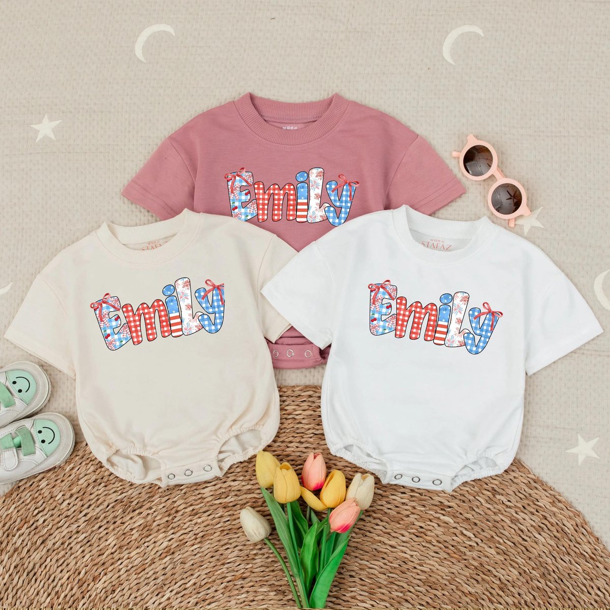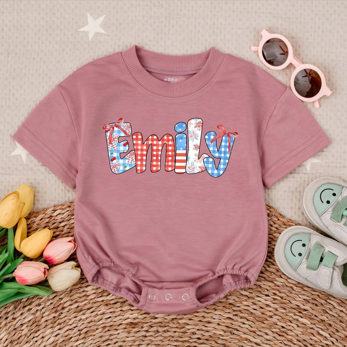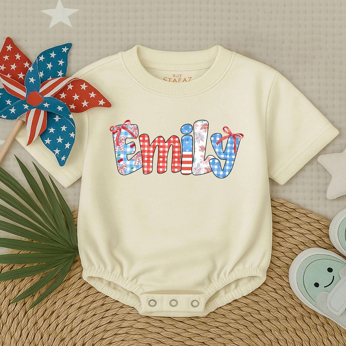 Personalized 4th of July Short Sleeve Bubble Romper Custom Baby Girl Outfit Red White Blue Toddler C