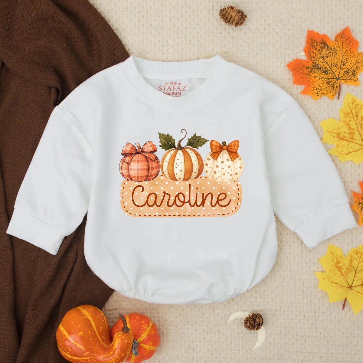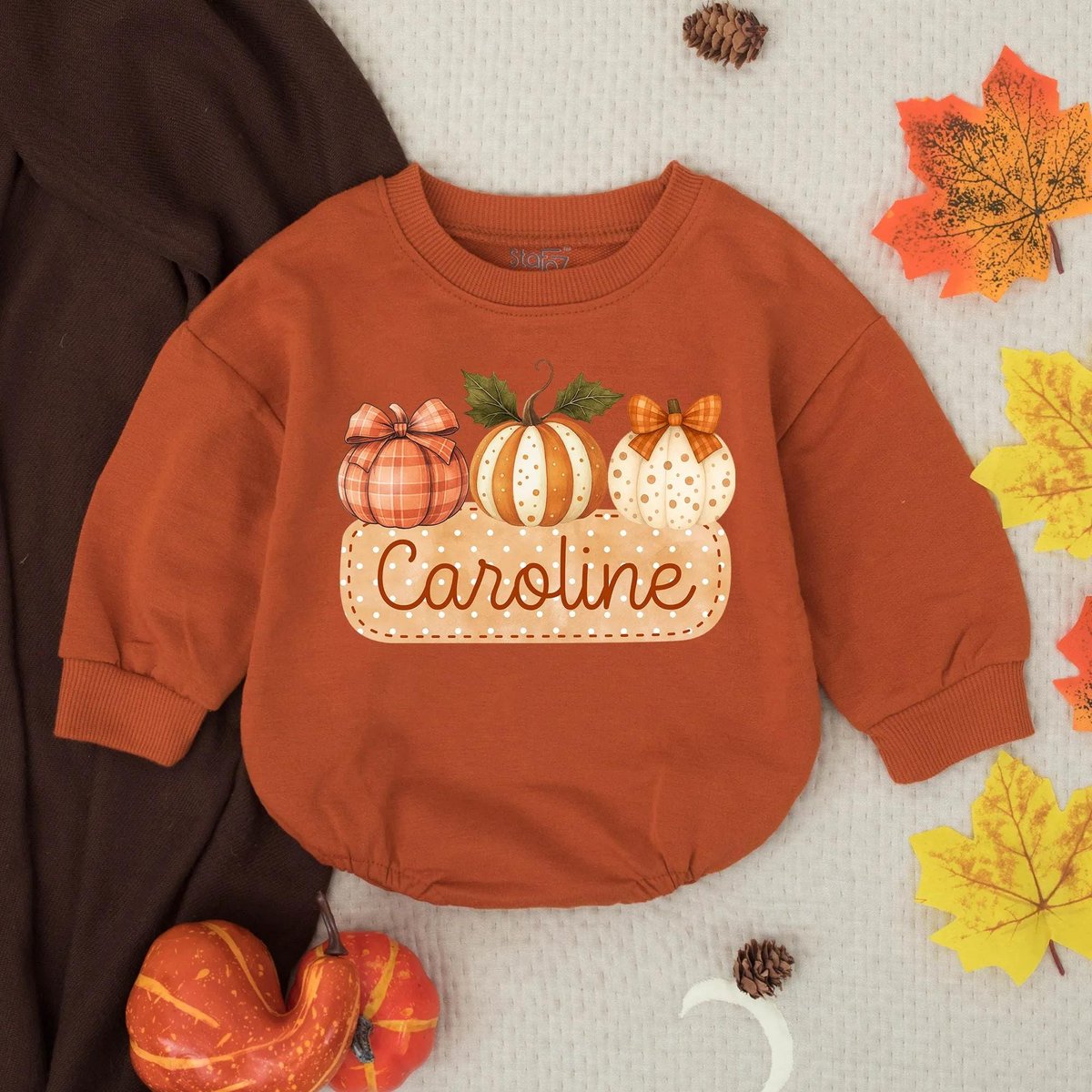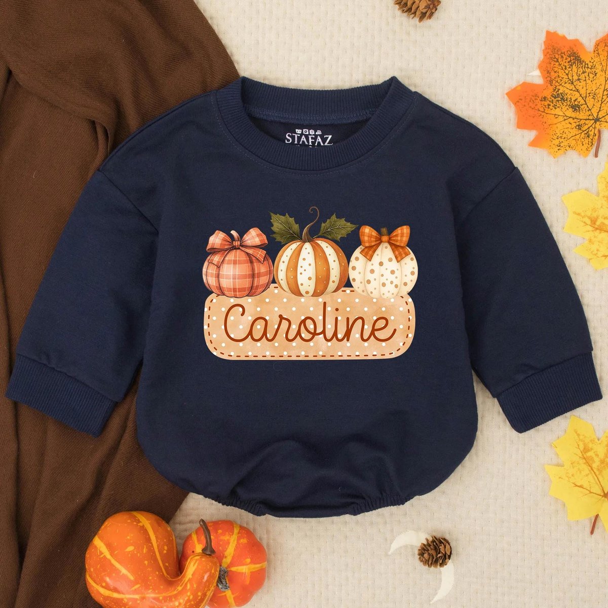 Personalized Girls Fall Pumpkin Bubble Romper Custom Name Thanksgiving Baby Outfit Autumn Toddler Cl