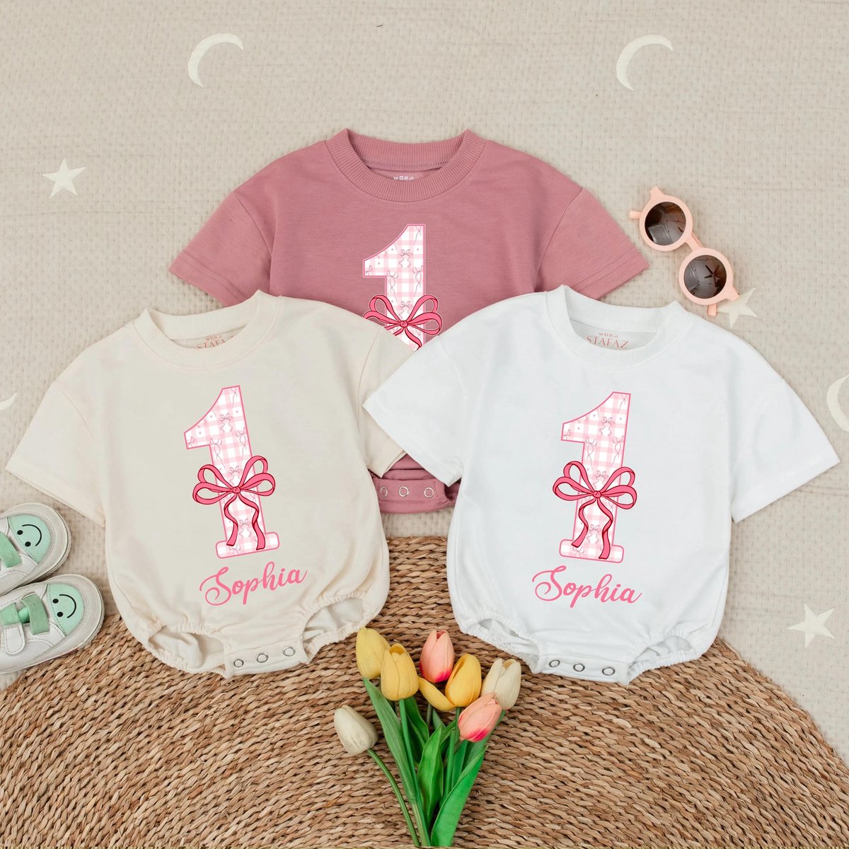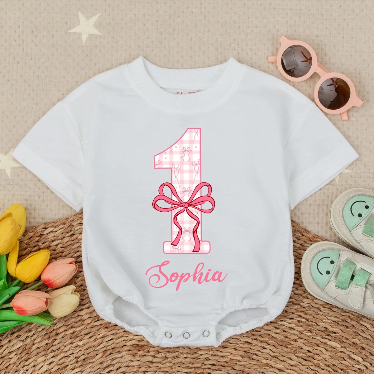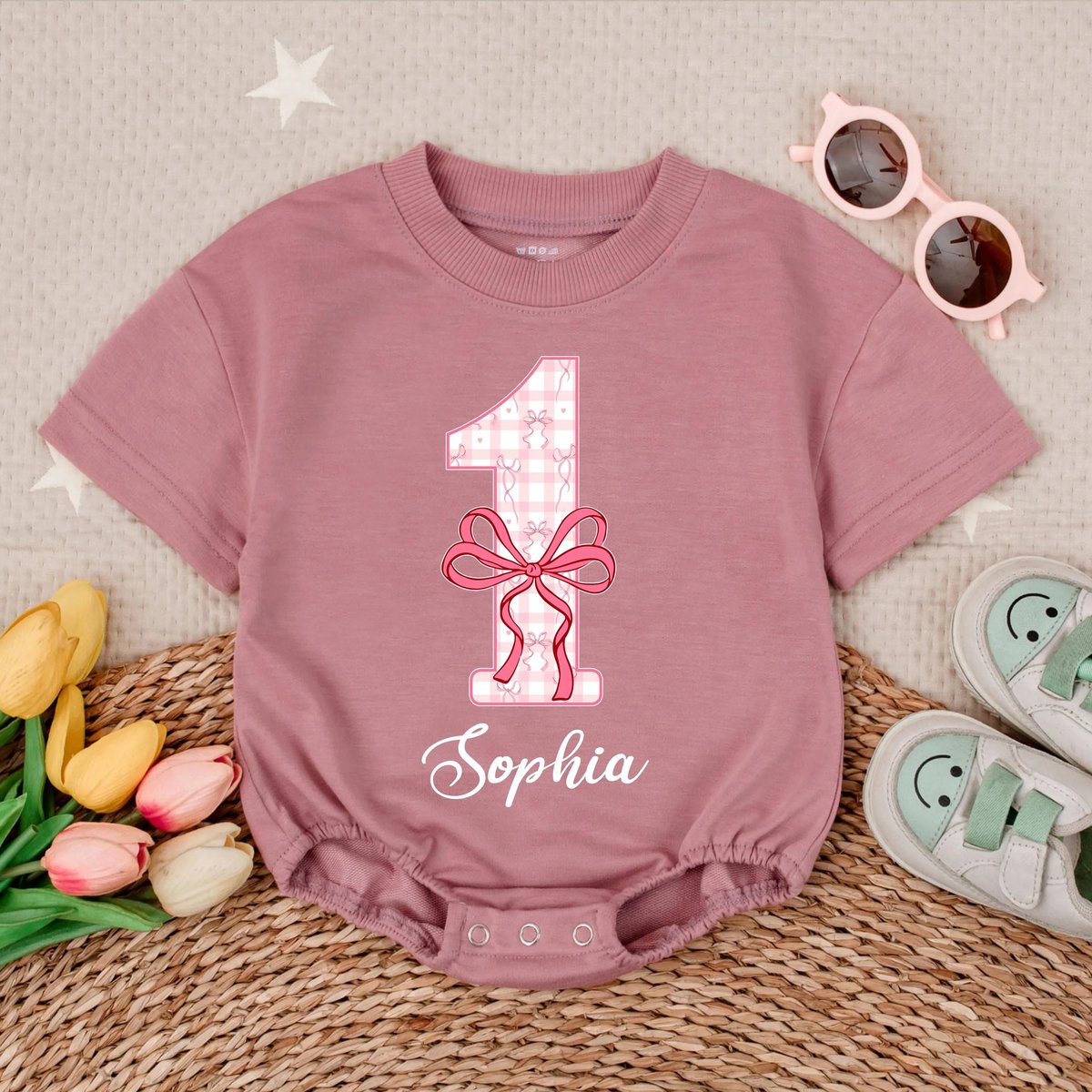 Personalized Pink Bow First Birthday Baby Romper Custom Name Short Sleeve Bubble Romper Cute Baby Gi