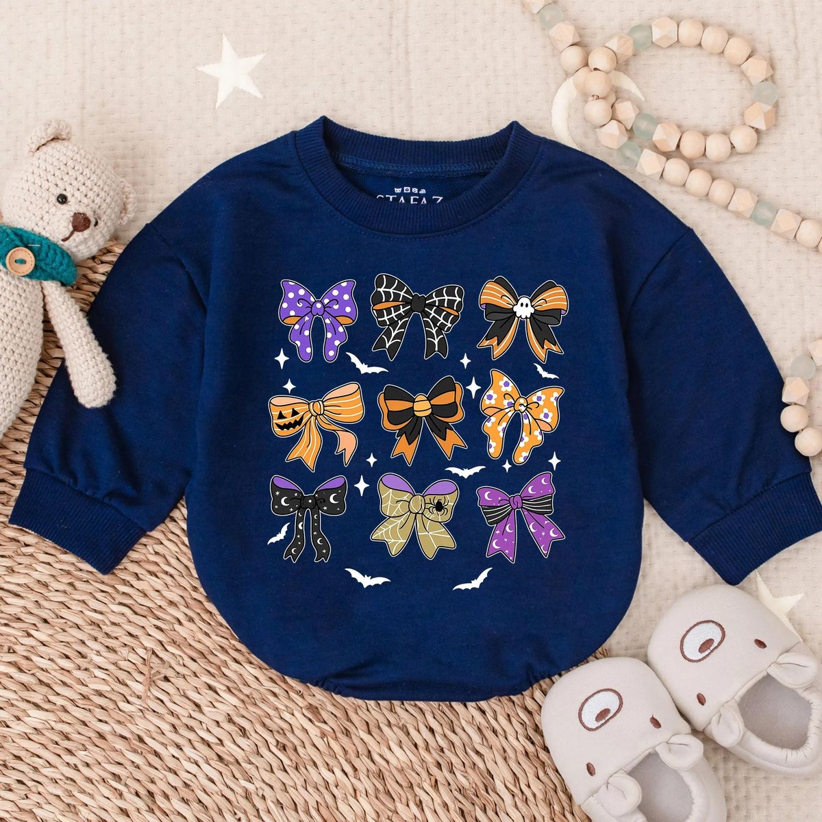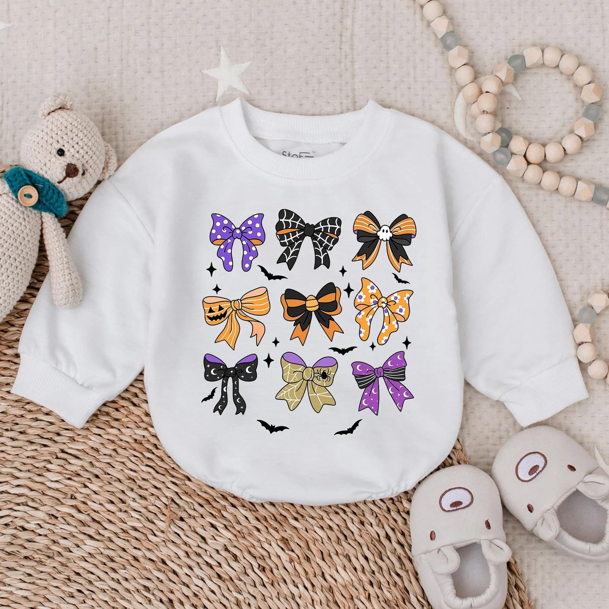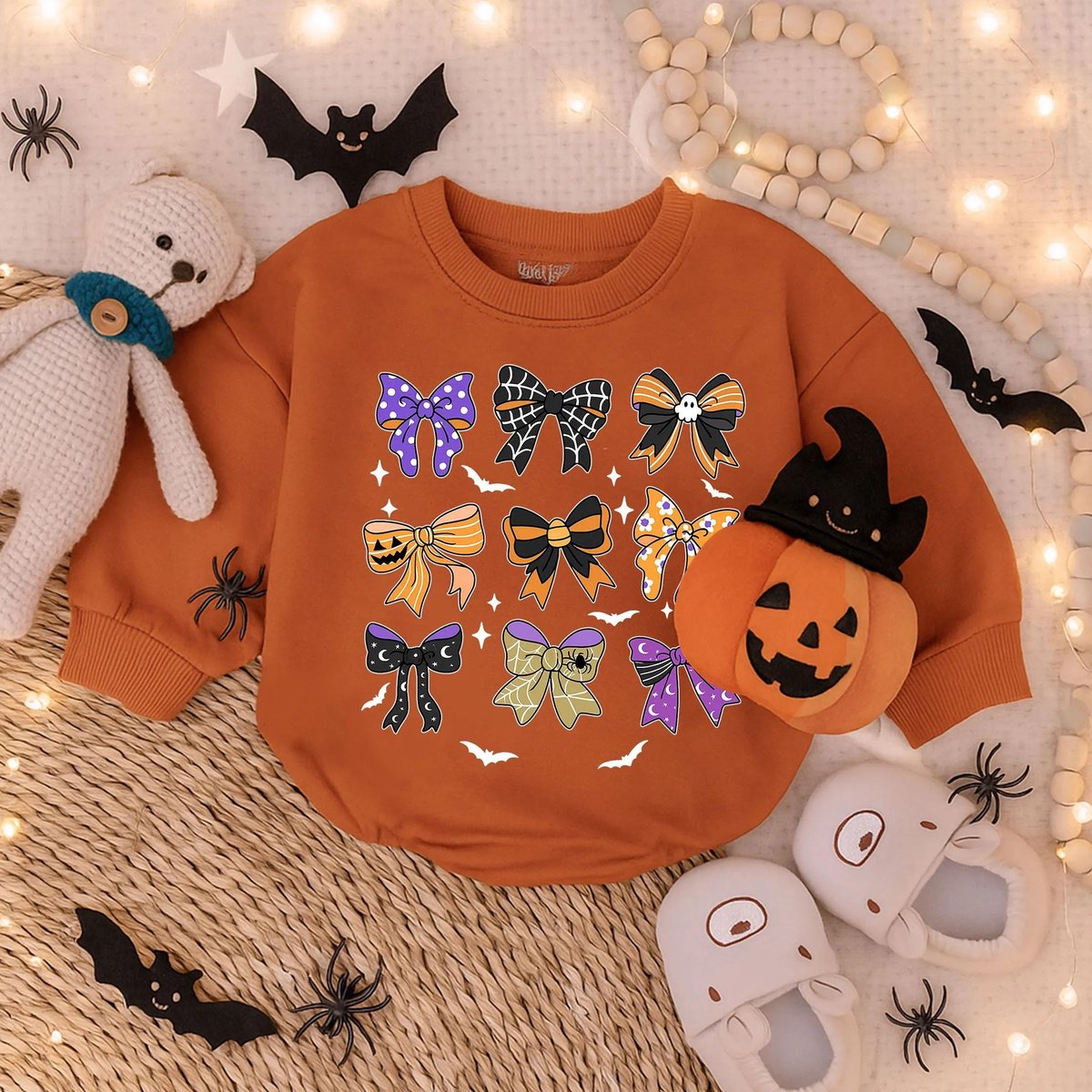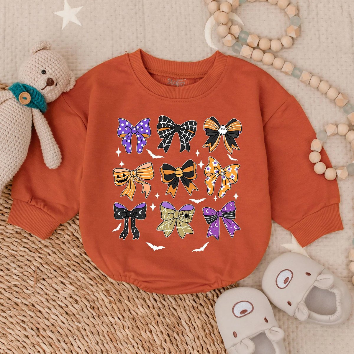 Retro Halloween Bubble Romper with Bow Baby Girl Spooky Outfit Charming Fall Bodysuit Toddler Pumpki