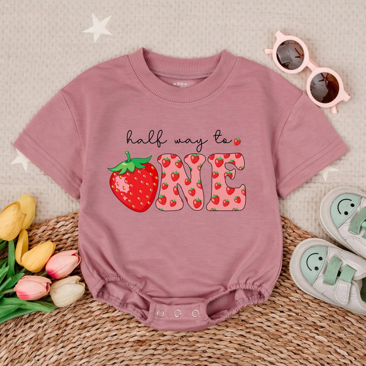 Strawberry Half Birthday Baby Girl Romper Toddler Short Sleeve Bubble Romper 6 Months Clothes Summer