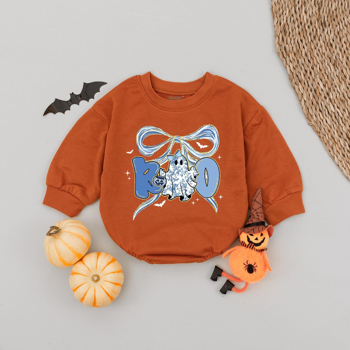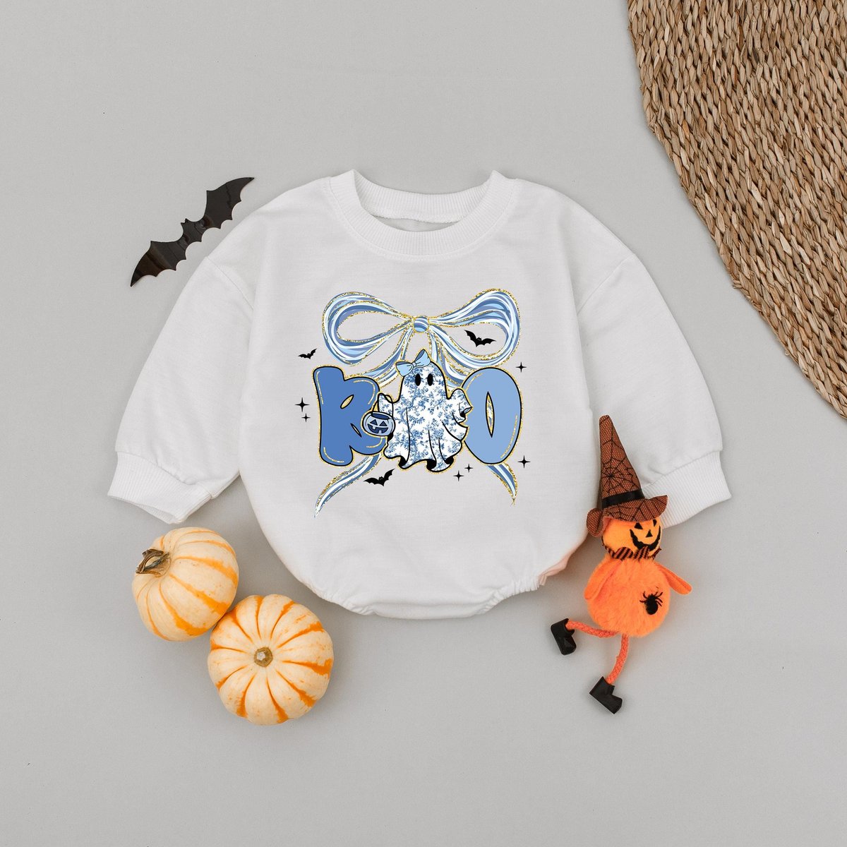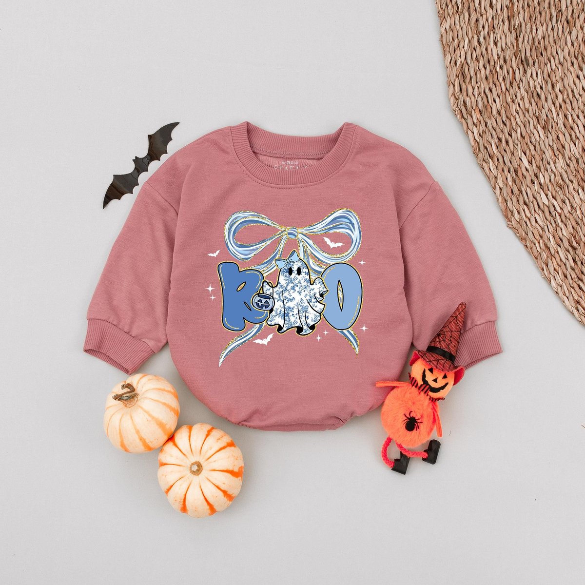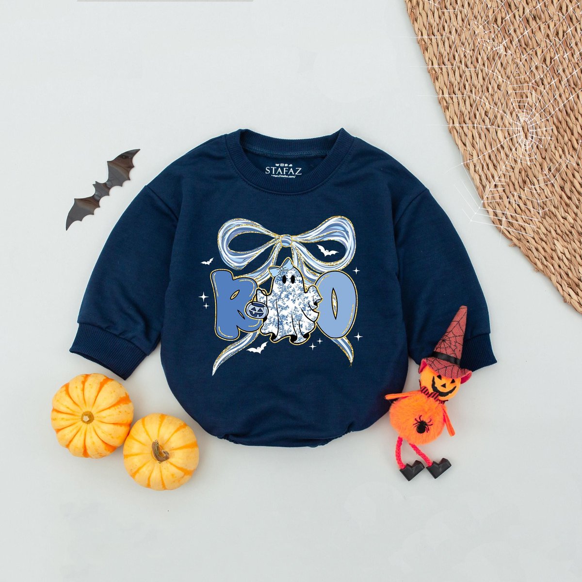 Boo Spooky Blue Bow Bubble Romper Cute Halloween Outfit for Girls Infant Toddler Fall Costume Outfit