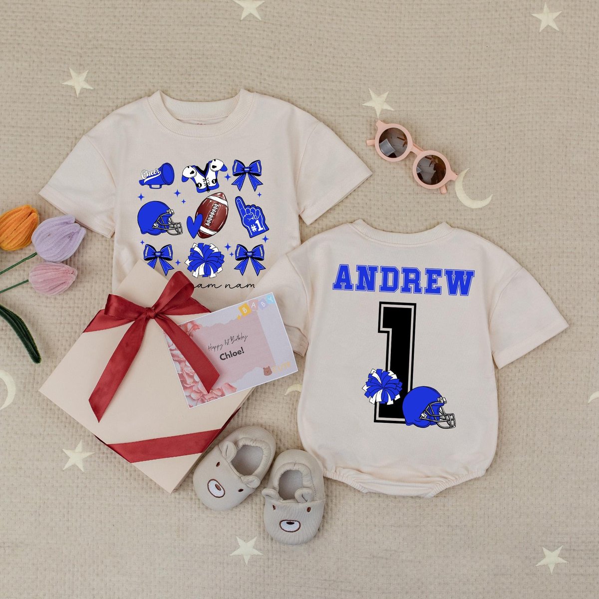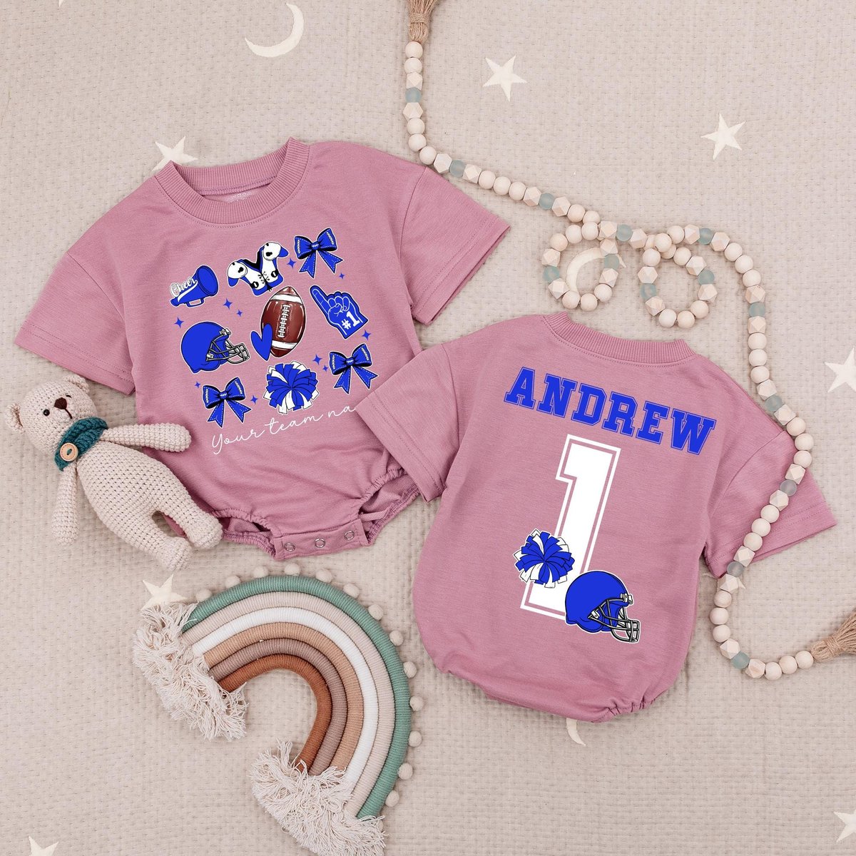 Custom Name and Number Football Bow Bubble Romper Blue Bows Football Team Babysuit Girls Cheer Masco