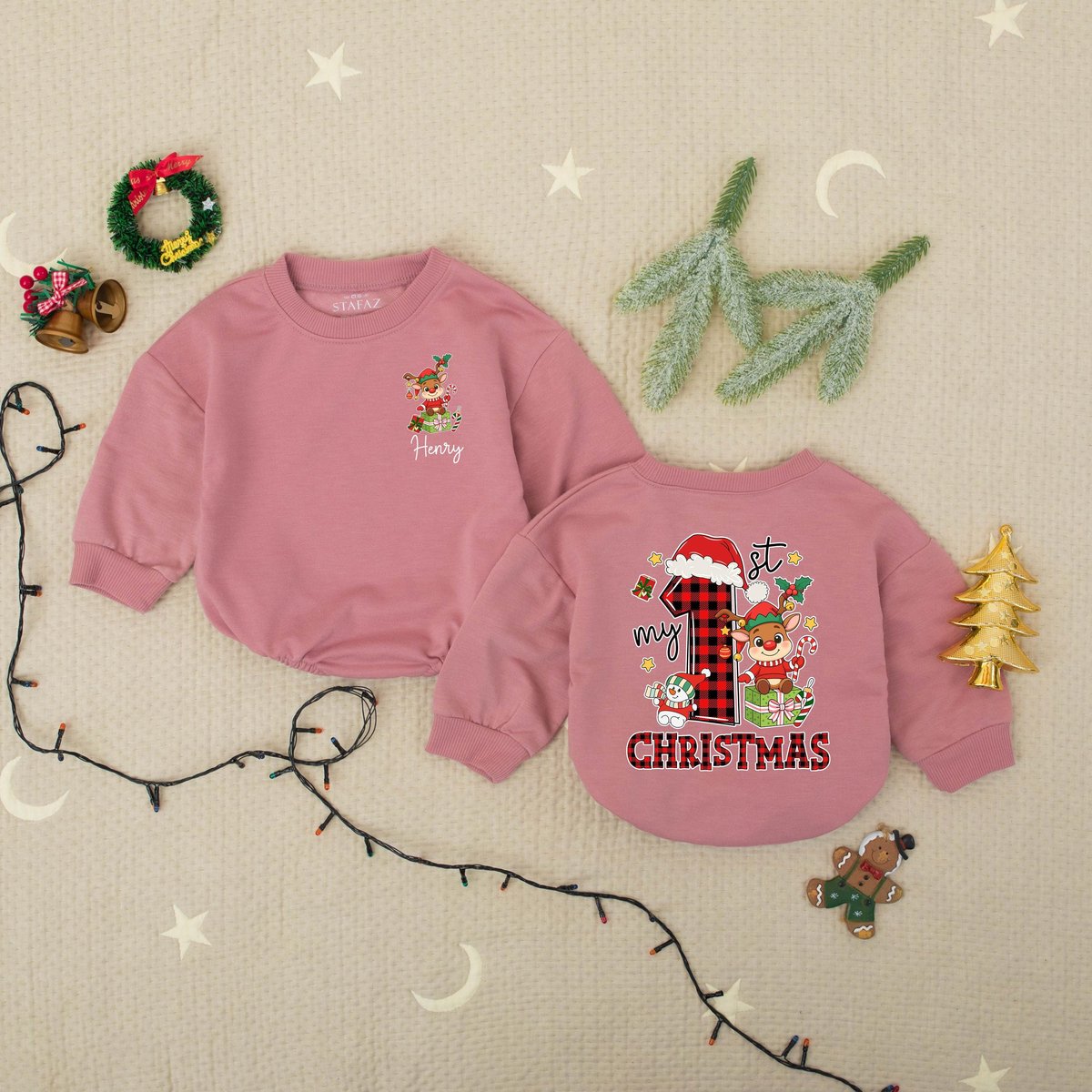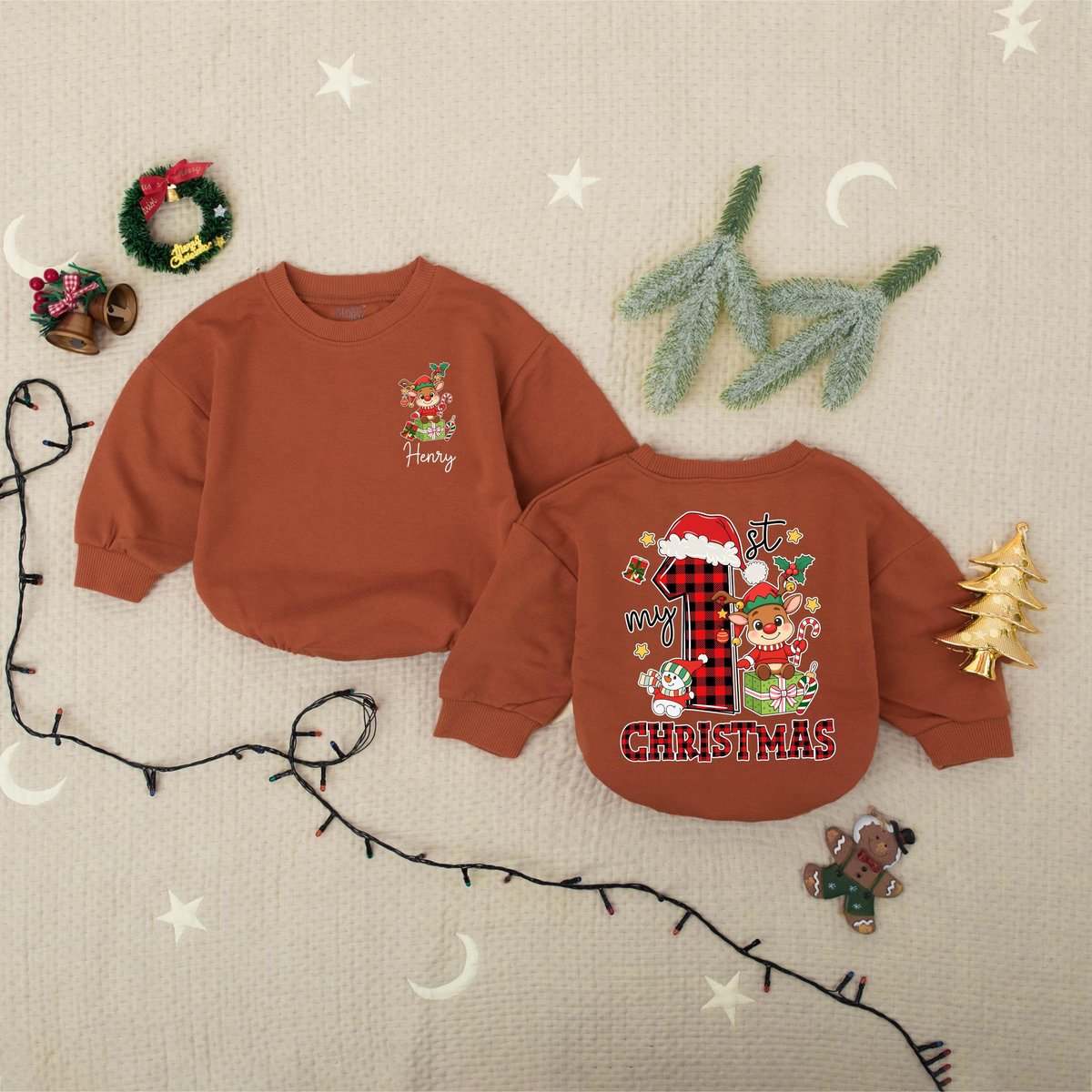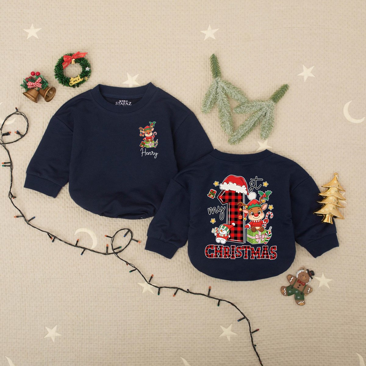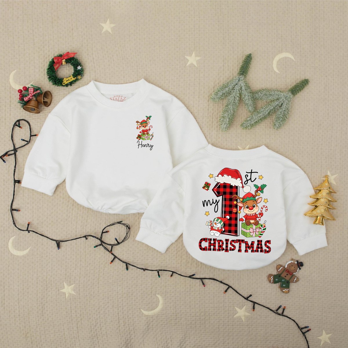 Custom Name Christmas Bubble Romper Cute Reindeer Baby Bodysuit Christmas Baby Boy Gift Xmas Birthda