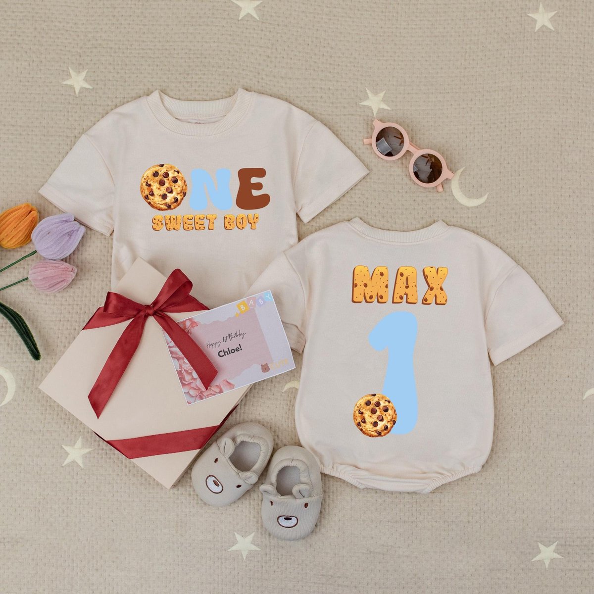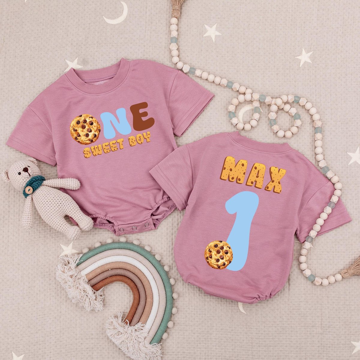 Custom Name Cookie First Birthday Bubble Romper Chocolate Chip 1st Birthday Outfit Milk and Cookies