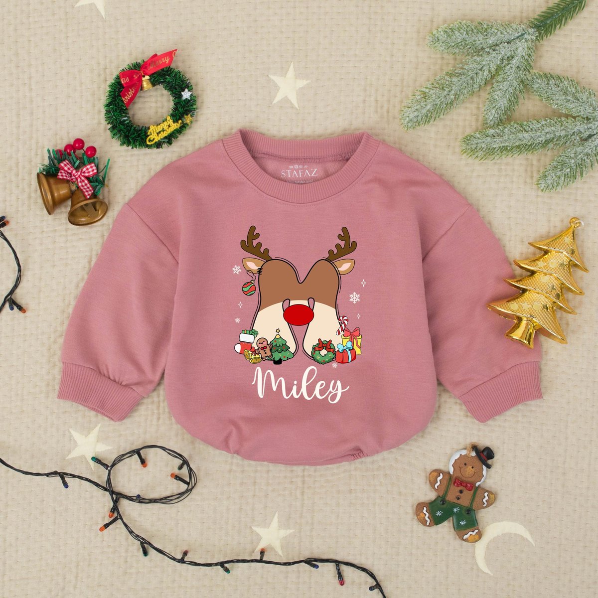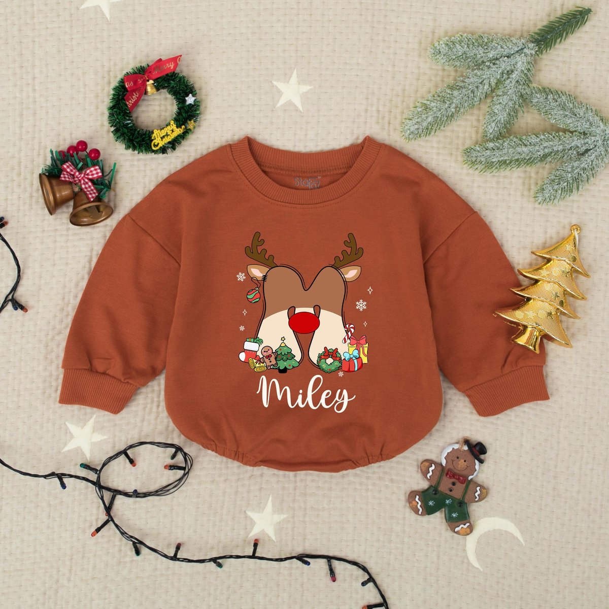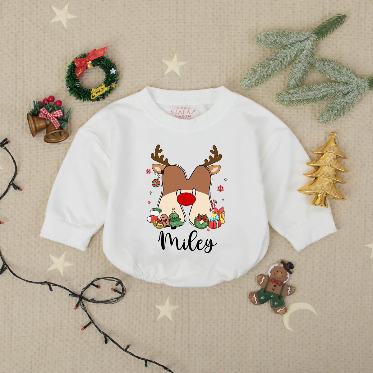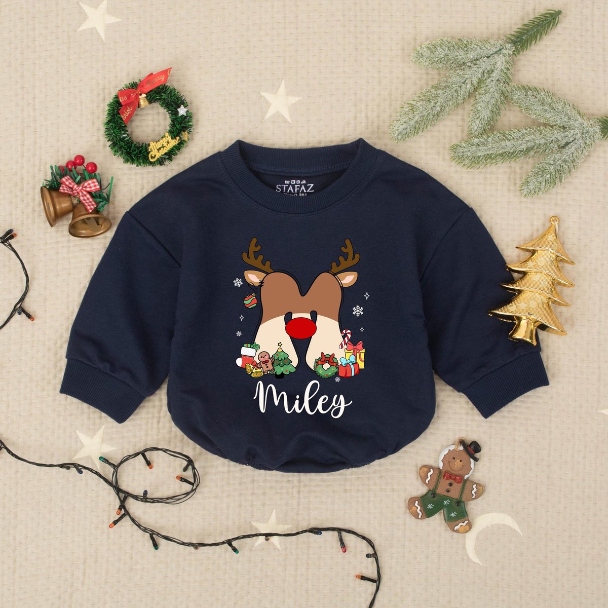 Custom Name Cute Reindeer Christmas Baby Romper Sweater Personalized Holiday Infant Outfit Newborn X