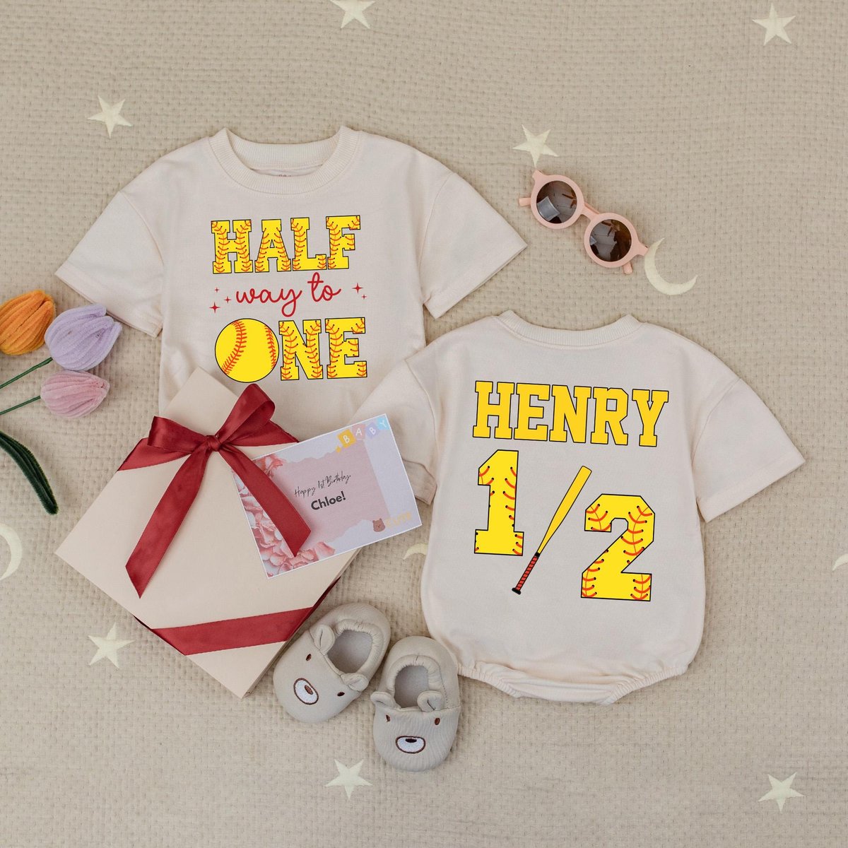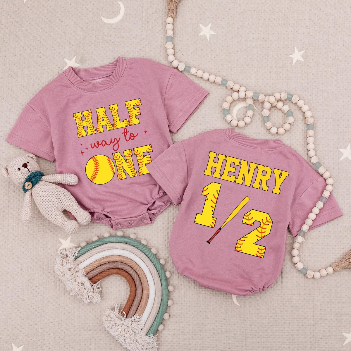 Custom Name Half Way To One Baby Romper Softball 6 Month Baby Outfit Softball Half Birthday Party 12