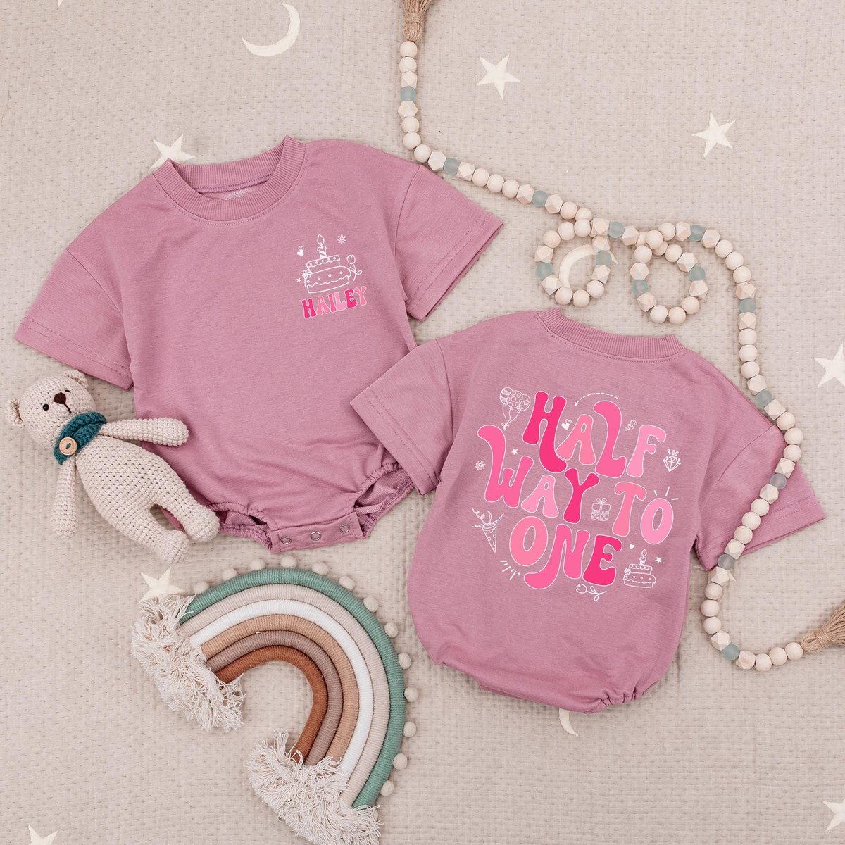 Custom Name Halfway to One Baby Romper Pink Bow Baby Girl 6 Month Outfit Half Birthday Bodysuit Cust