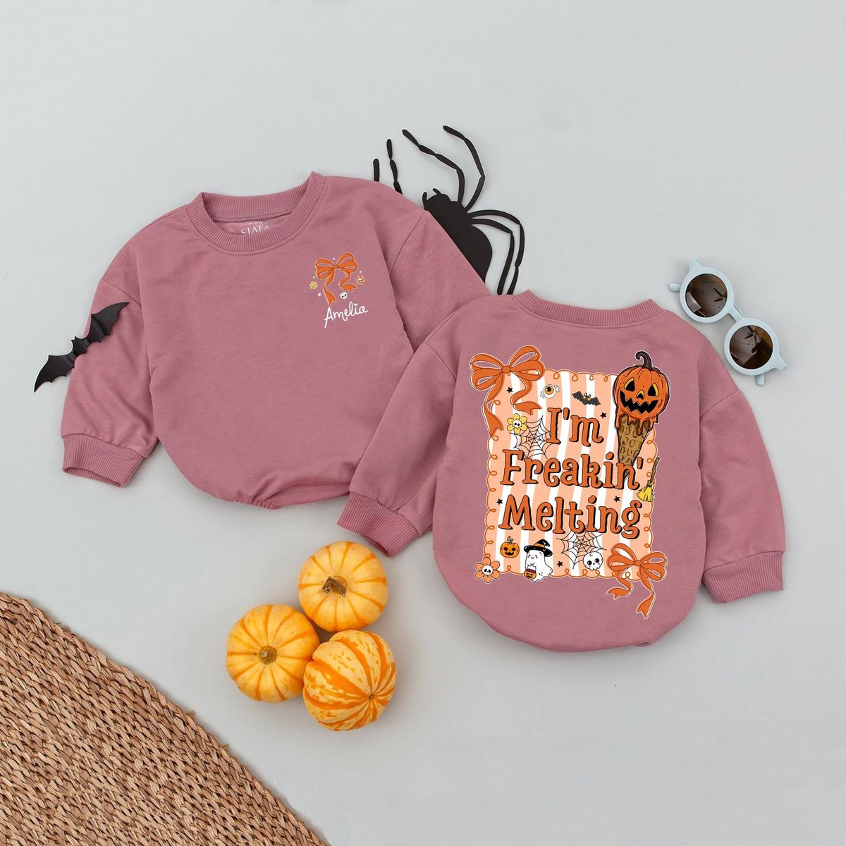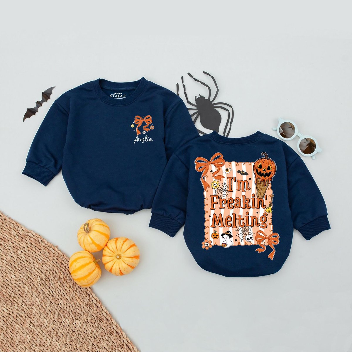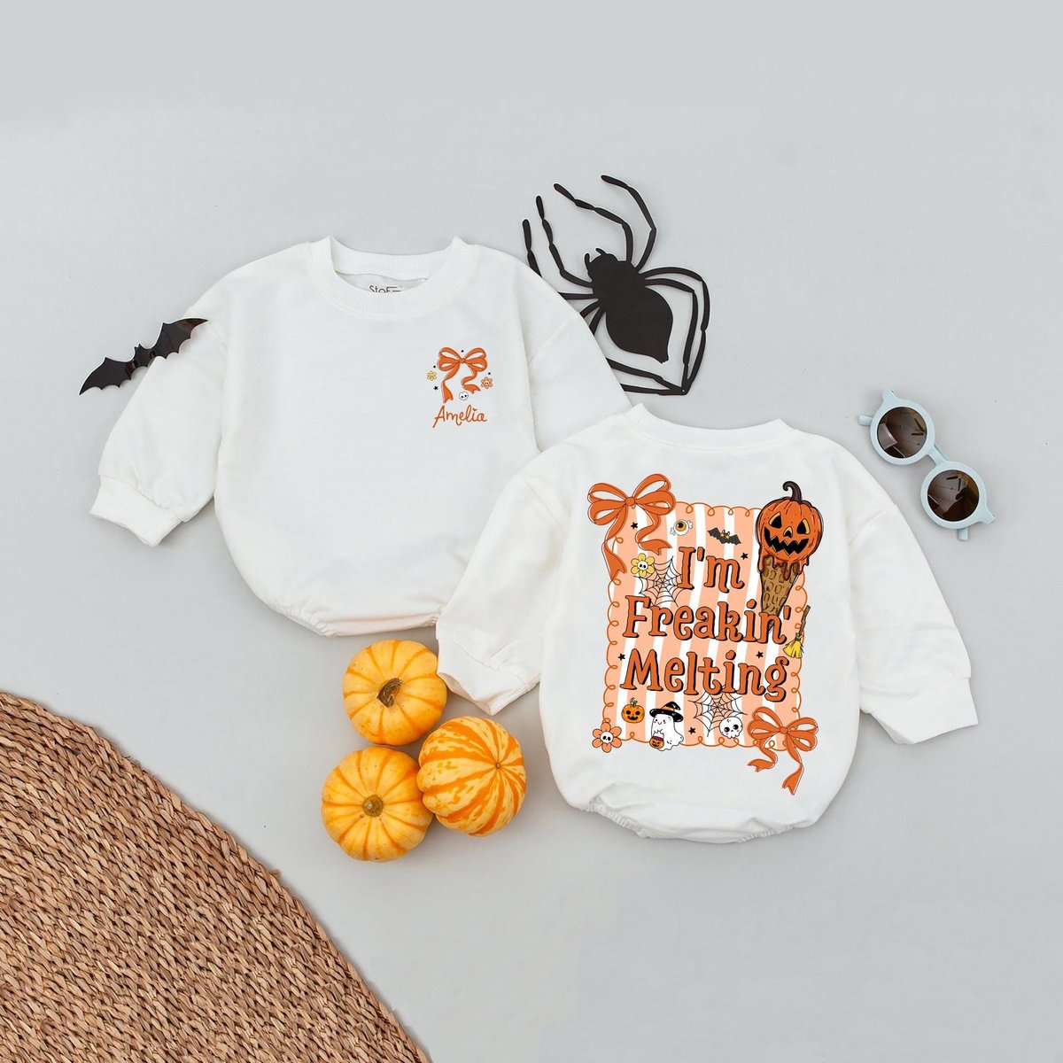 Custom Name I’m Freakin’ Melting Bubble Romper Cute Ghost Ice Cream Bow Halloween Baby Romper Cree
