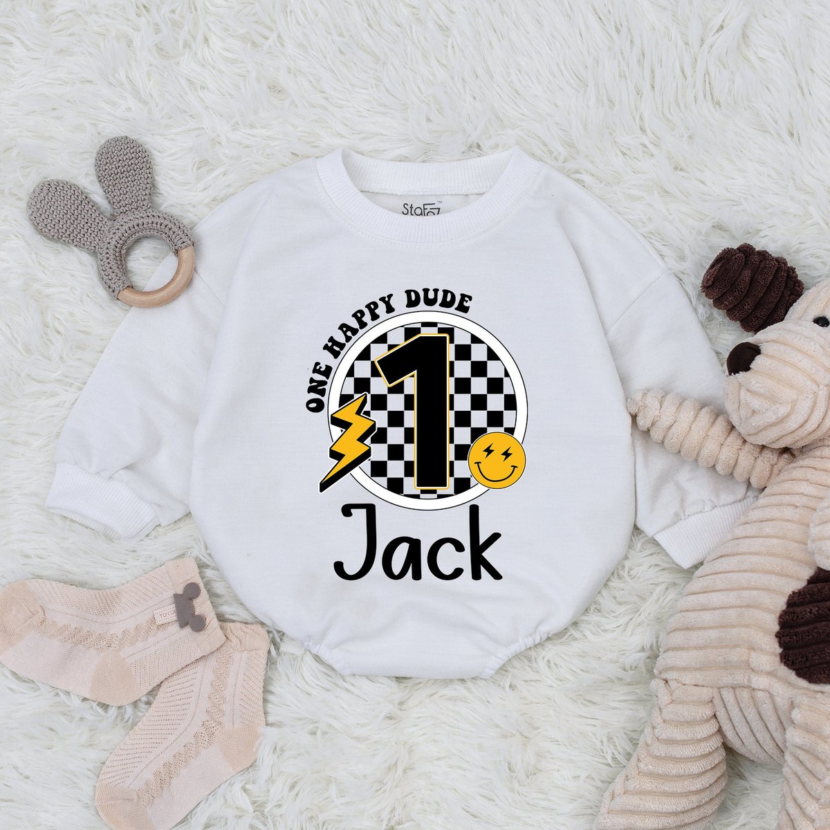 Custom Name One Happy Dude Birthday Bodysuit Smiley Face First Birthday Outfit Baby Retro Groovy Che