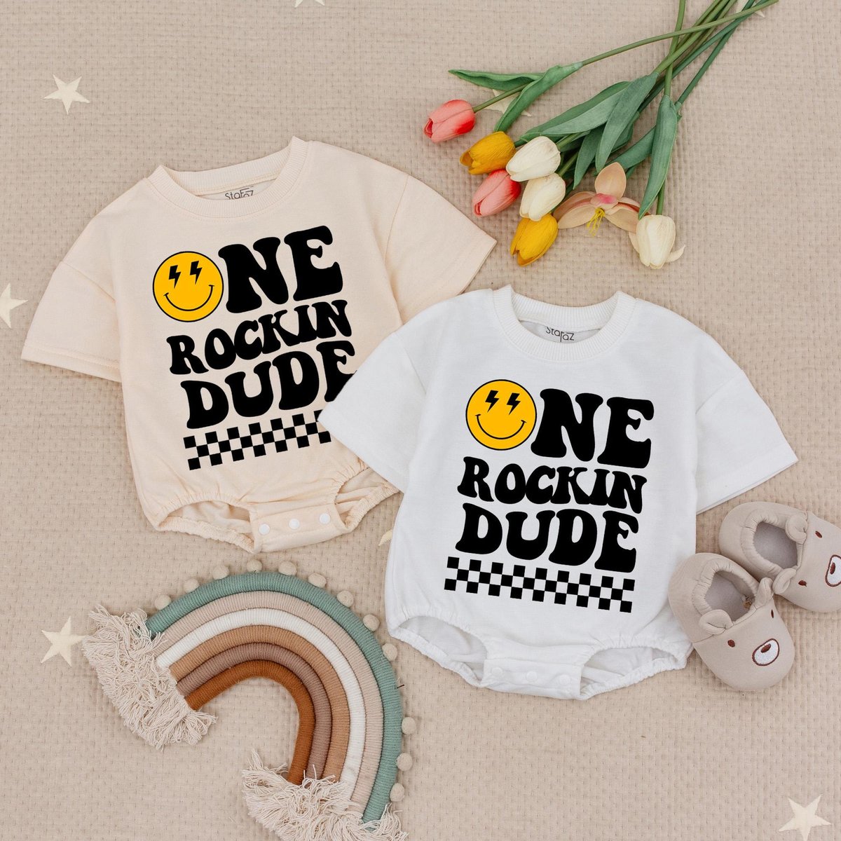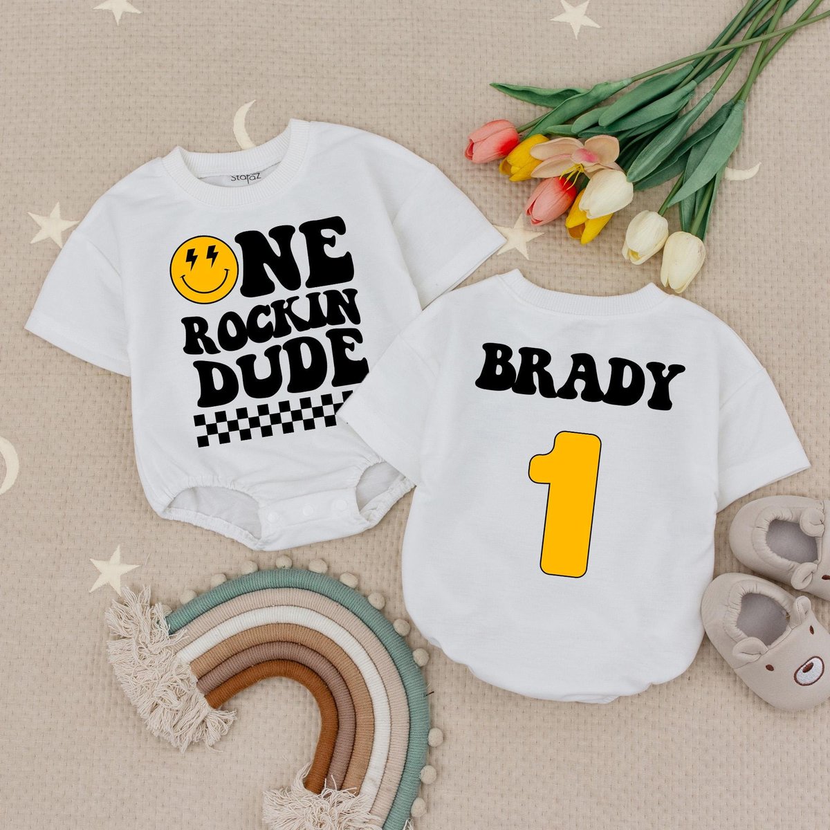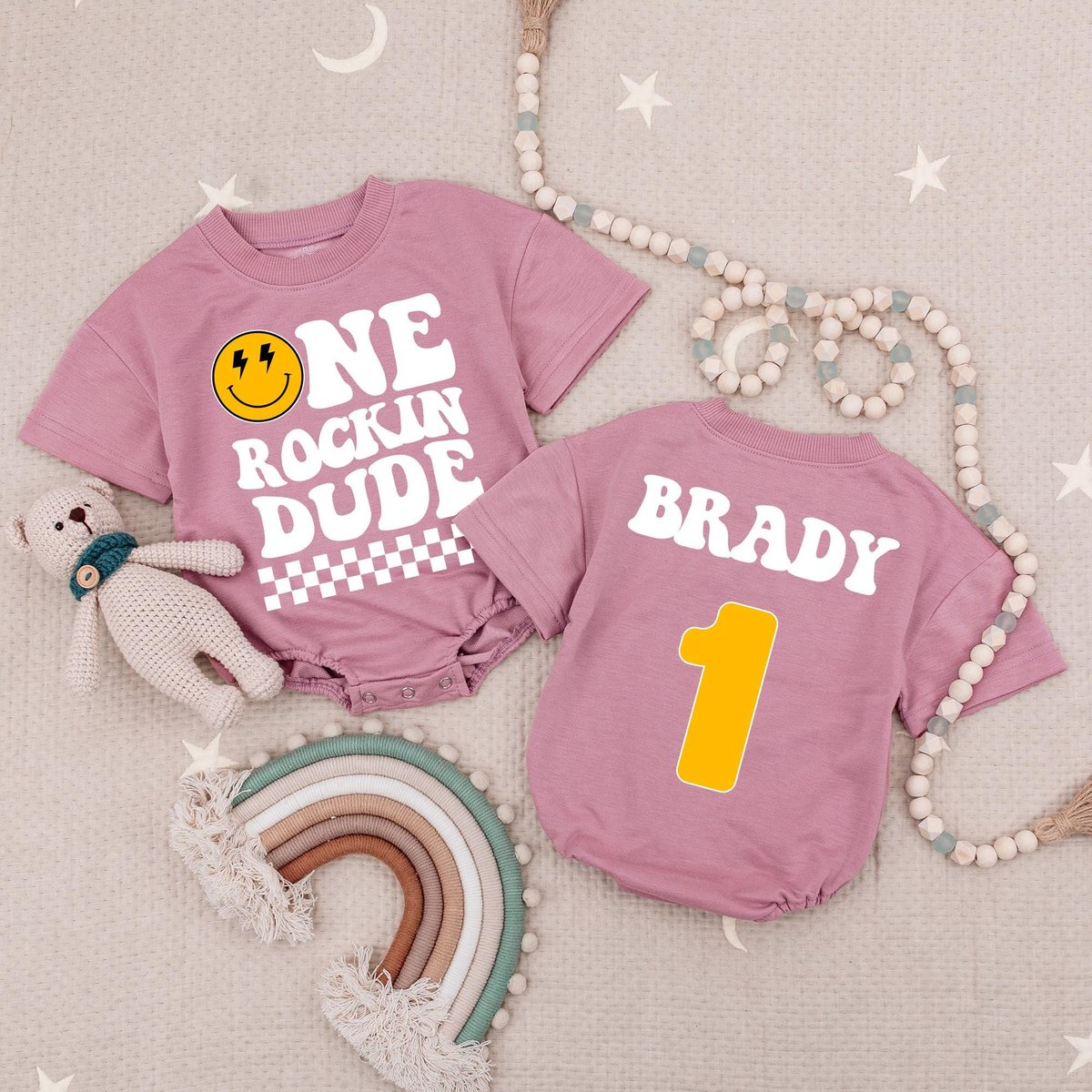Custom Name One Rockin Dude Birthday Baby Romper Custom Name Smiley Face Romper First Birthday Outfi