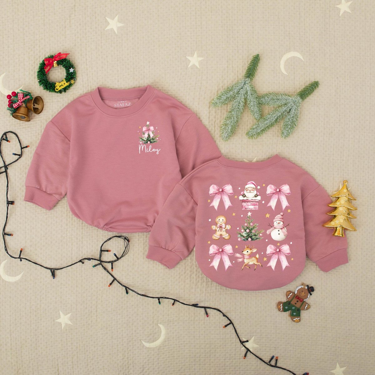 Custom Name Pink Bow Christmas Baby Romper Sweater Pink Bow Christmas Babysuit Santa Christmas Baby