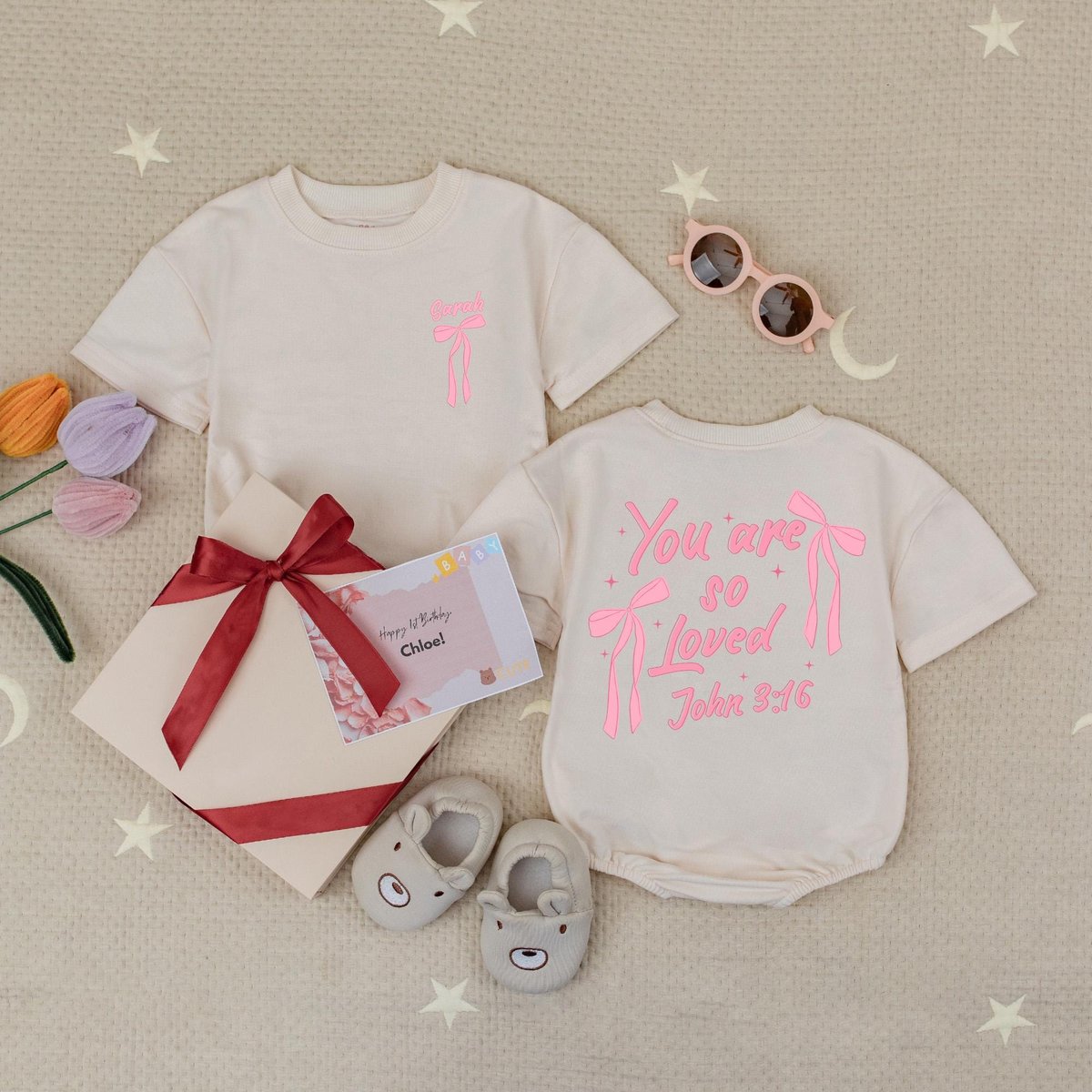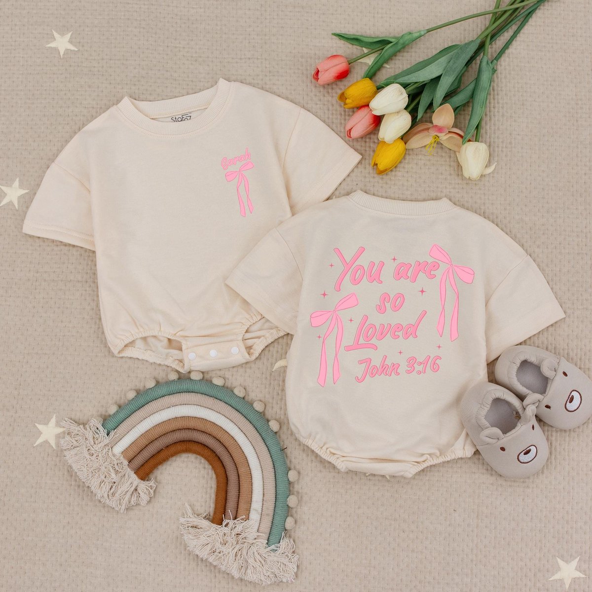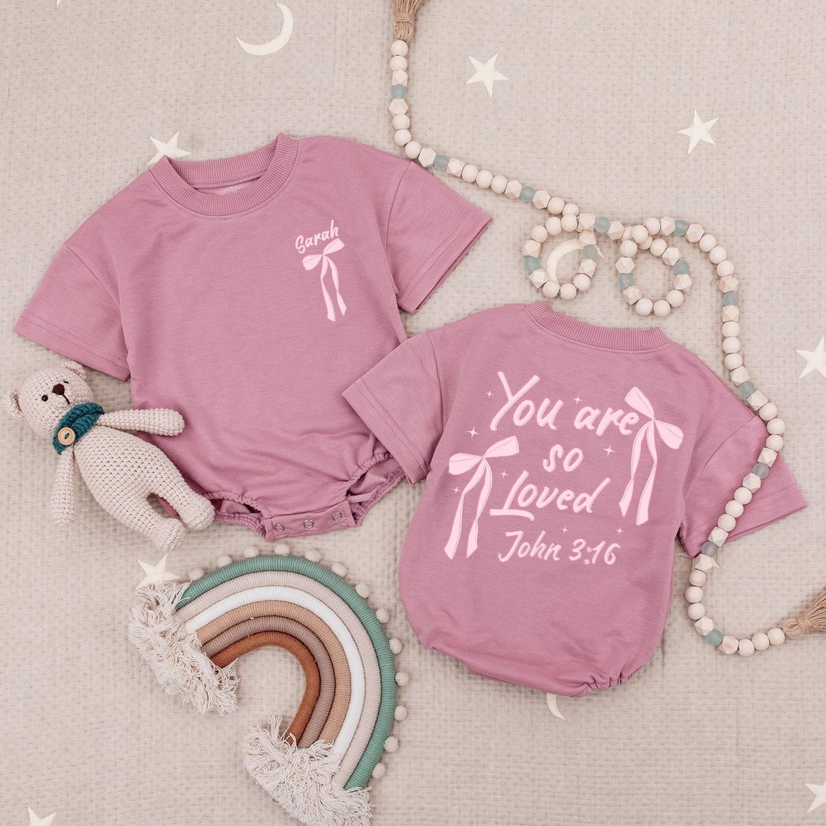 Custom Name Pink Bow You Are So Loved Baby Romper Christian Pink Bow Bubble Romper Girl Baby Romper