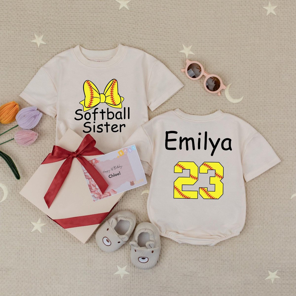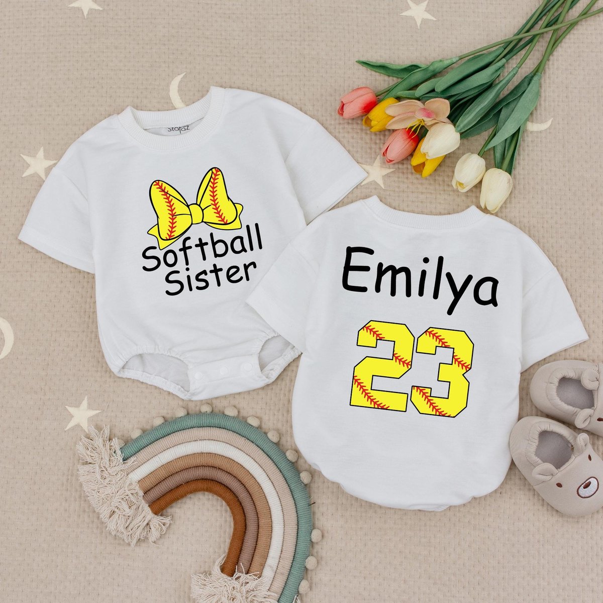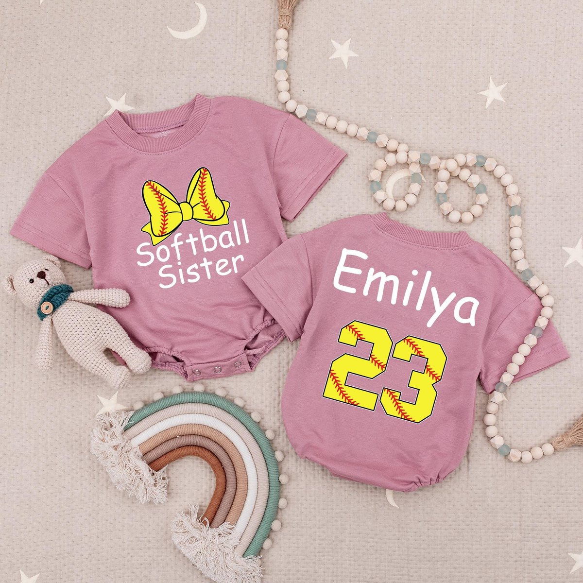 Custom Name Softball Sister Baby Romper Little Sister Biggest Fan Babysuit Little Sister Game Day Te