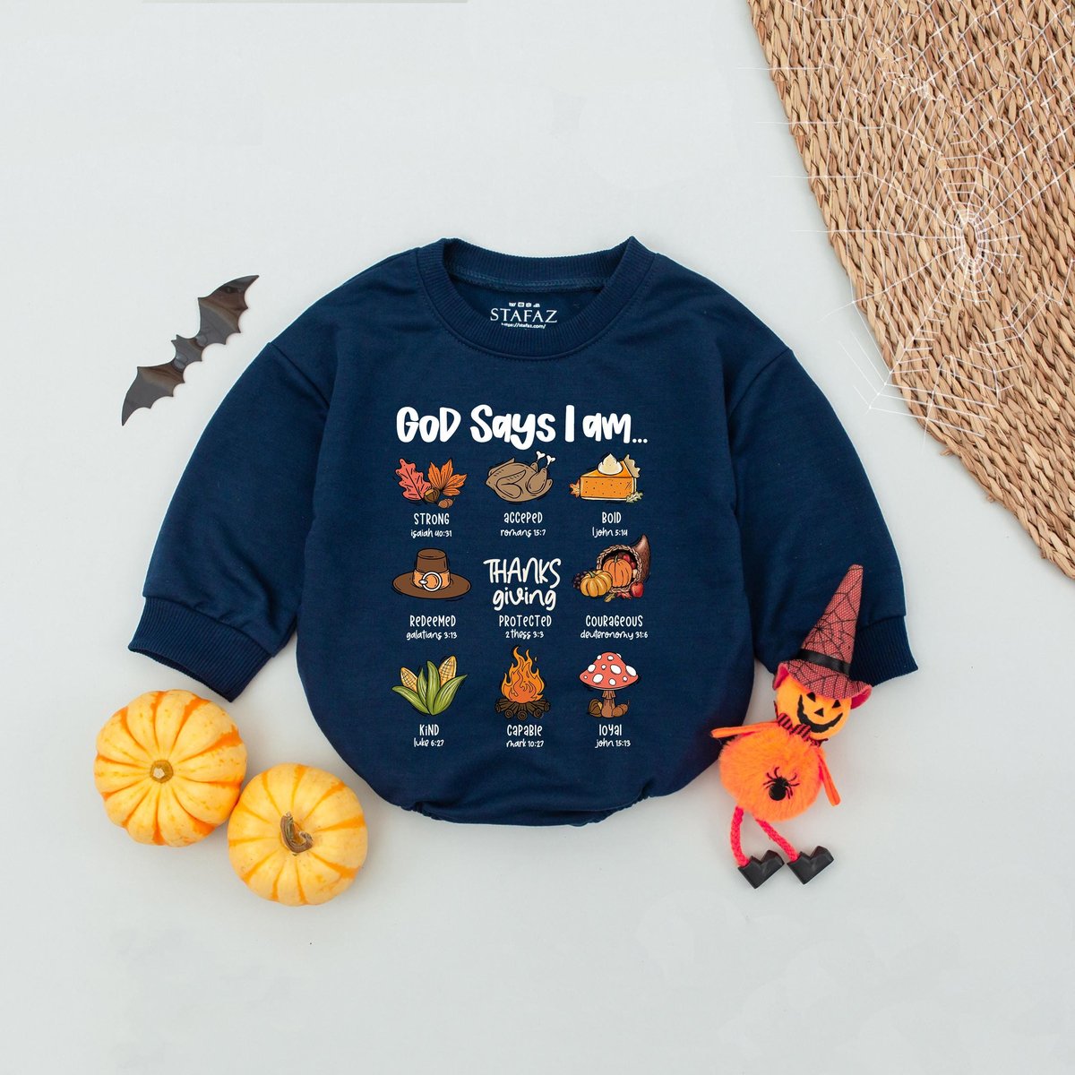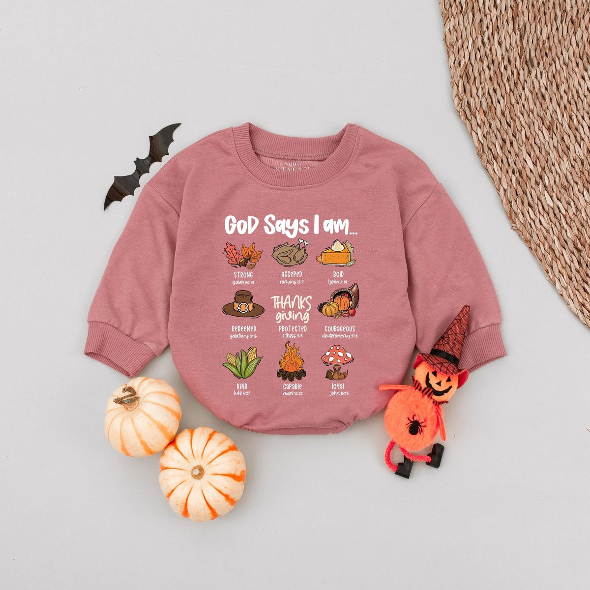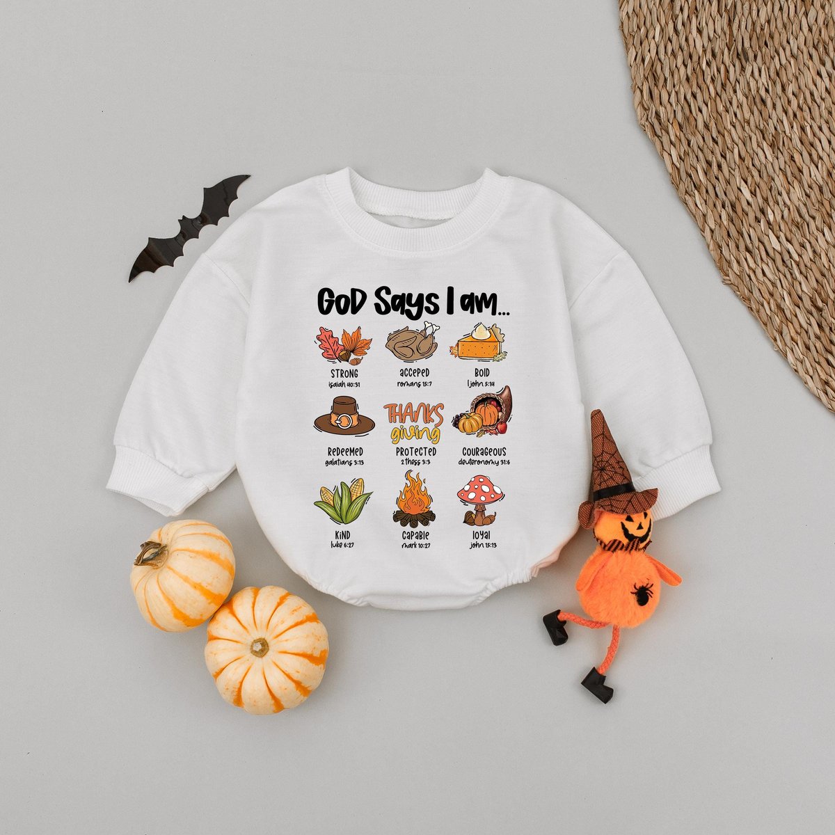God Says I Am Thanksgiving Baby Romper Little Pumpkin Bodysuit Thanksgiving Bubble Autumn Leaves Fal