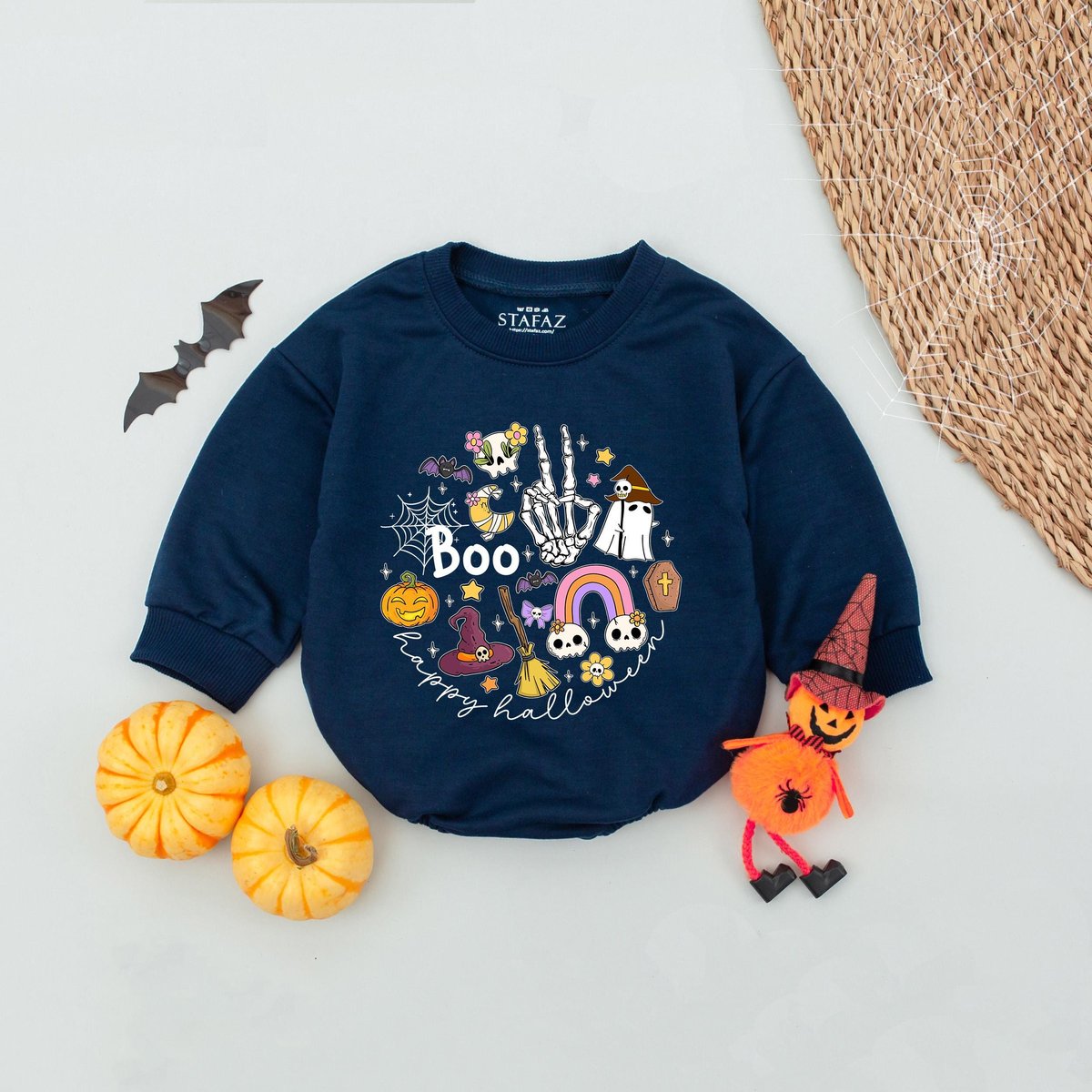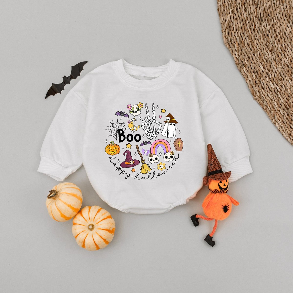 Happy Halloween Boo Bubble Romper for Baby Girls Boo Groovy Skeleton Peace Sign Babysuit Spooky Thin