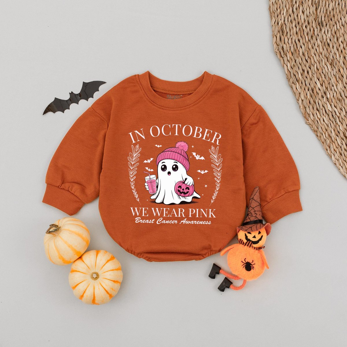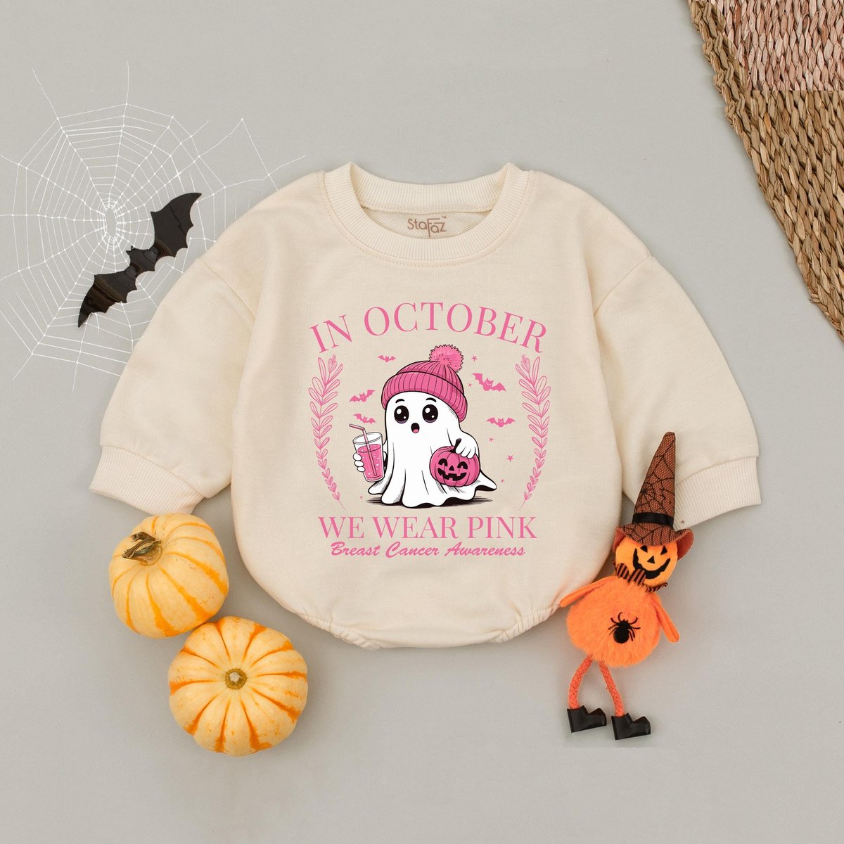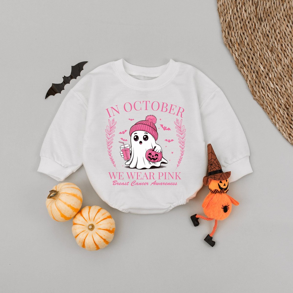 In October We Wear Pink Ghost Bubble Romper Breast Cancer Awareness Baby Romper Halloween Ghost Baby