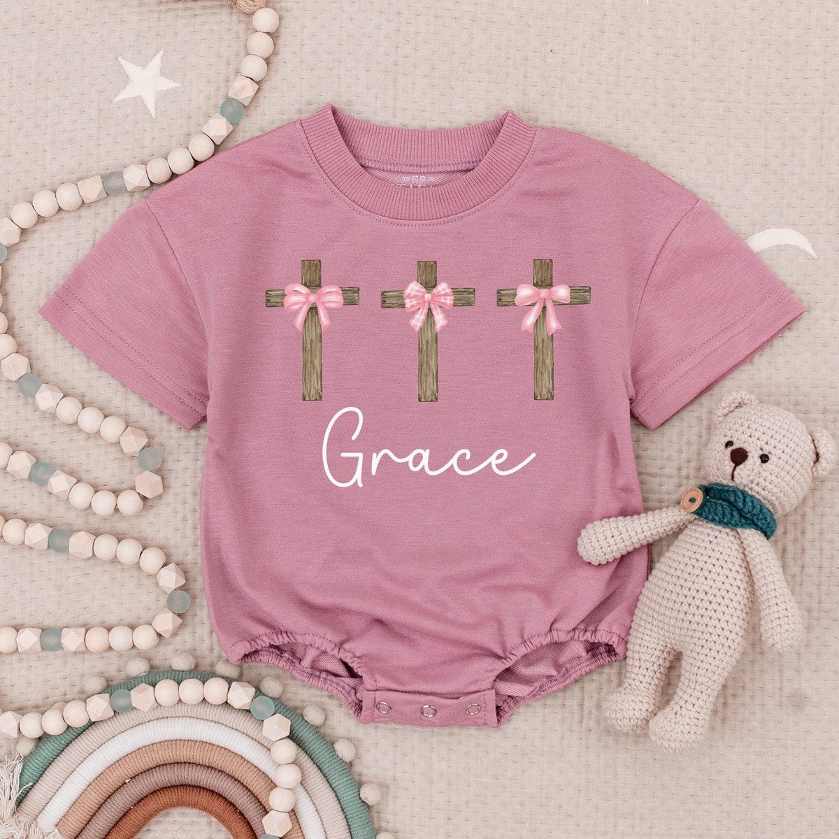 Personalized Girl Pink Easter Baby Romper Short Sleeves Jesus Bow Baby Bodysuit Christian Easter Rom