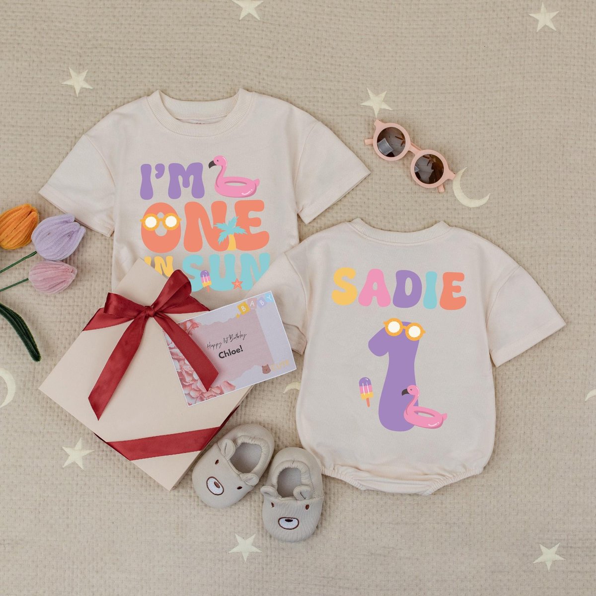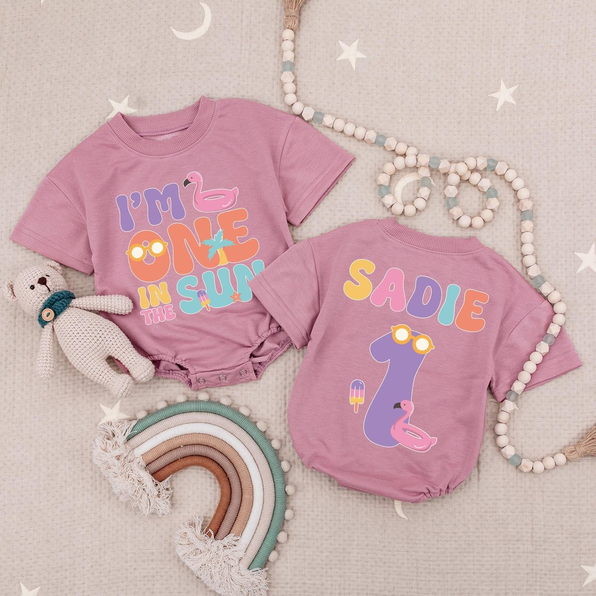 Personalized Name and Age One in the Sun Pool Party Birthday Girl Baby Romper Summer 1st Birthday Ba