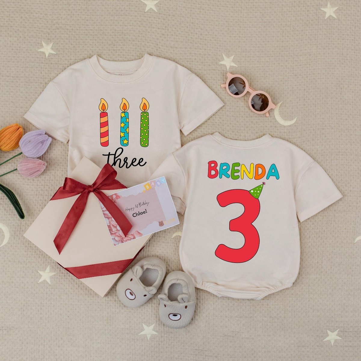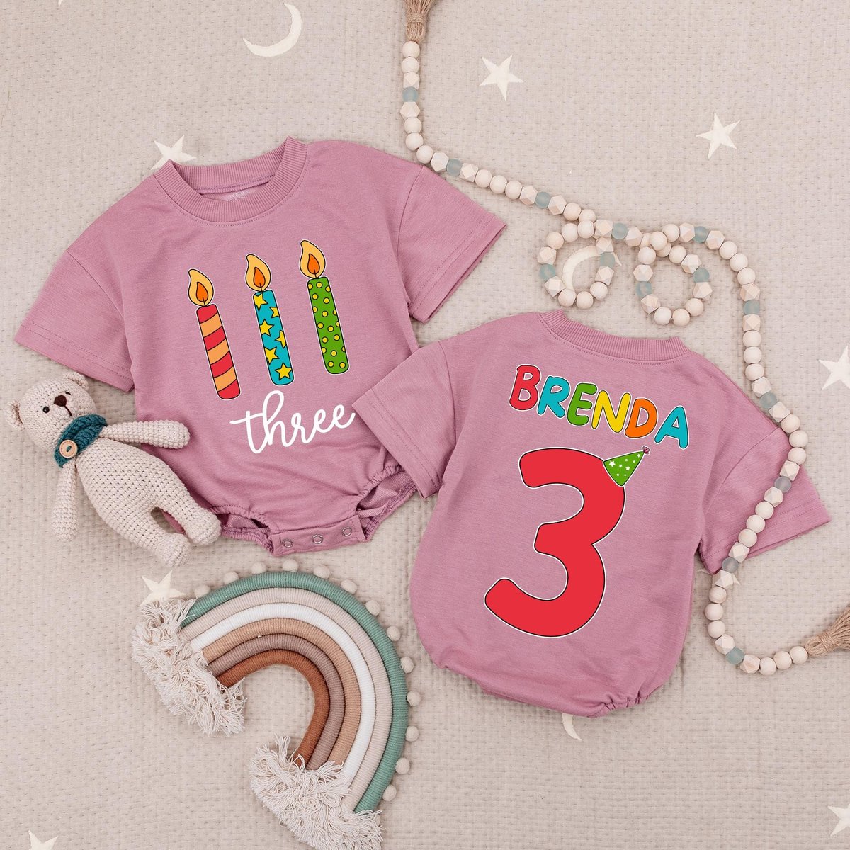 Personalized Name and Age Three Candle Baby Romper 3rd Birthday Kid Shirt Boy Girl Birthday Tee Turn