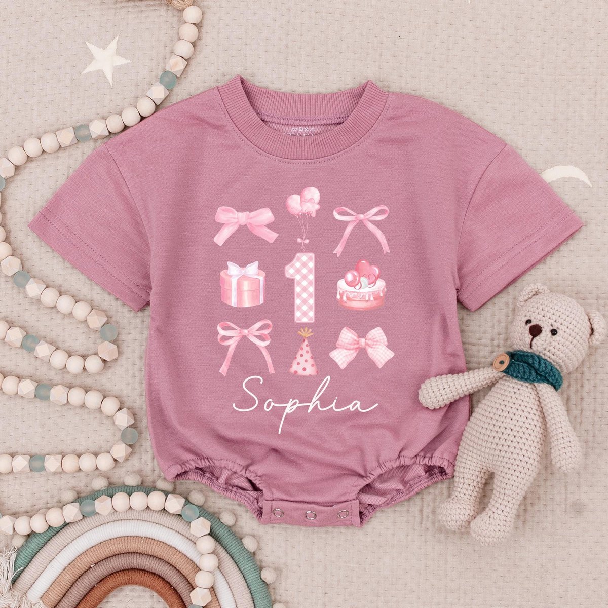 Personalized Name Cute Bow Birthday Baby Romper 1st Birthday Bodysuit For Baby Pink Bows Birthday Cu
