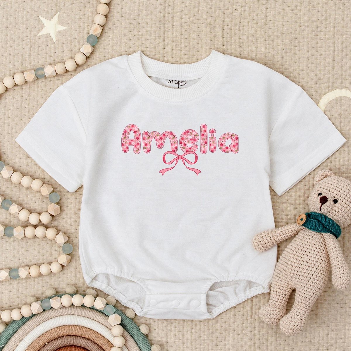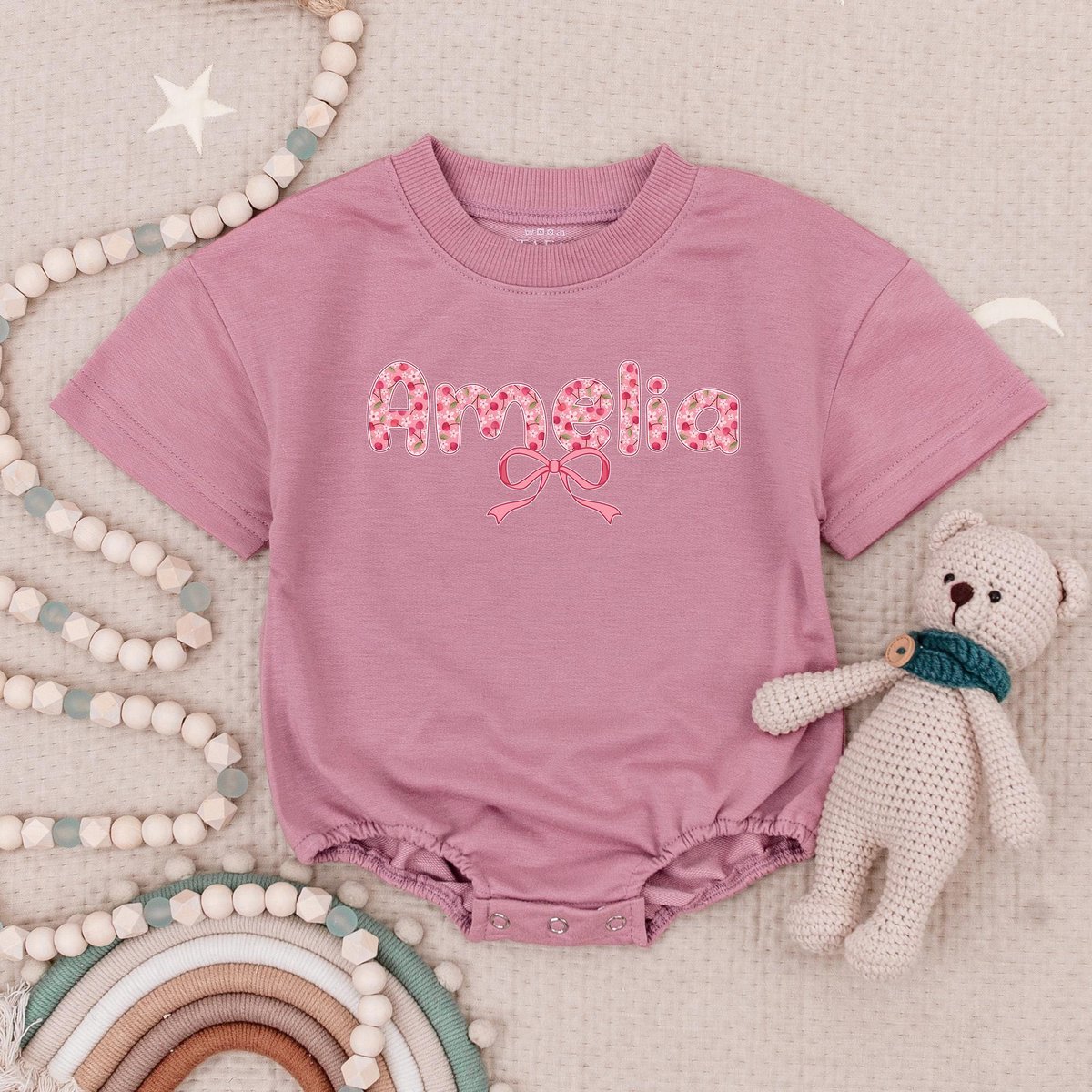 Personalized Name Pink Bow Baby Romper Short Sleeves Cute Bow Girl Baby Romper First Birthday Bodysu