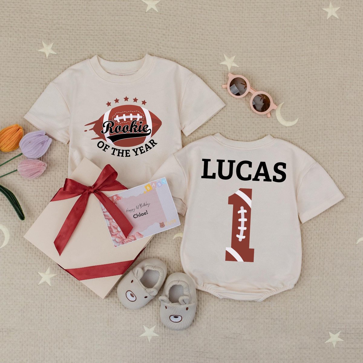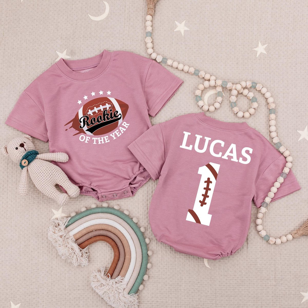 Personalized Name Rookie of the Year Baby Romper Custom Football Kids Shirt 1st Birthday Football Bu