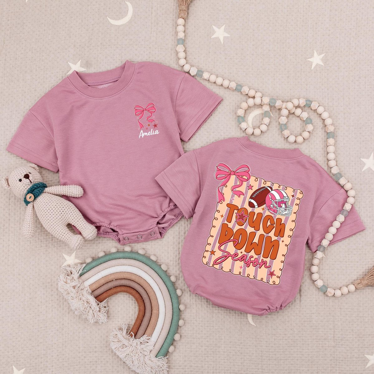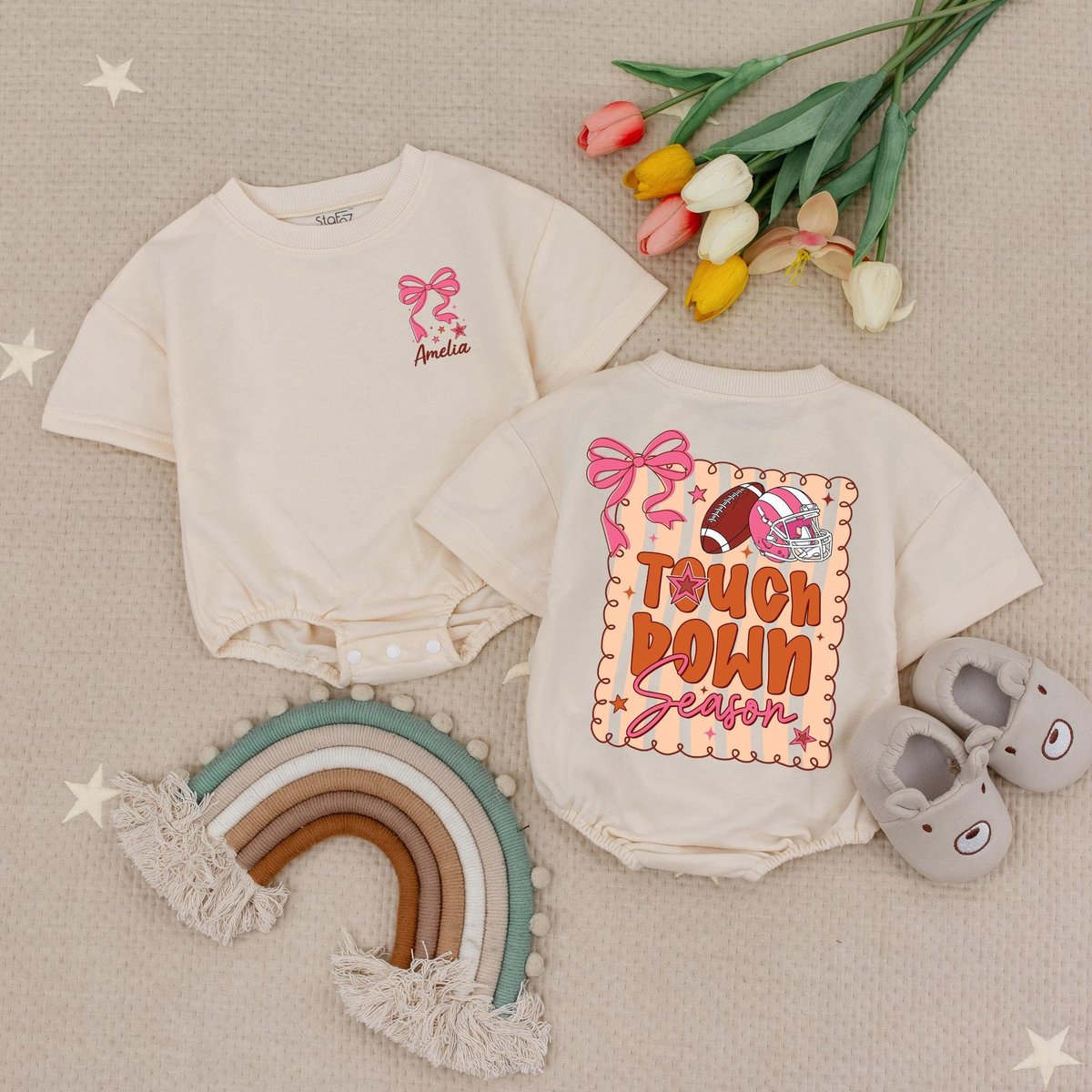 Personalized Name Touchdown Season Romper Custom Bow Football Baby Gift Football Mama Fall Football