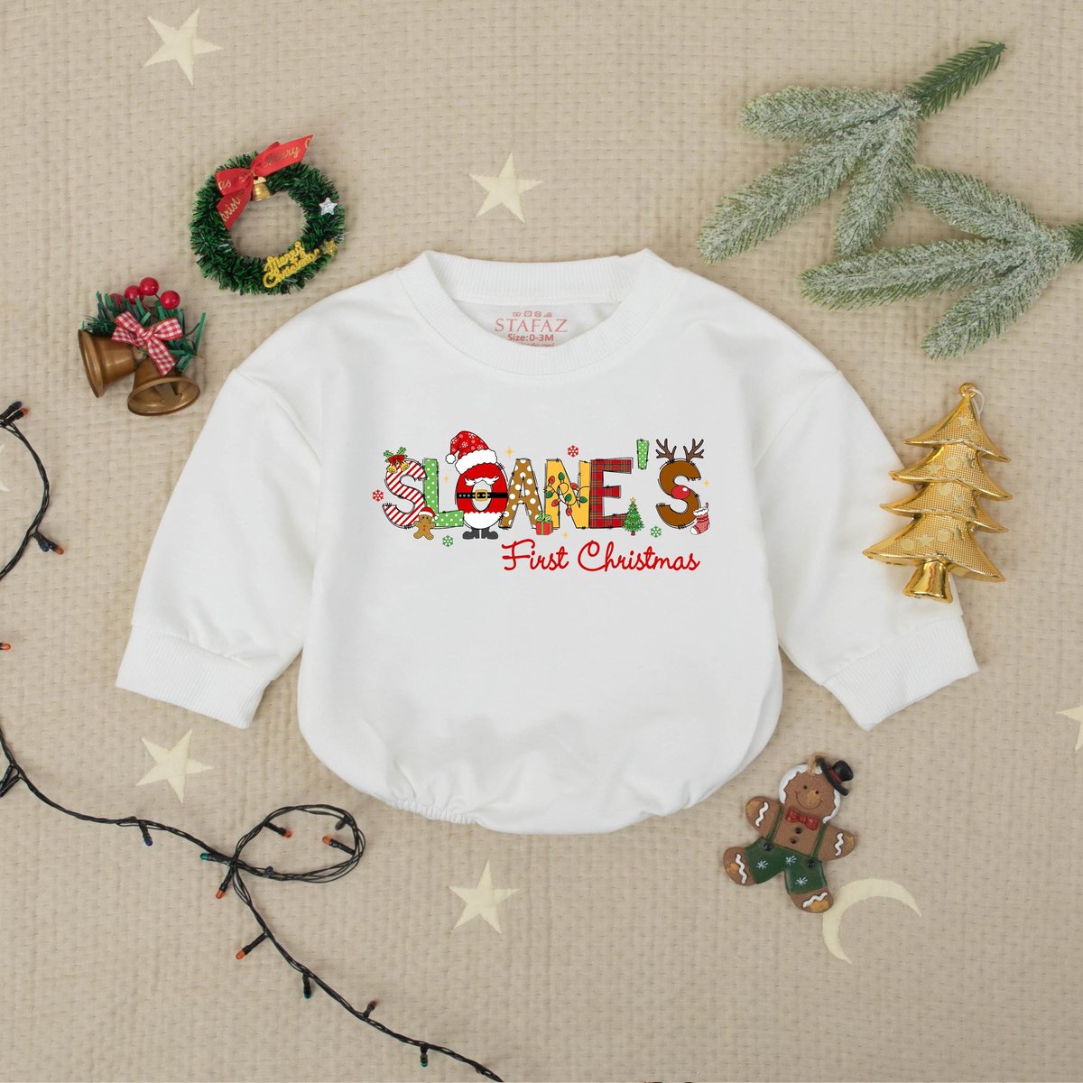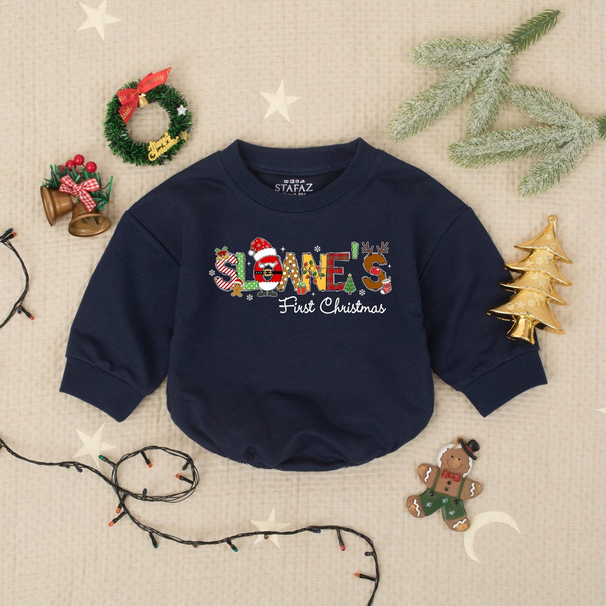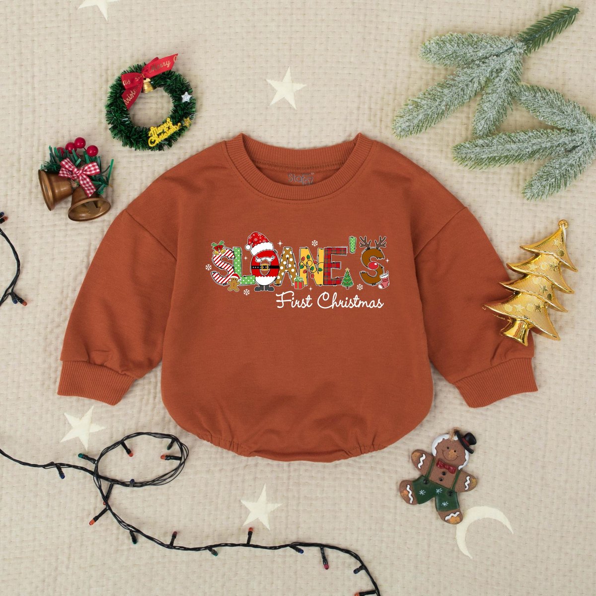 Personalized Name’s First Christmas Bubble Romper Custom Baby Xmas Outfit Newborn Xmas Bodysuit Cut