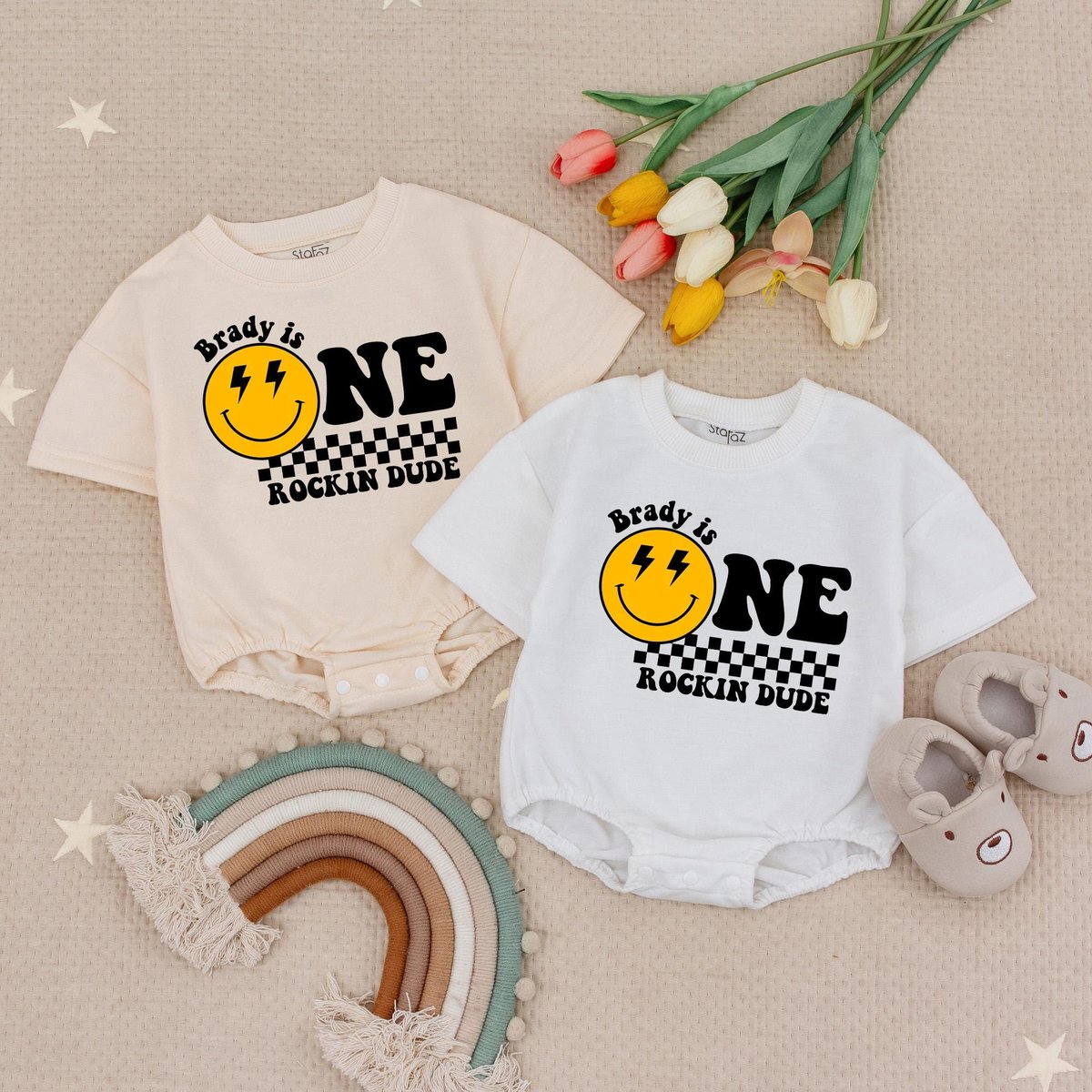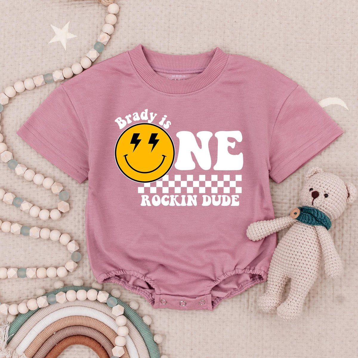 Personalized One Rockin Dude Birthday Baby Romper Smiley First Birthday Babysuit Custom Birthday Boy