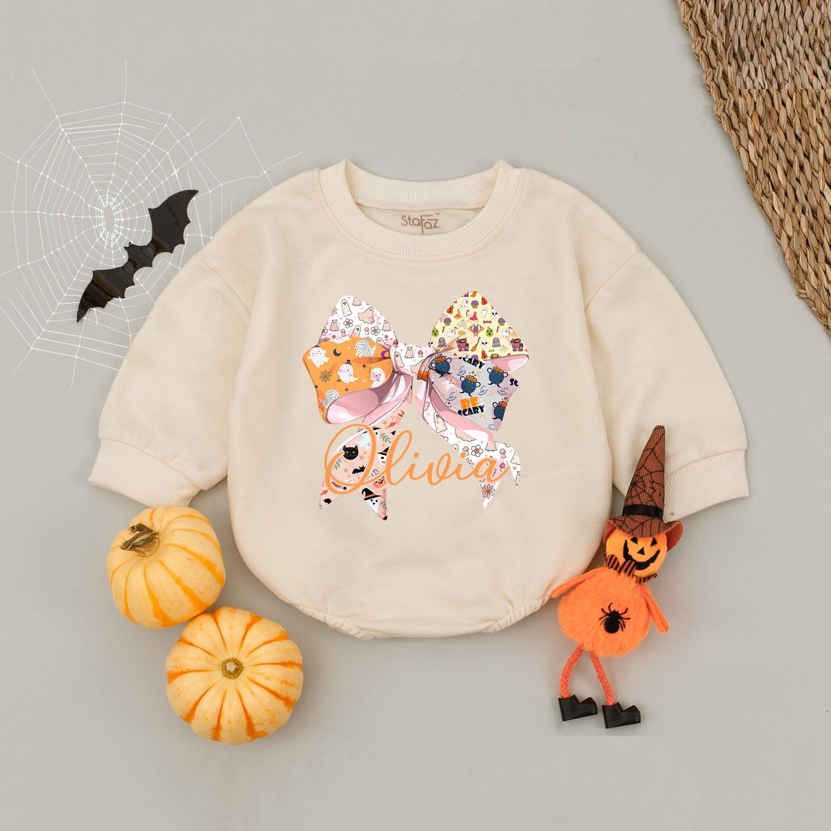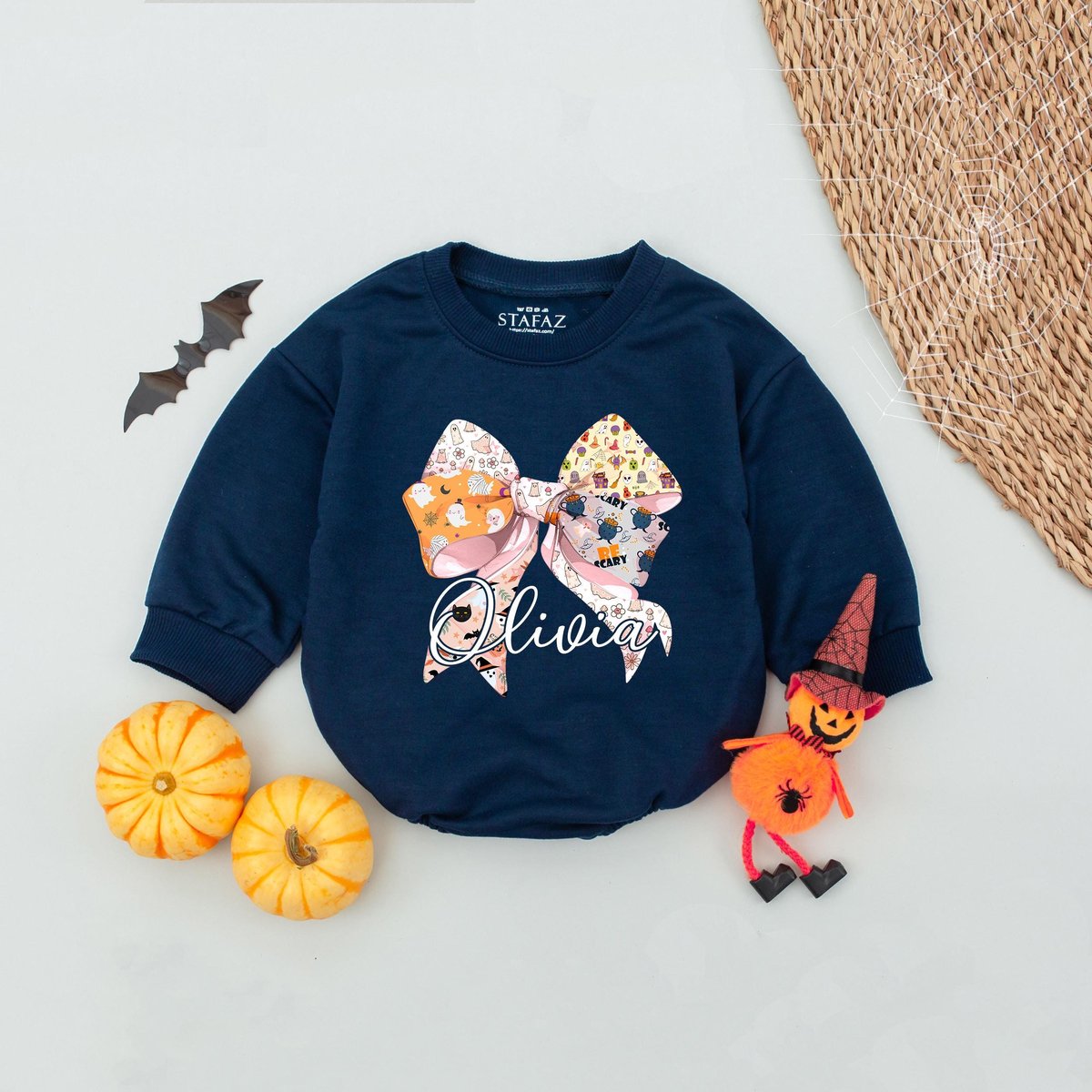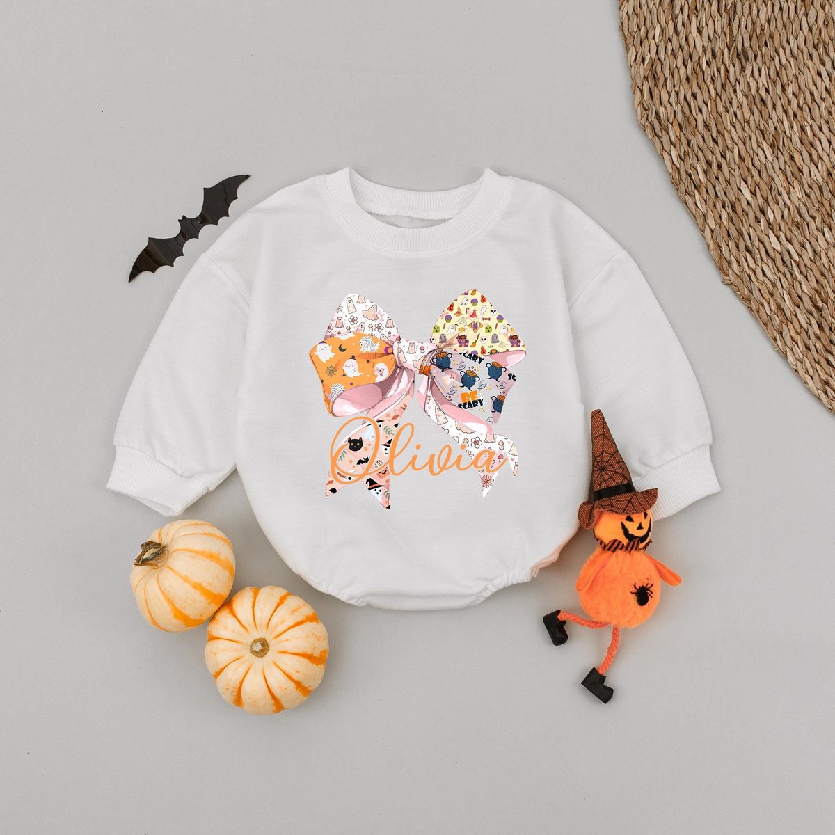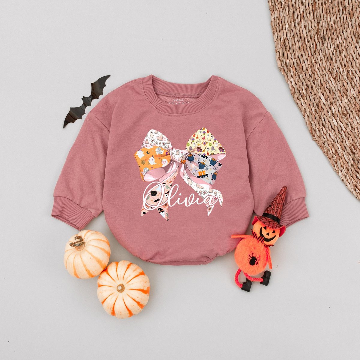 Personalized Pink Bow Baby Romper Sweater Custom Baby Name Halloween Romper Halloween Baby Romper Th