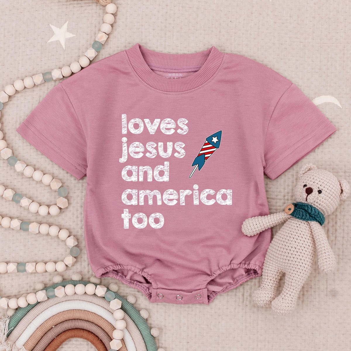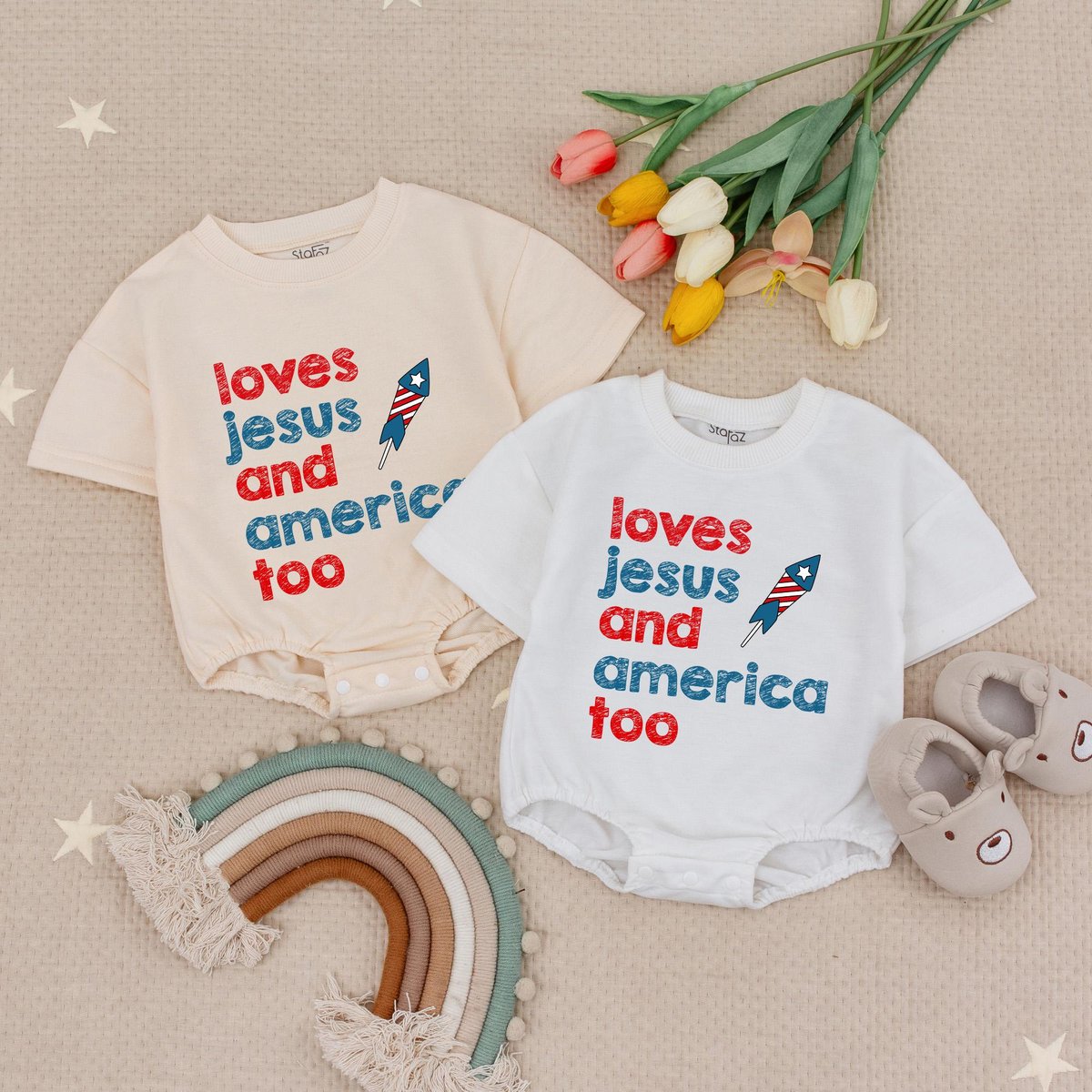 Retro USA Babysuit She Loves Jesus And America Too Baby Romper Patriotic Religious Bodysuit Christia