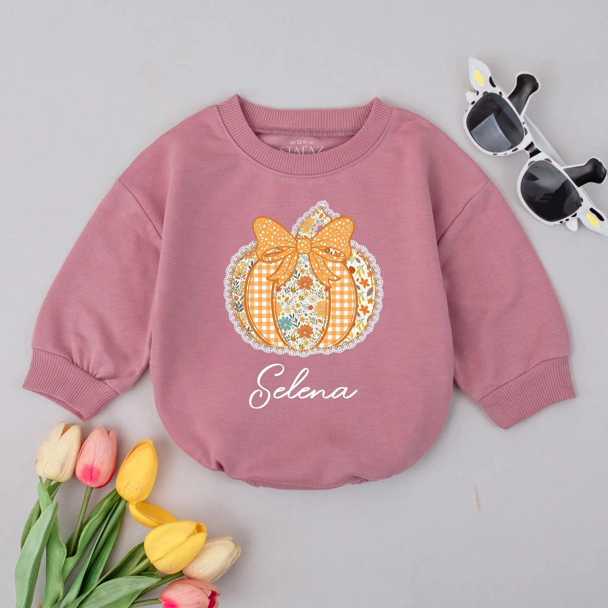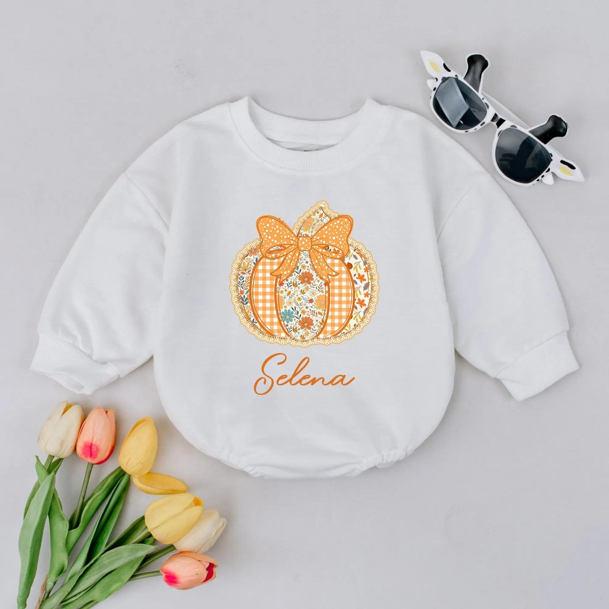 Custom Name Pumpkin Bubble Romper Floral Pumpkin Bodysuit First Thanksgiving Outfit Fall Baby Shower 437