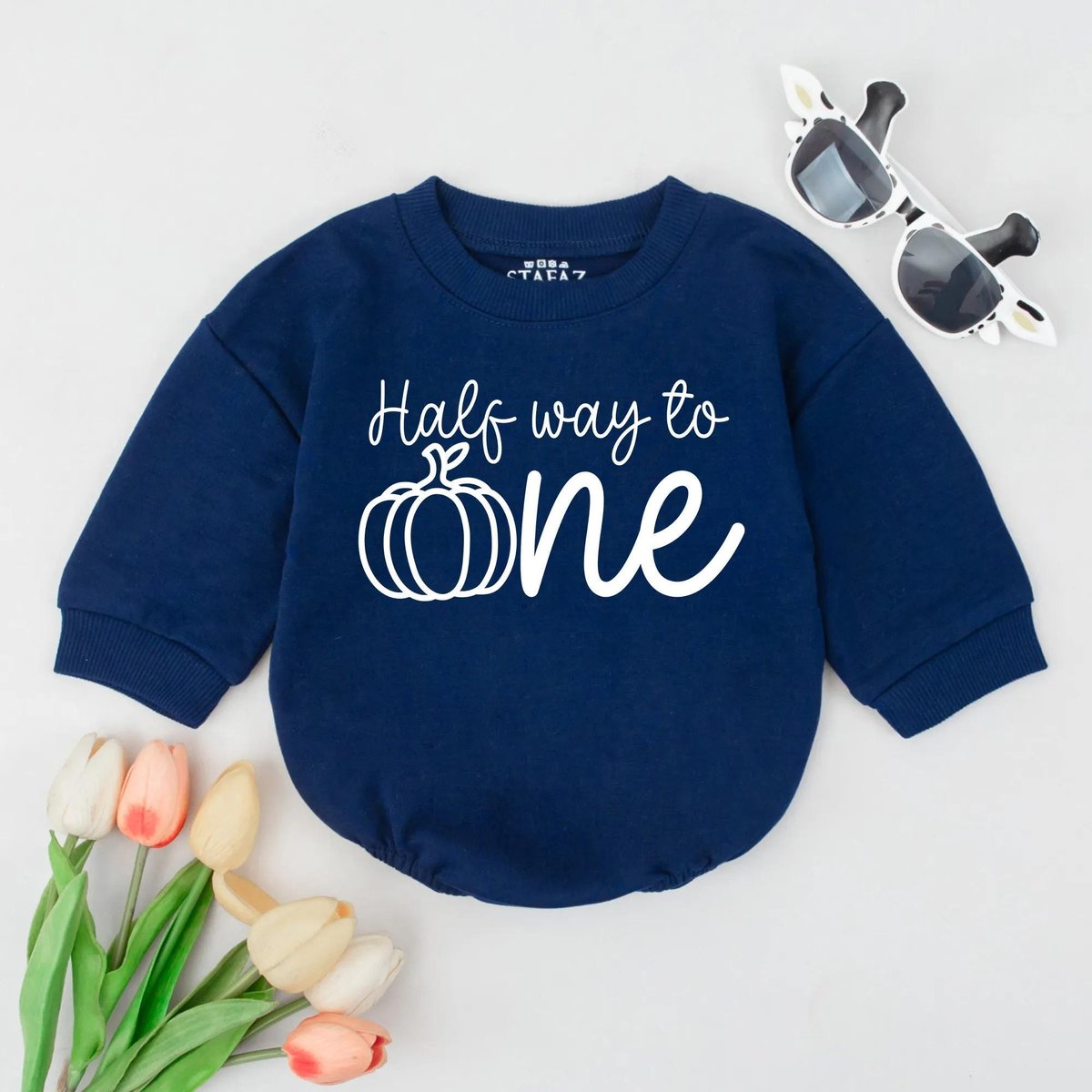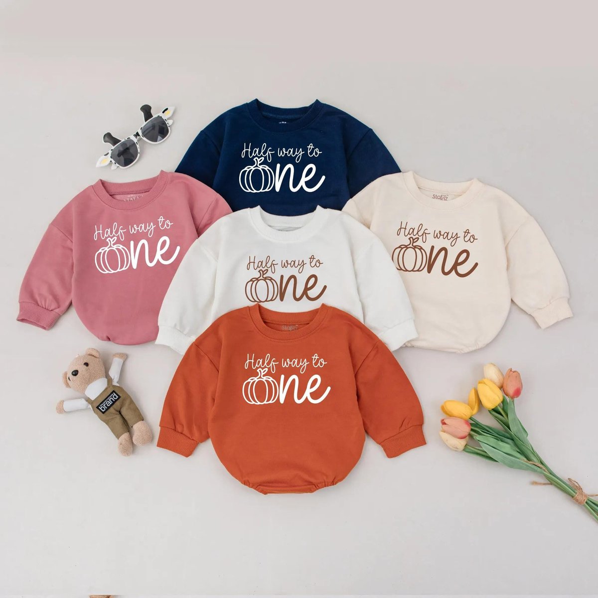 Half Way to One Pumpkin Romper Baby girl pumpkin half birthday outfit burnt orange baby romper Thank 435