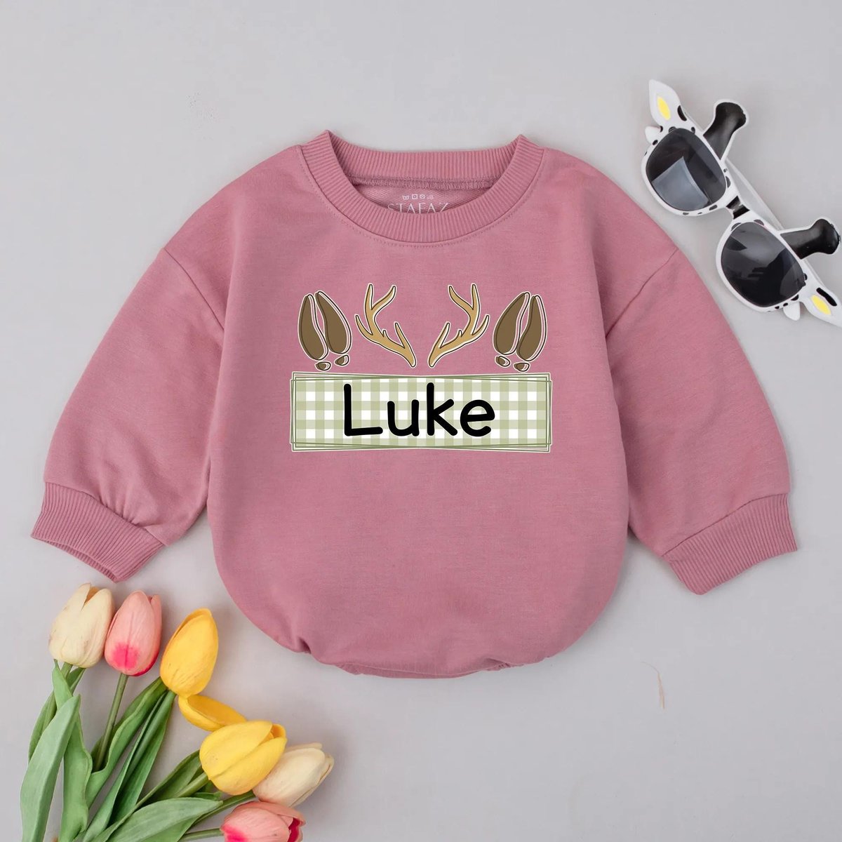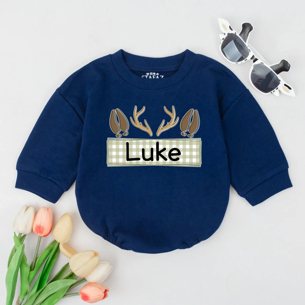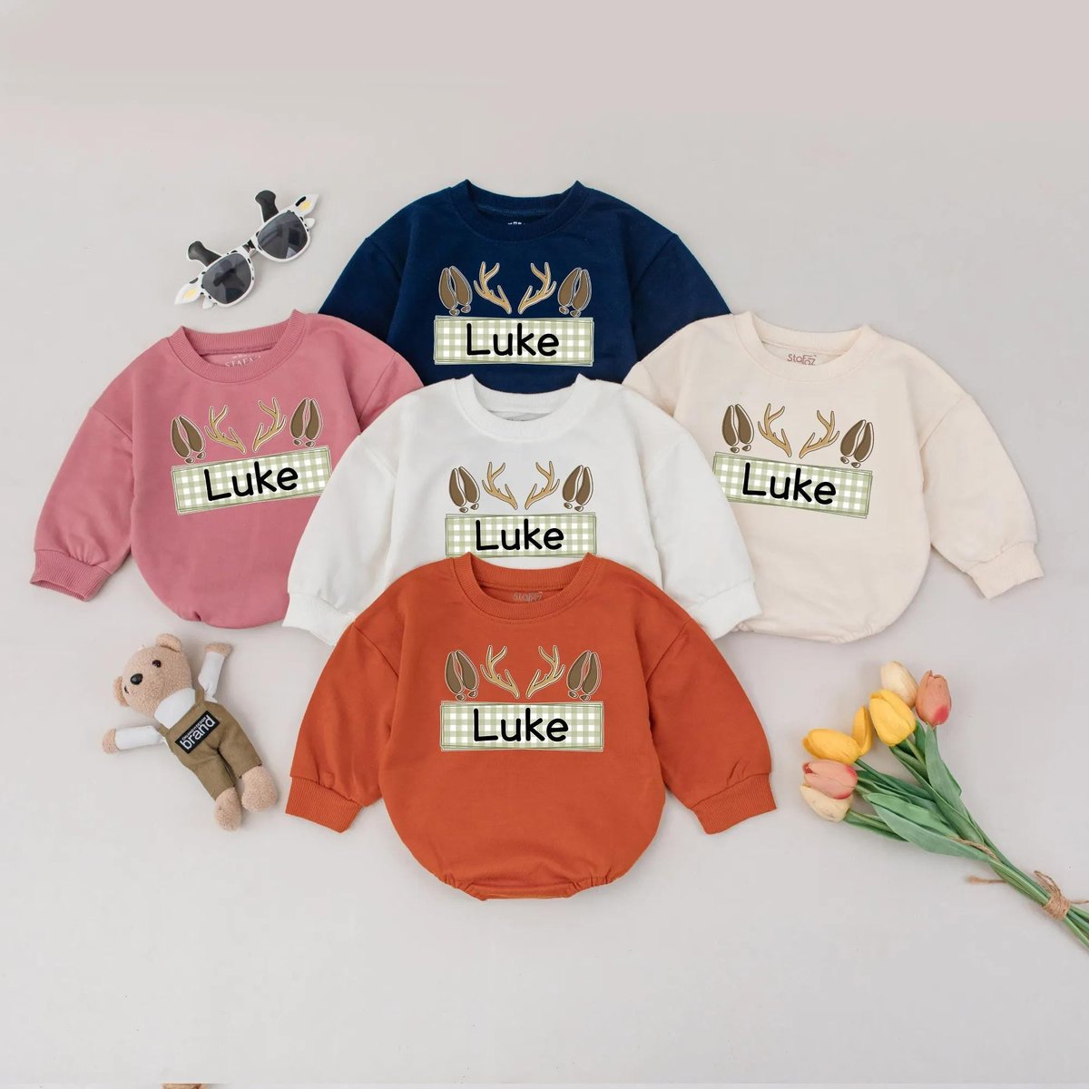 Personalized Baby Bubble Romper Custom Name Fall Outfit Hunting Baby Clothes Neutral Antler Baby Boy 433