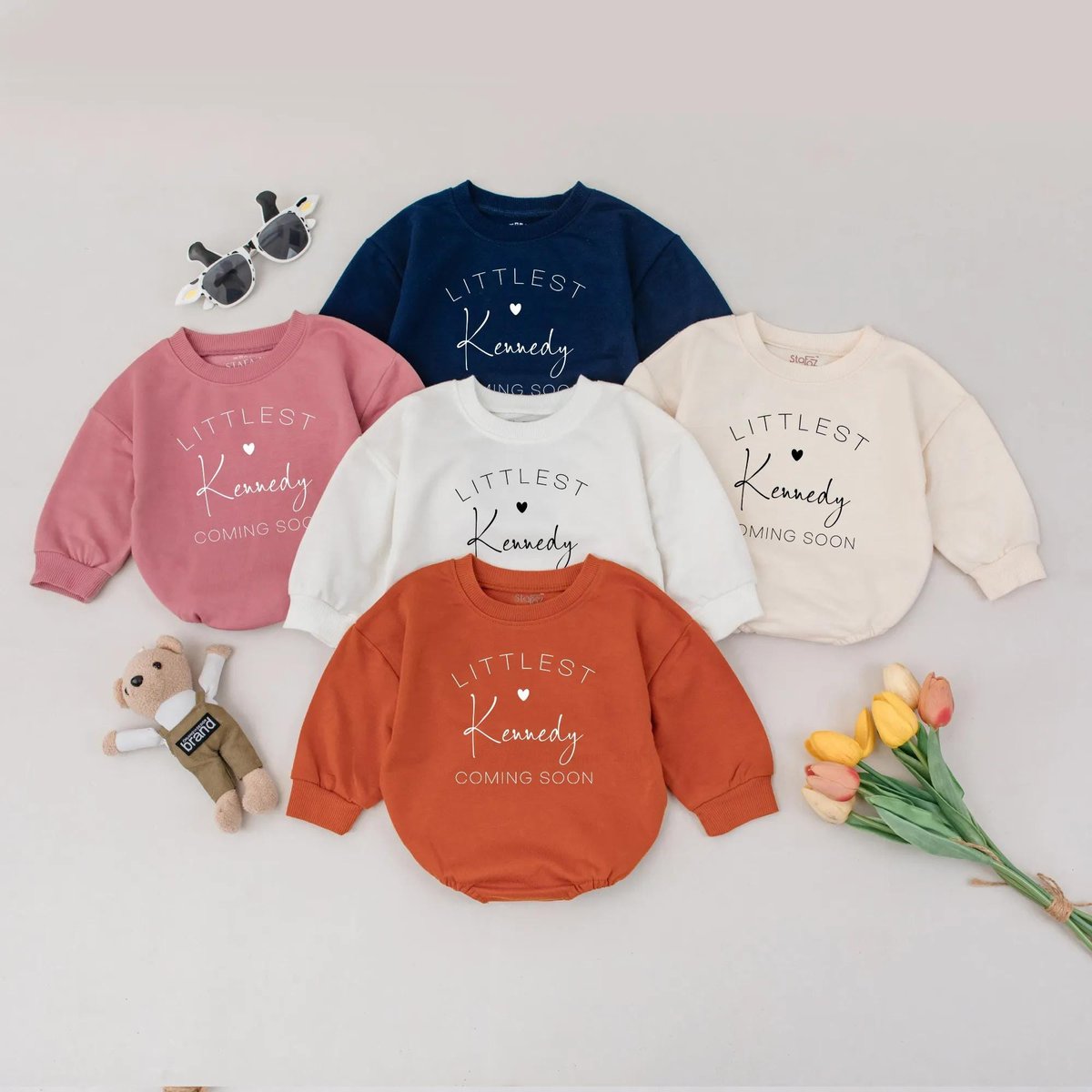 Personalized Littlest Baby Coming Soon Romper Pregnancy Announcement Outfit Custom Baby Name Reveal 431