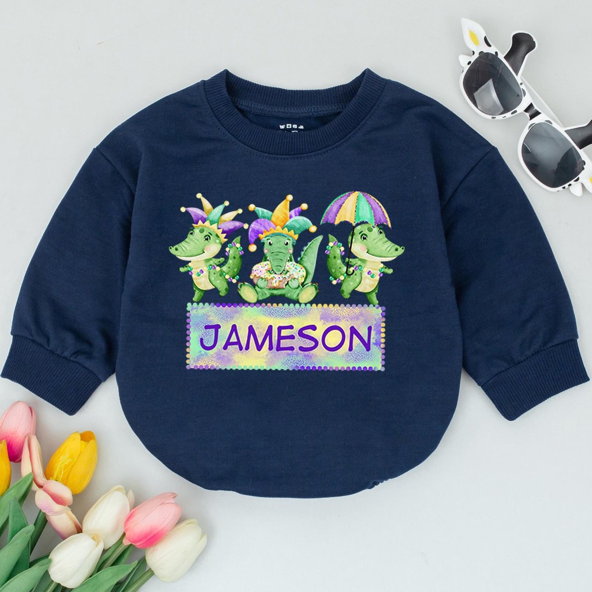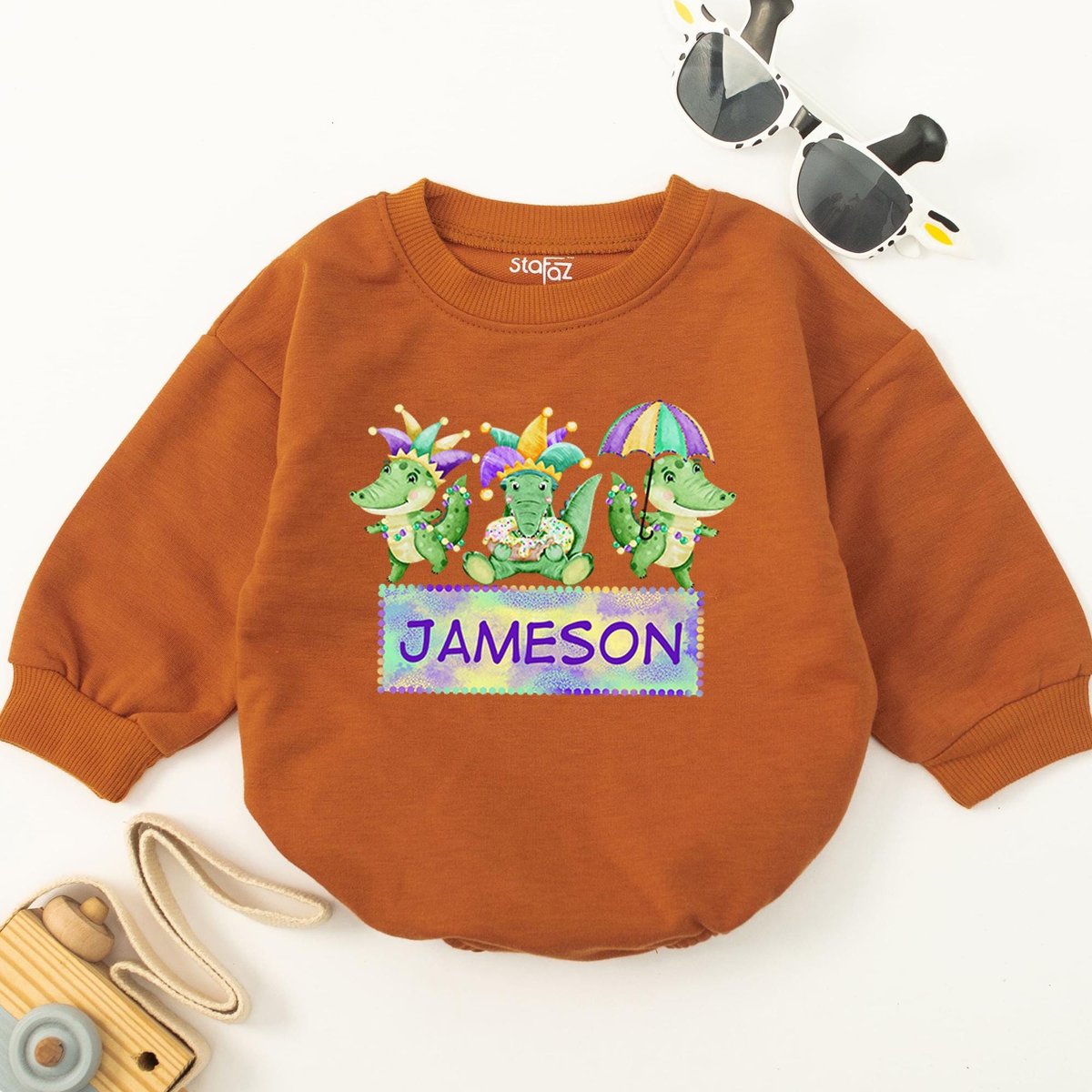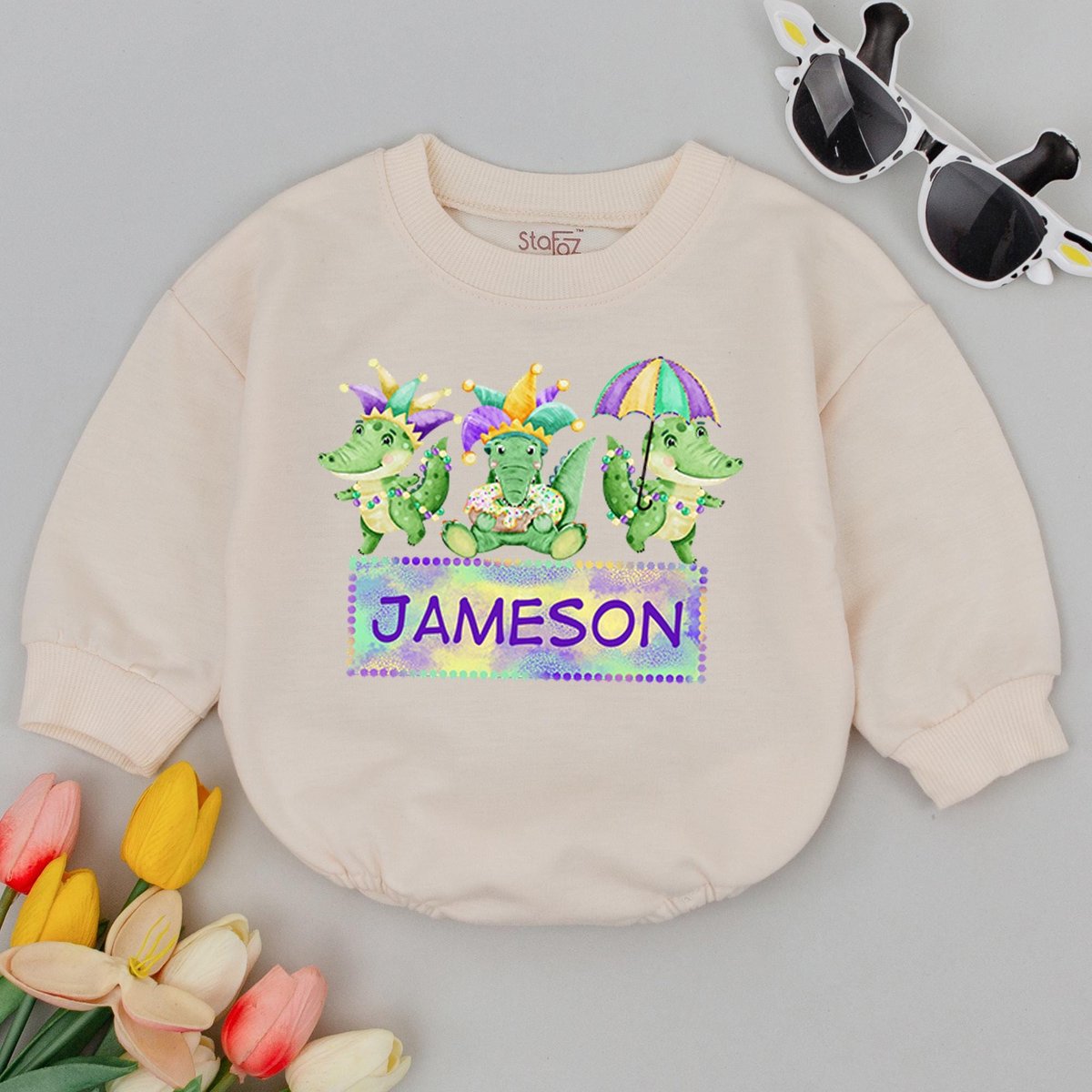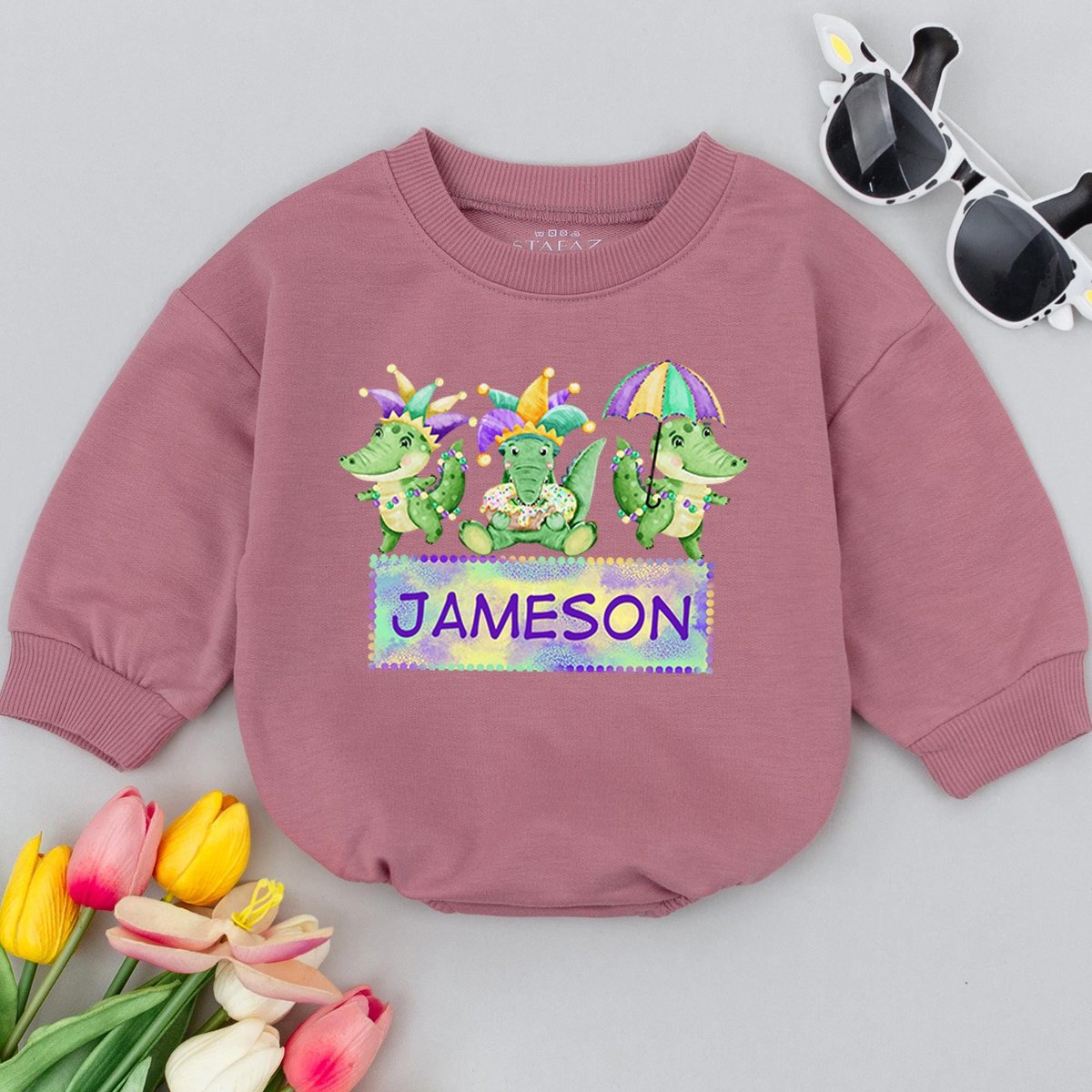 Personalized MardiGras Three Alligators Baby Romper Baby Announcement Clothes Baby Carnival Outfit 1 184