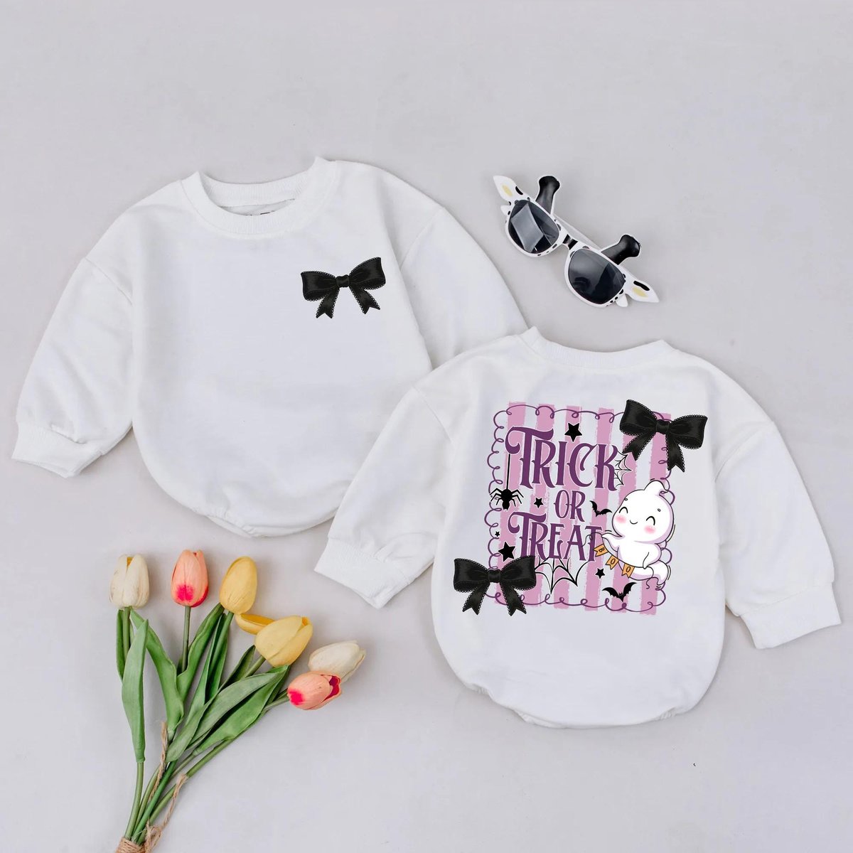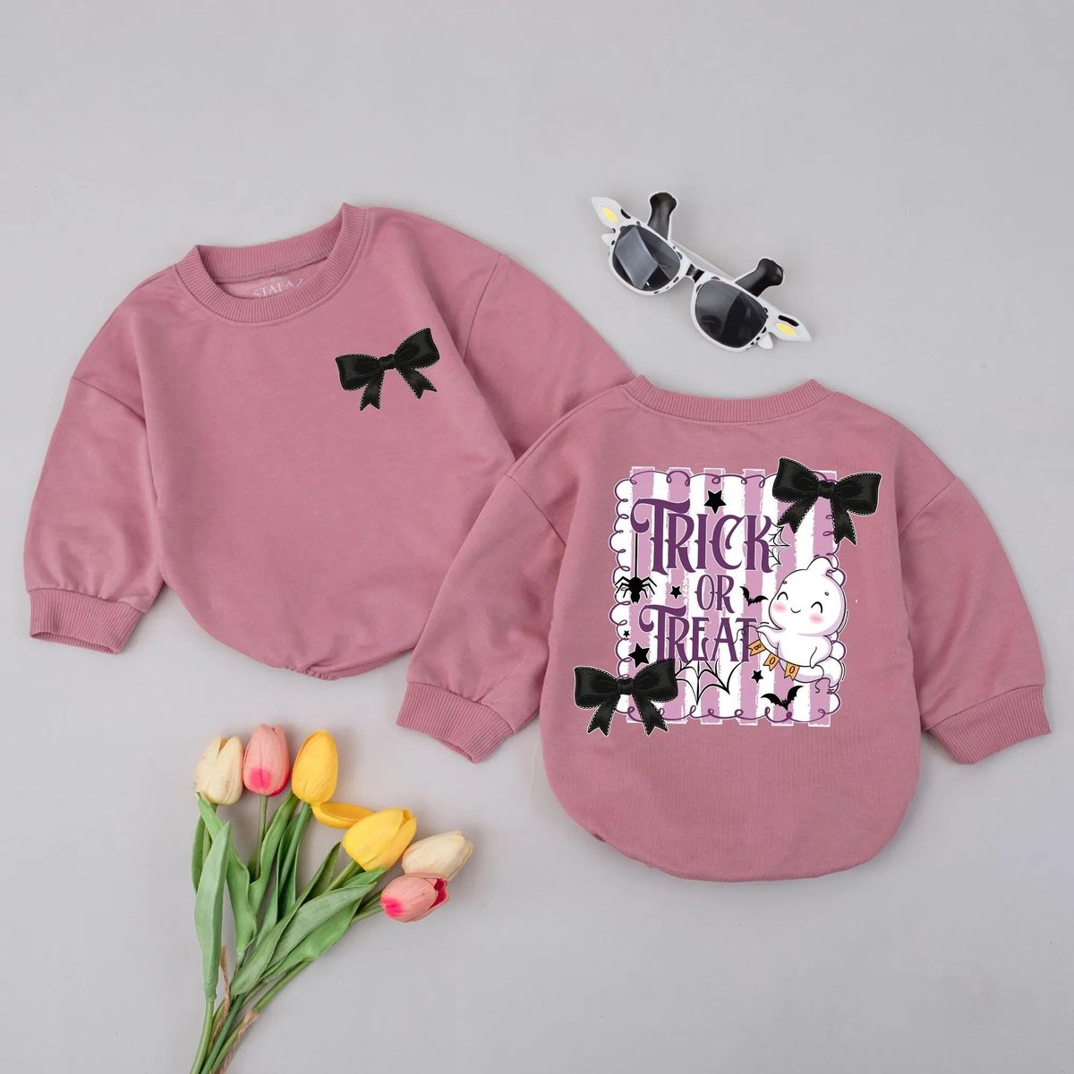 Trick or Treat Baby Bubble Romper Cute Halloween Girl Outfit Pastel Goth Baby Romper Black Bow Spook 433