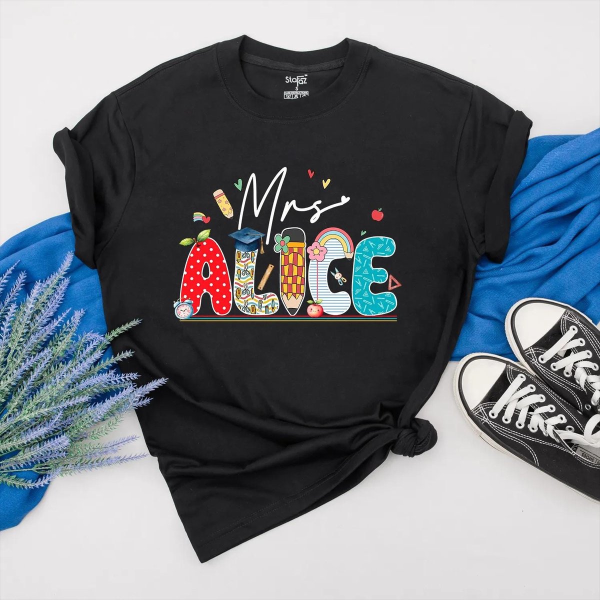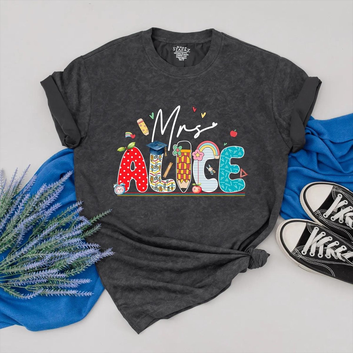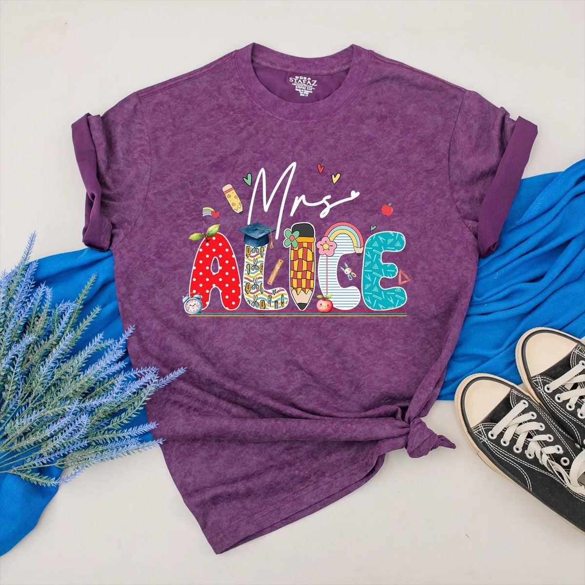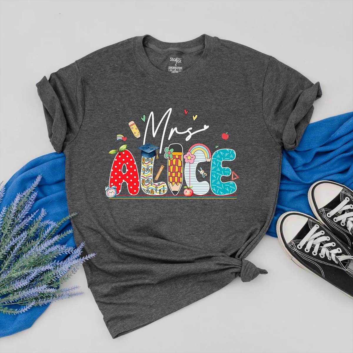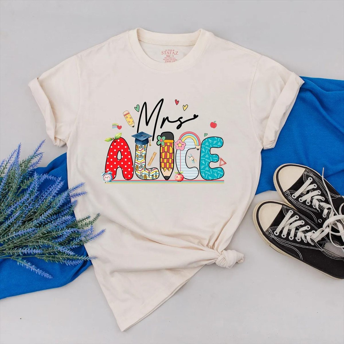Custom Teacher Name Shirt Personalized Teacher Appreciation School Icon and Colorful Name Outfit Bac 431