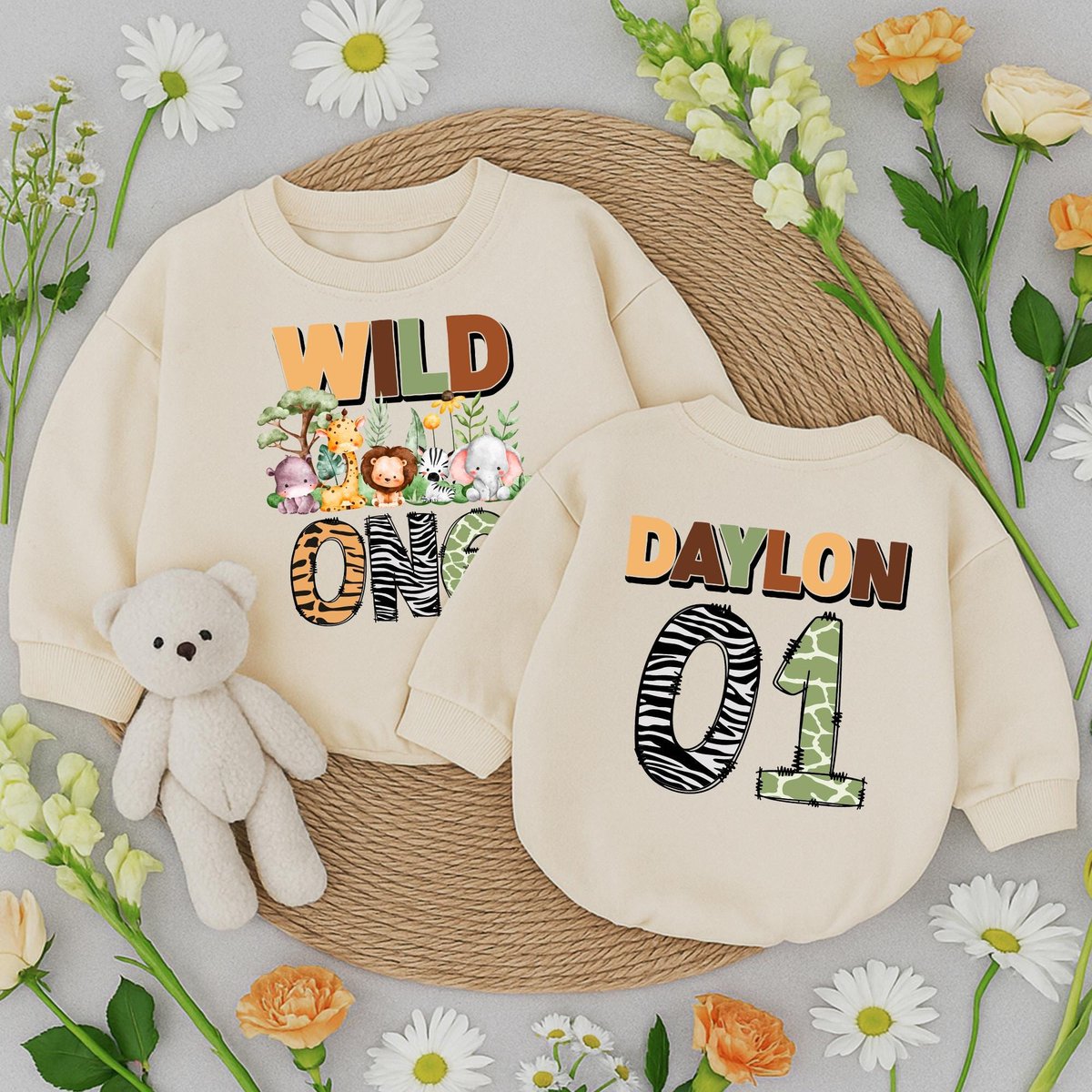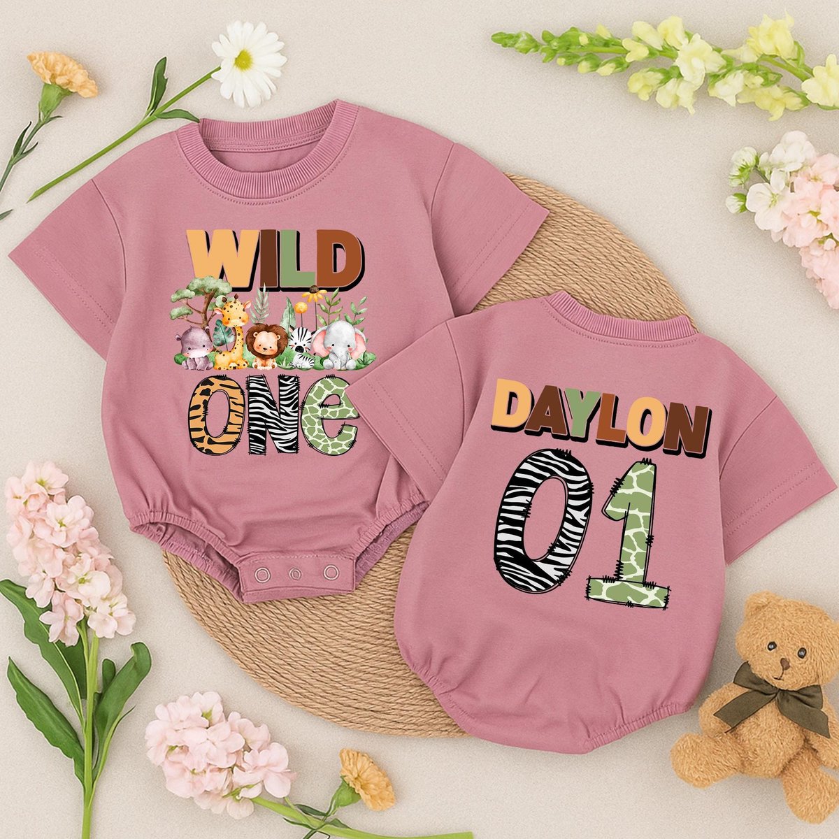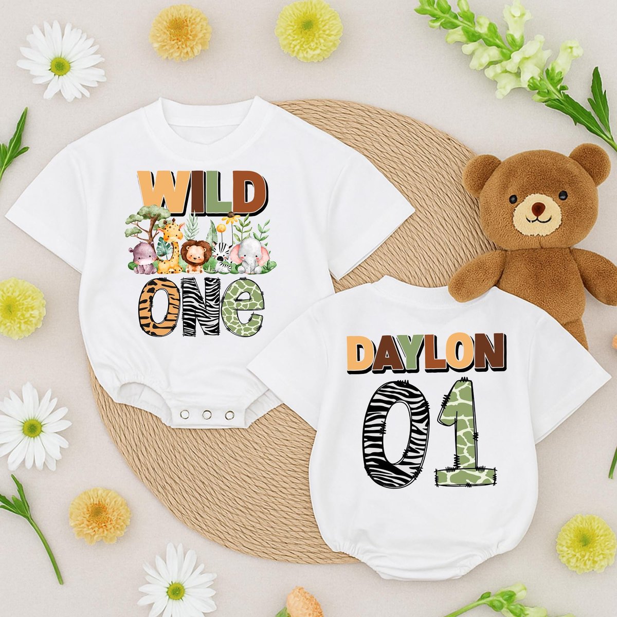 Birthday Safari Baby romper personalized Outfit with name number Wild One toddler romper jungle anim 433