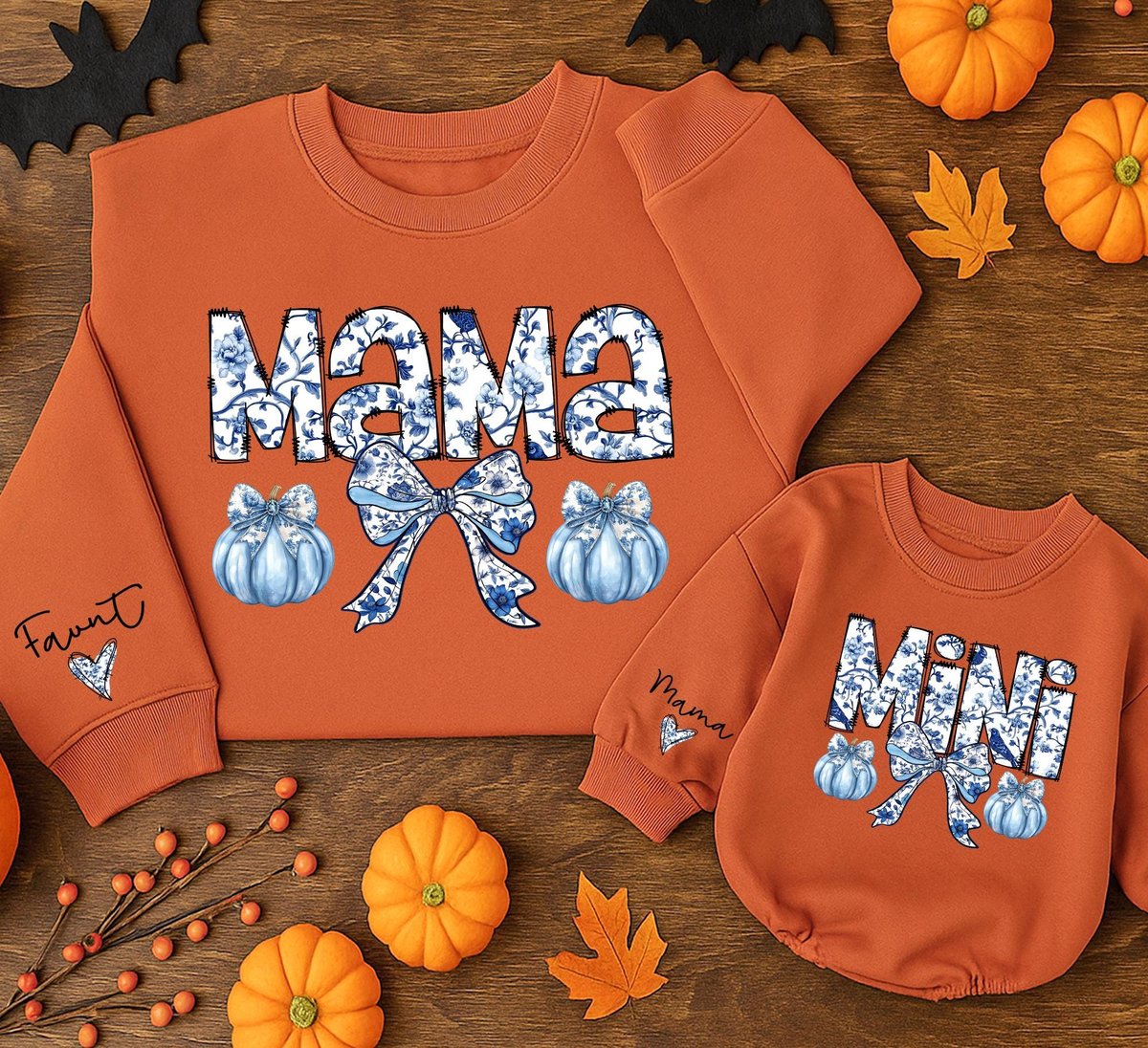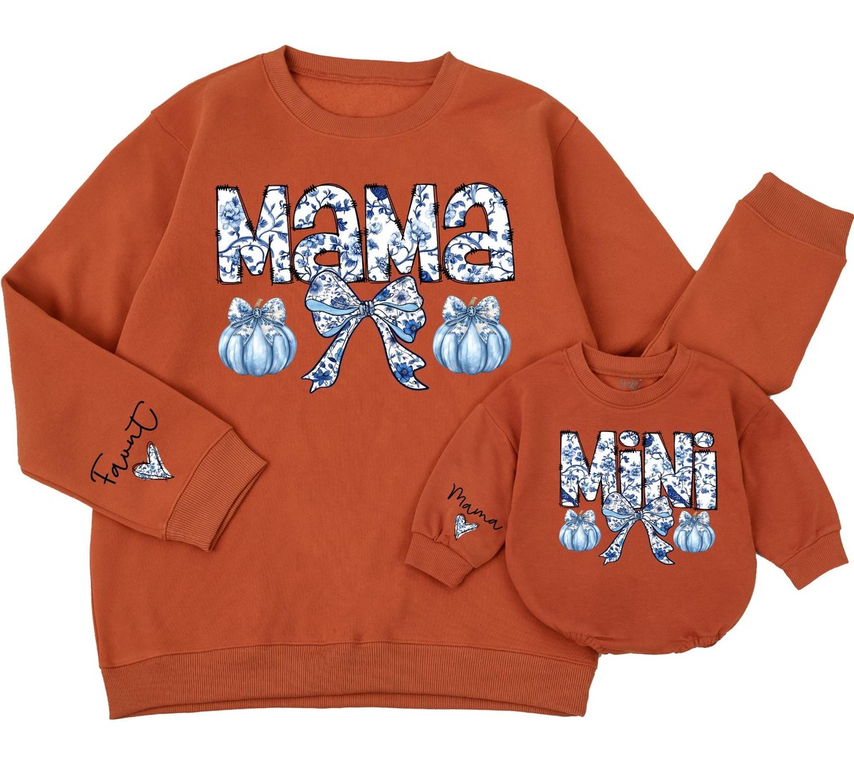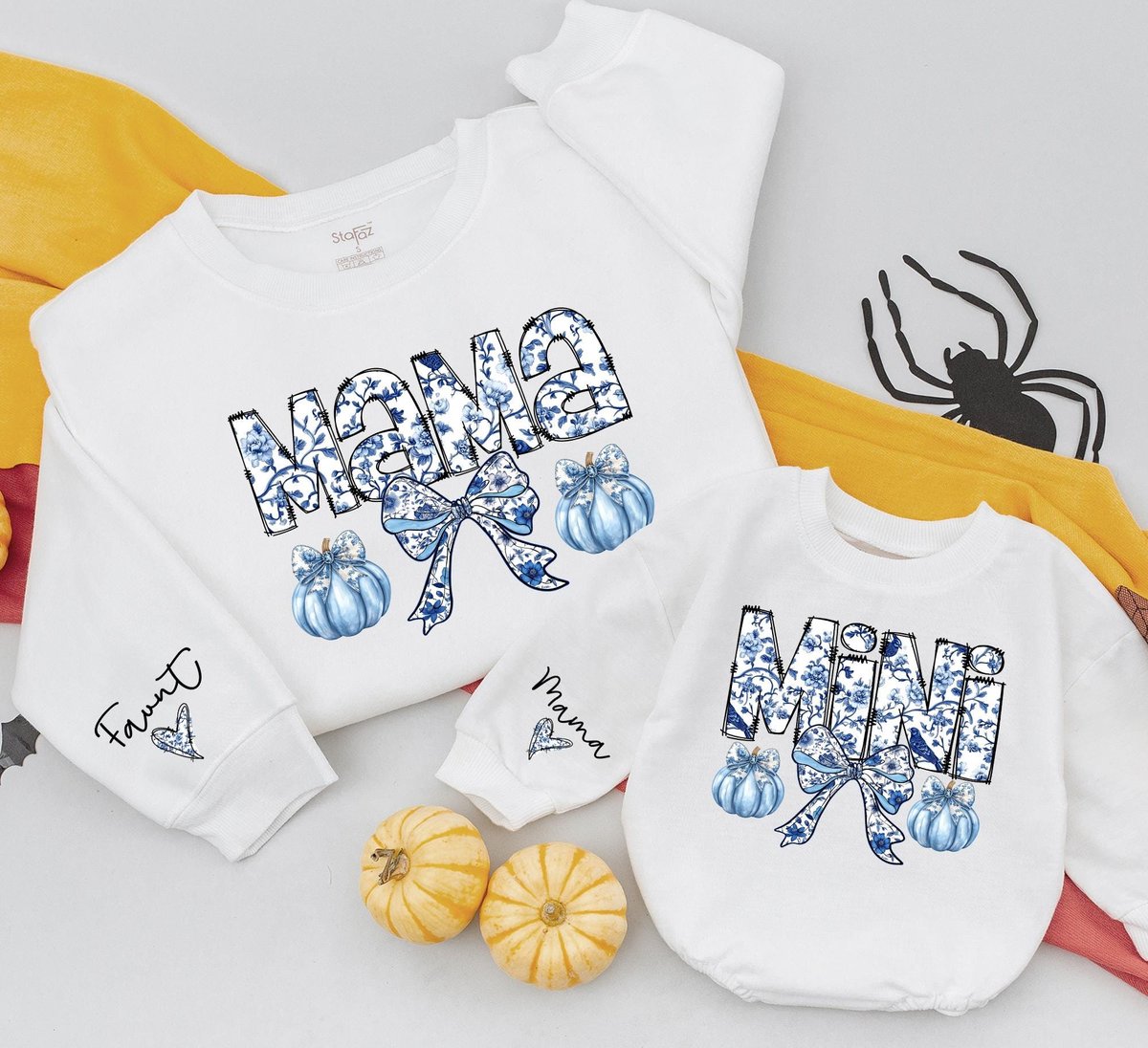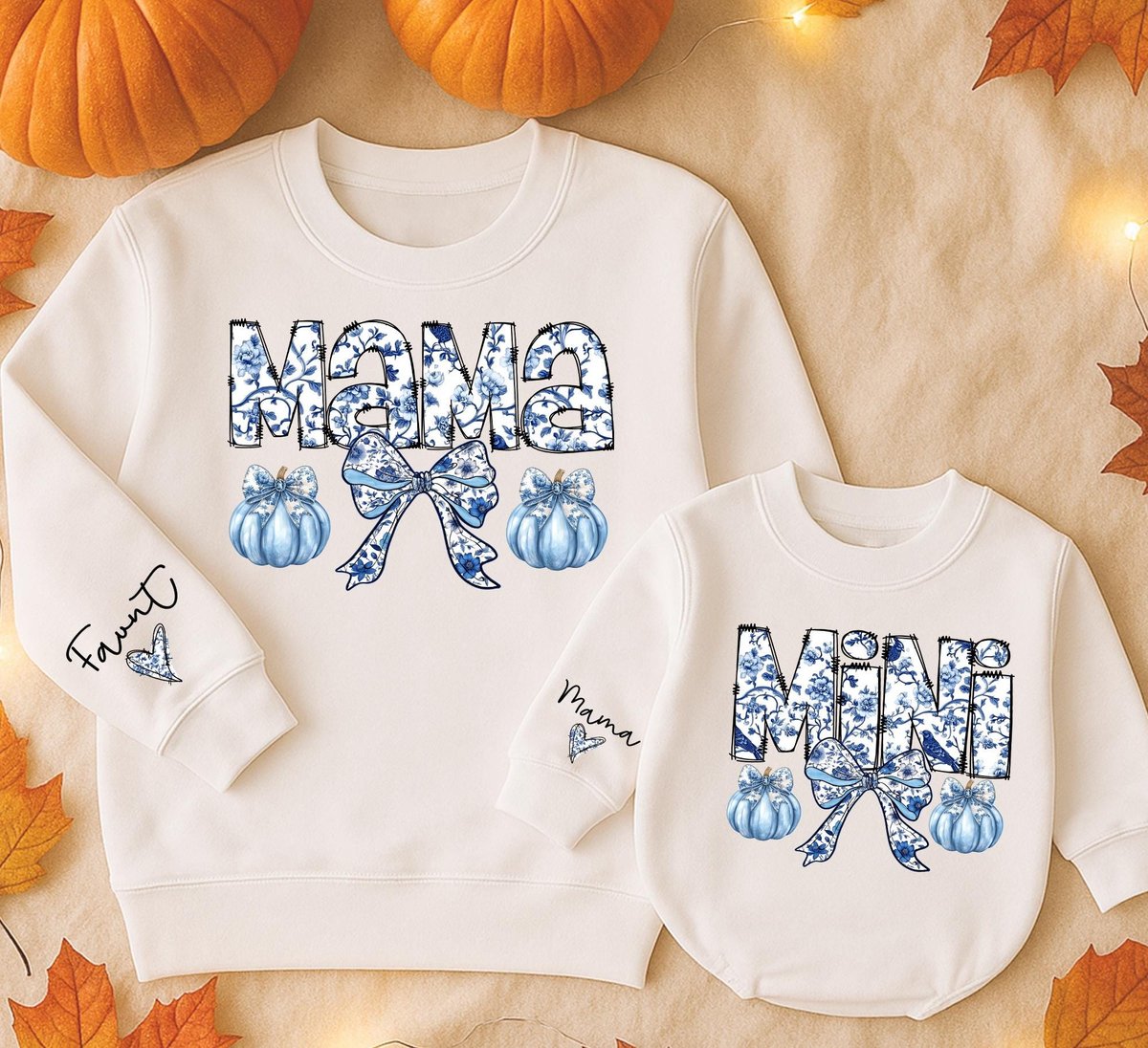 Mama And Mini Chinoiserie Sweatshirts Mama Girl Mom And Baby Matching Outfit Fall Sweater Blue Ribbo 435