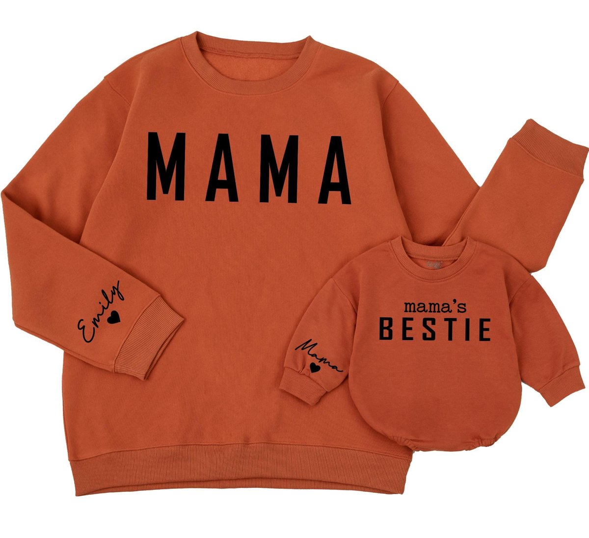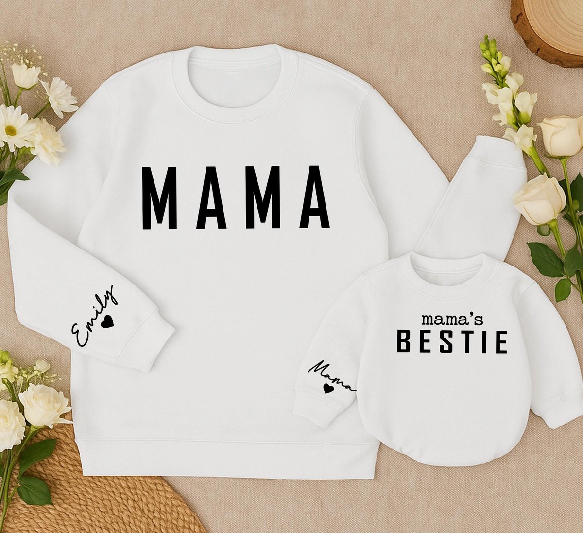 Personalized Mama and Bestie Sweatshirt with Name On Sleeve Custom mama Shirt Baby Romper Matching F 433