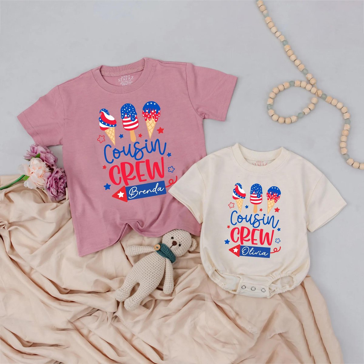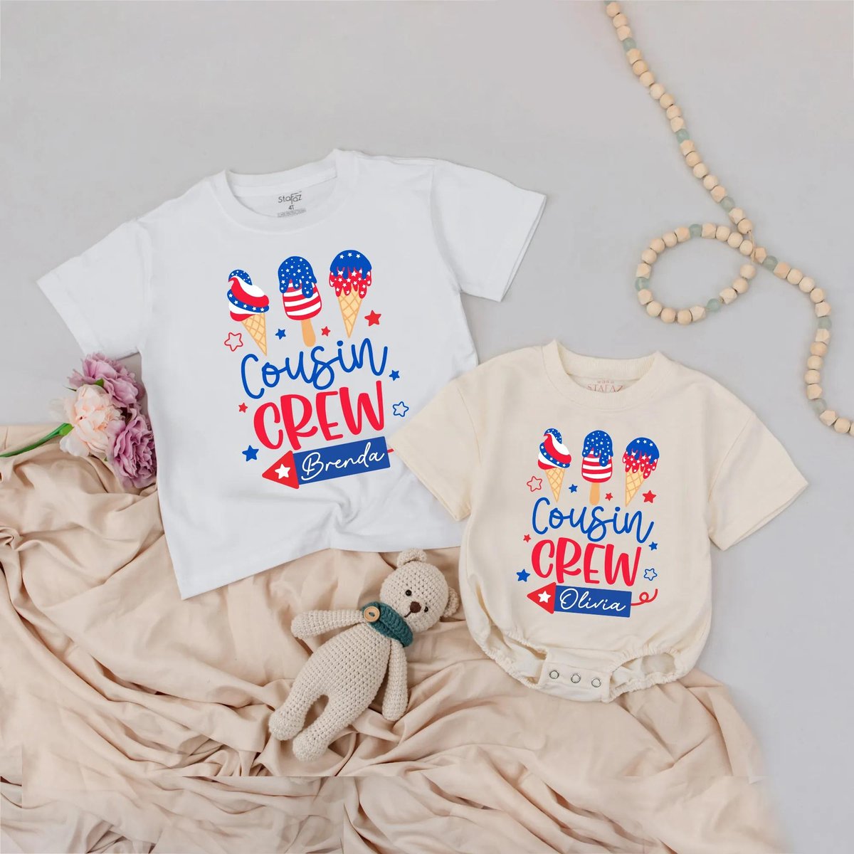 Cousin Crew Matching Shirts and Rompers 4th of July Patriotic Ice Cream Outfits Custom Name Baby Clo 430