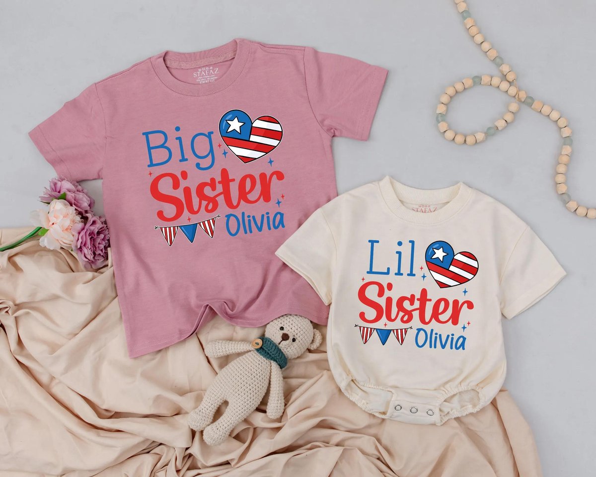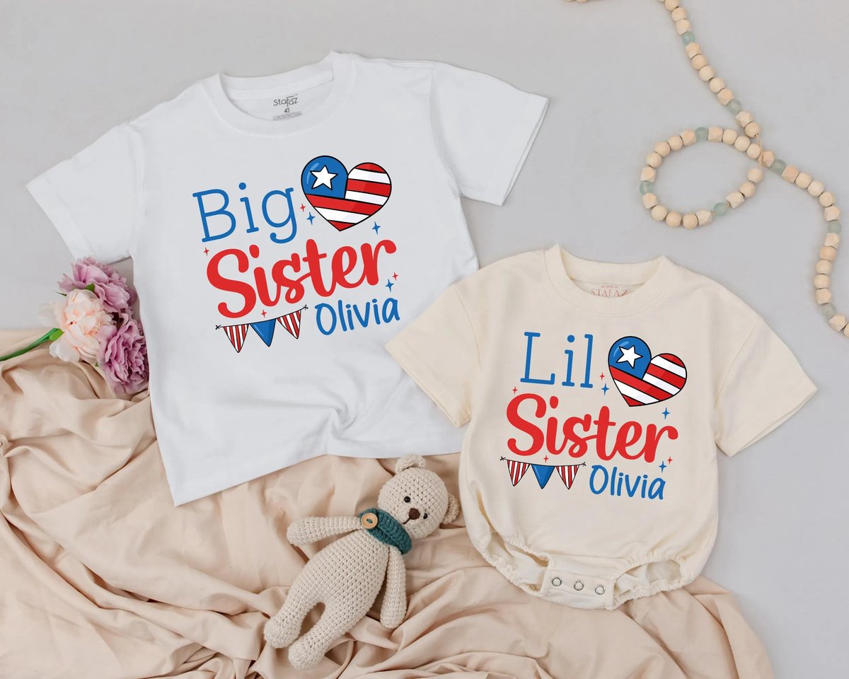 Personalized Name 4th of July Sisters Outfit Big Sister Toddler Shirt Lil Sister Bubble Romper Match 430