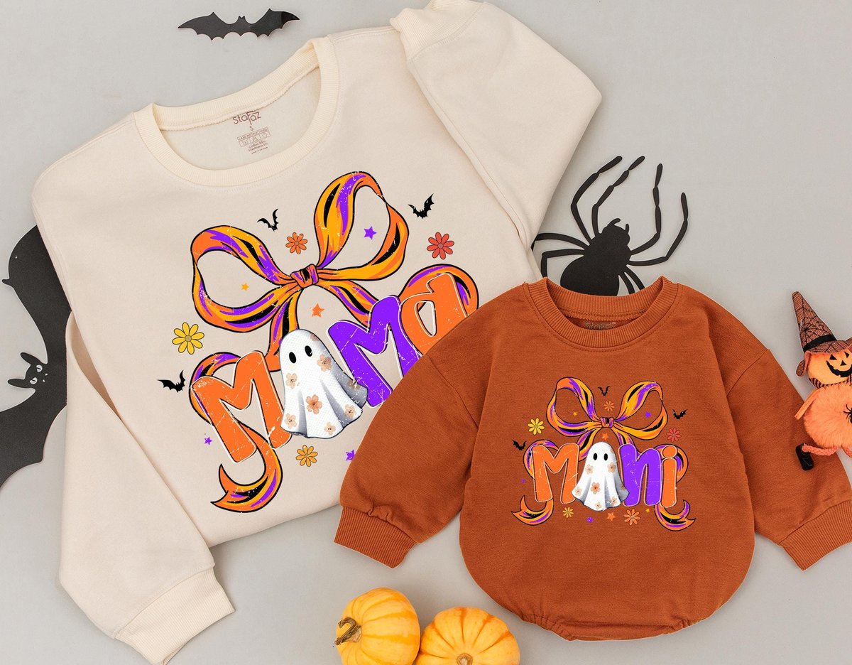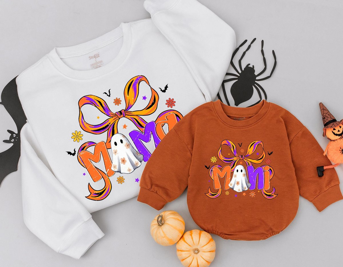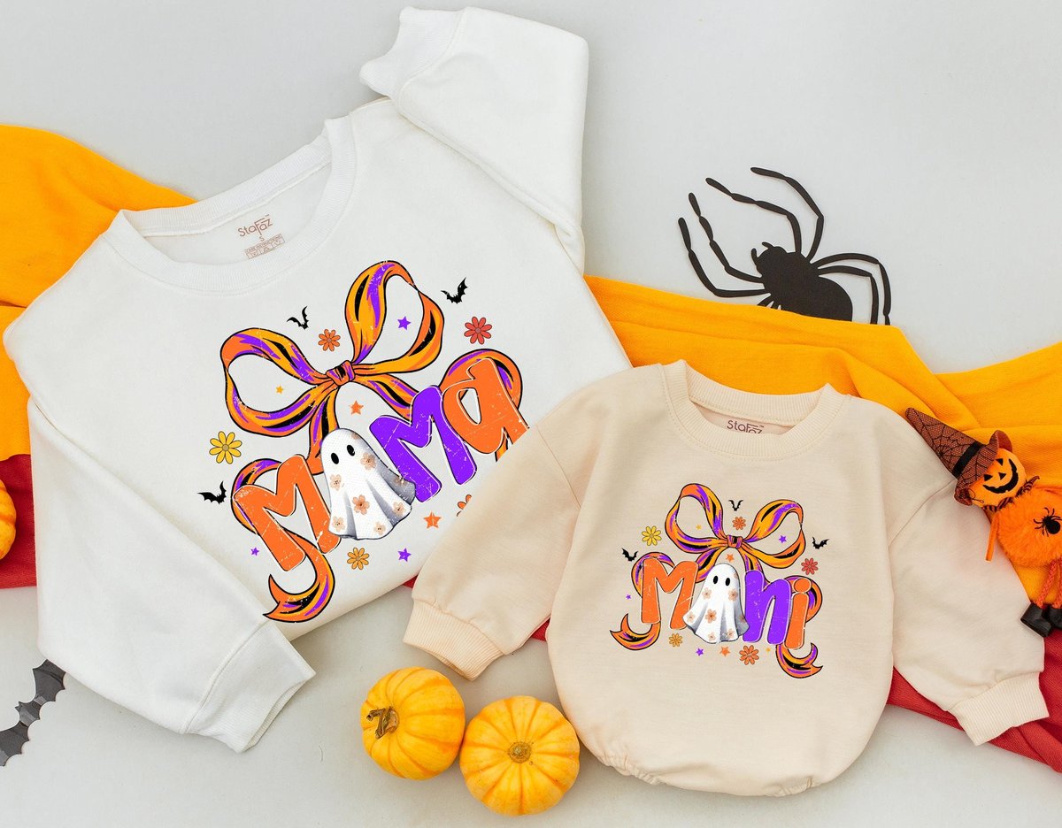 Mama and Mini Bow Halloween Sweatshirts Fall Mommy and Me Sweaters Halloween Matching Shirts Retro H 436