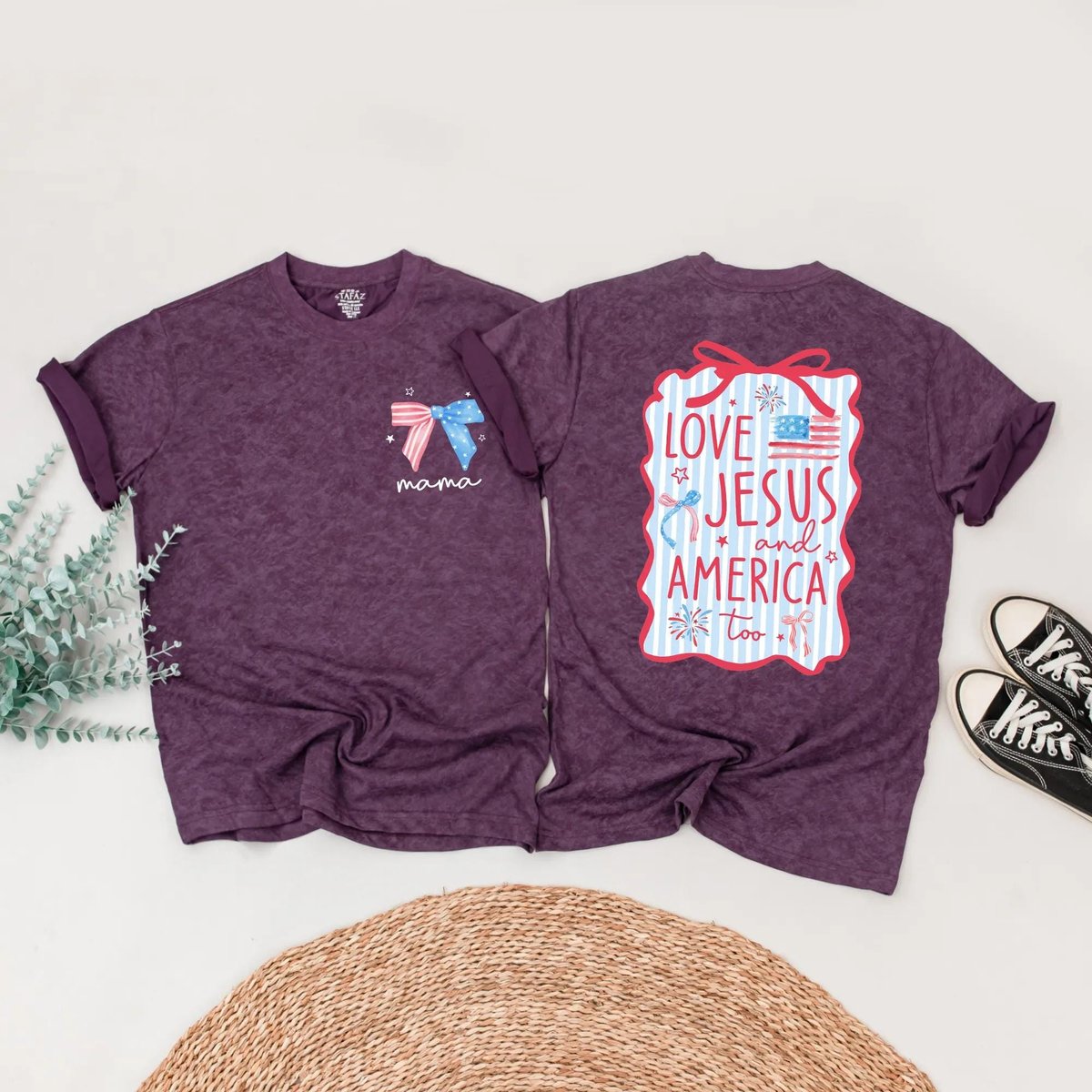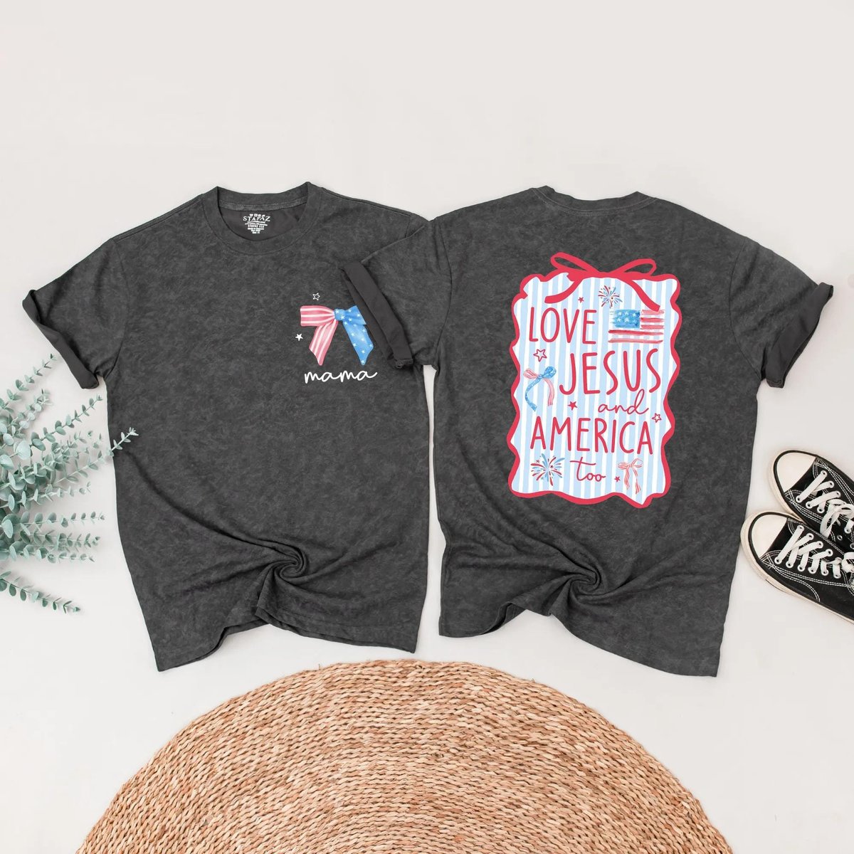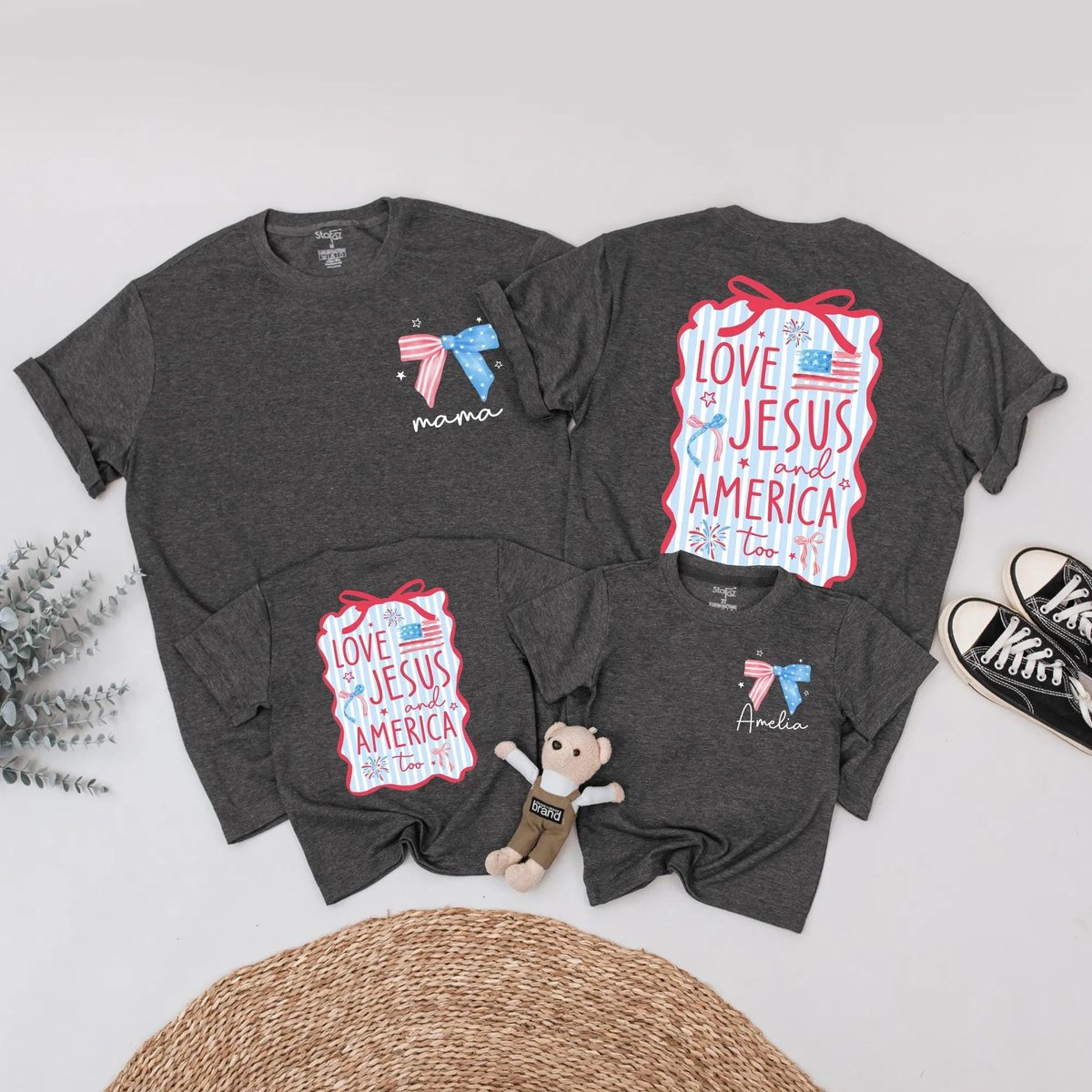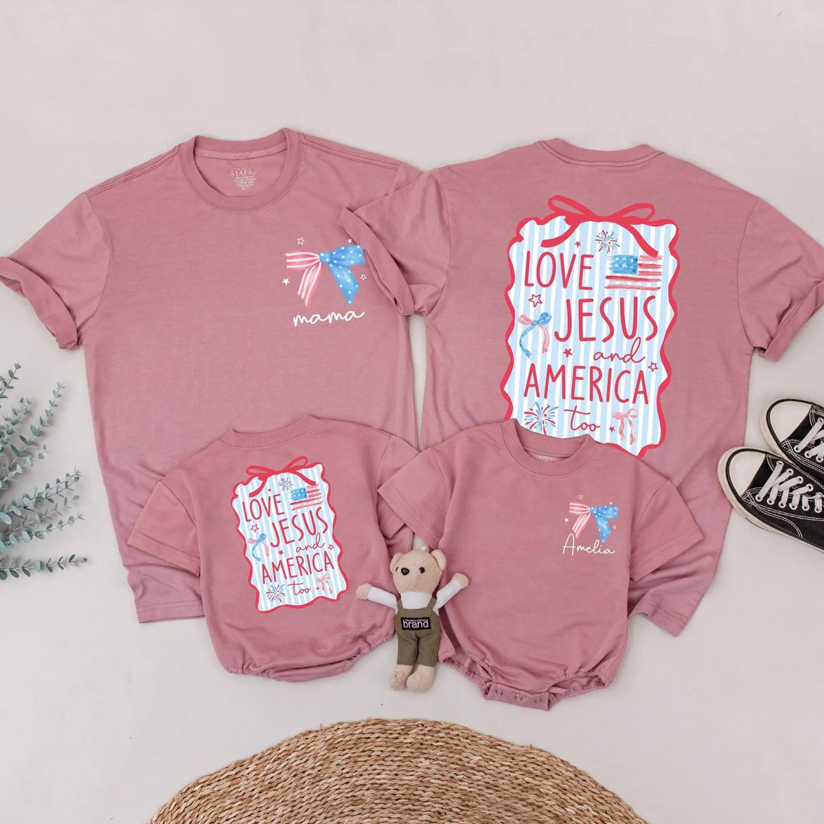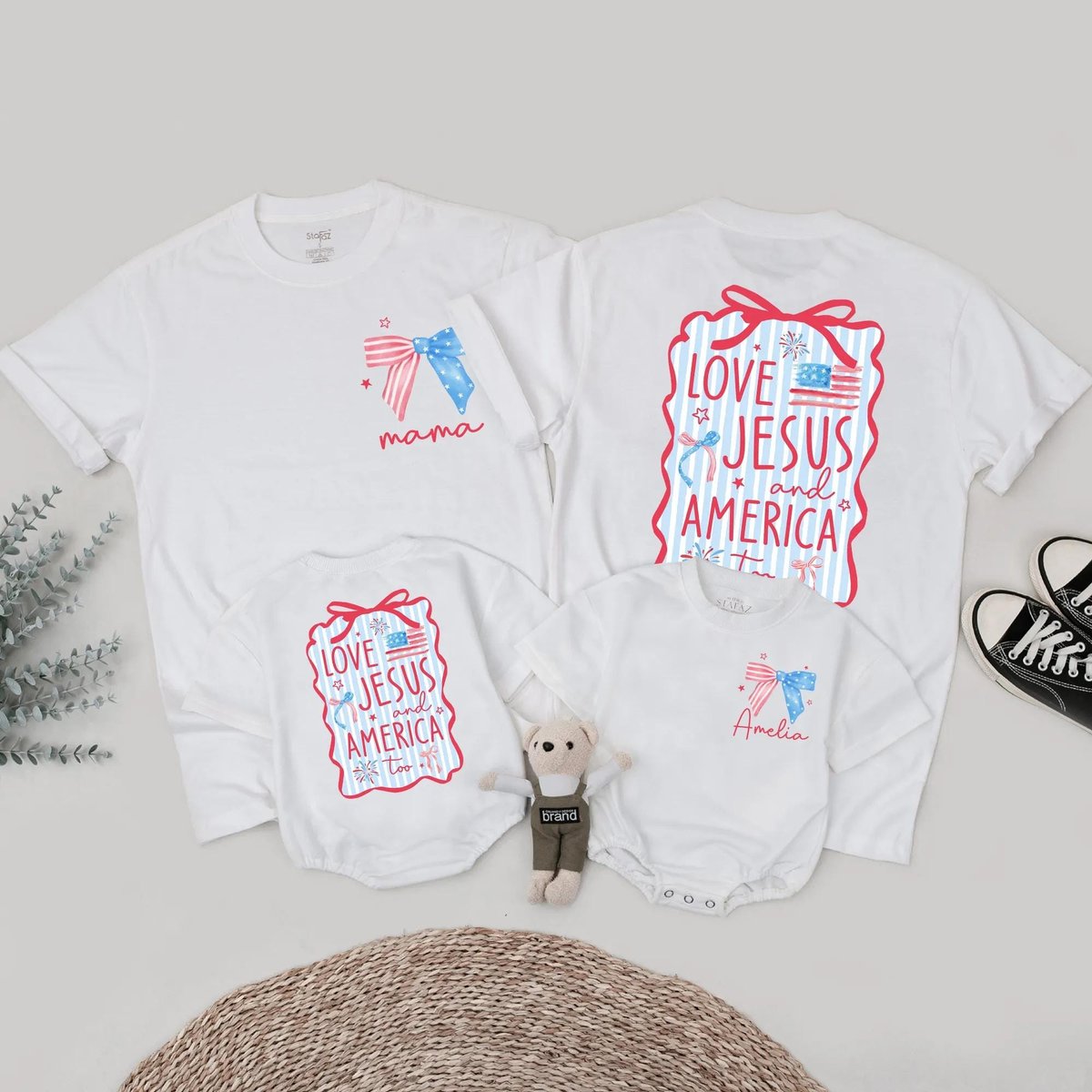Personalized Love Jesus and America Too Matching Outfit Independence Day Bow Shirt 4th of July Baby 430