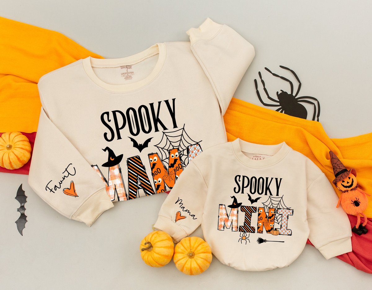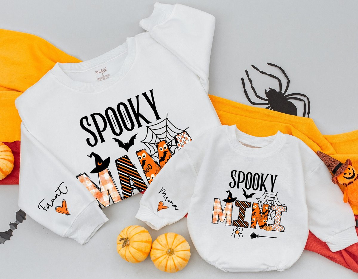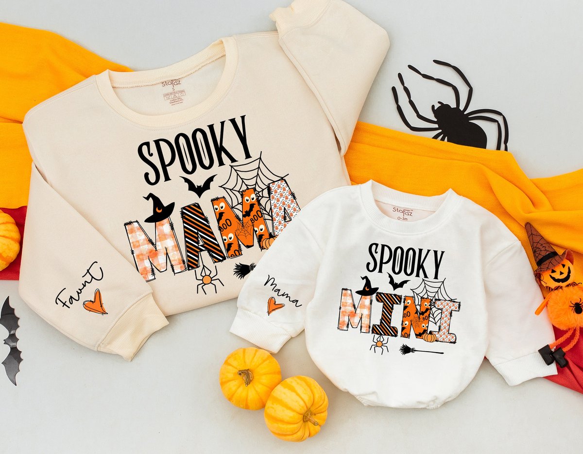 Spooky Mama and Mini Halloween Sweatshirt Cute Spooky Season baby romper gift Retro fall clothes Mat 175