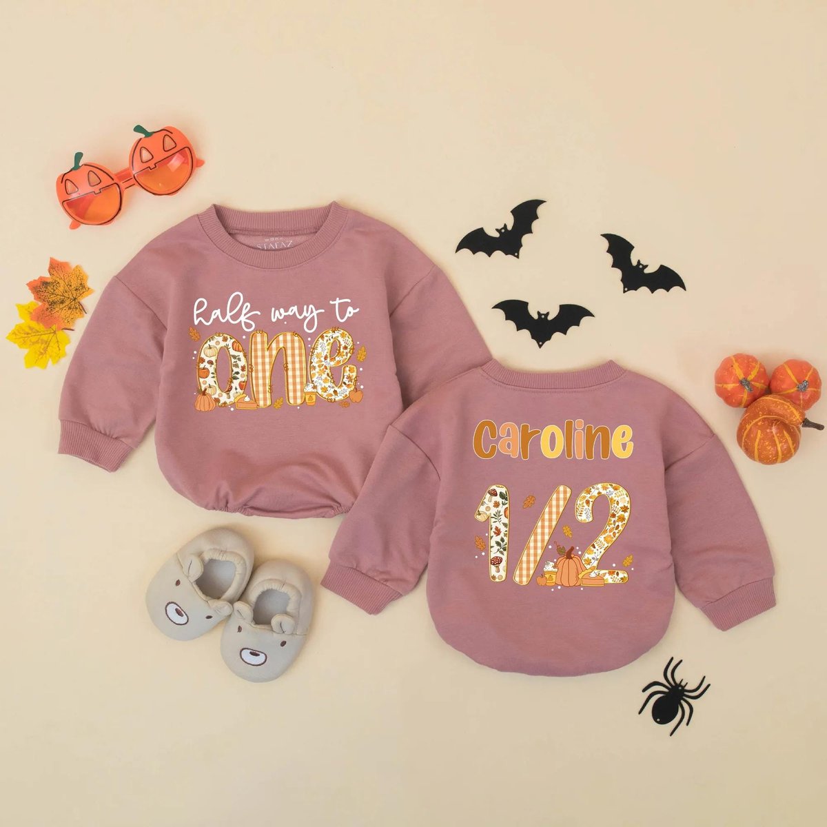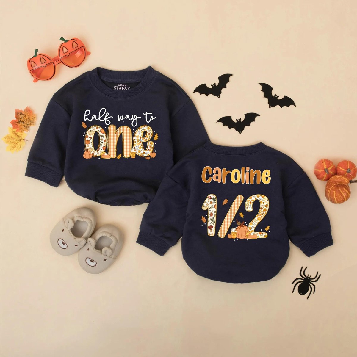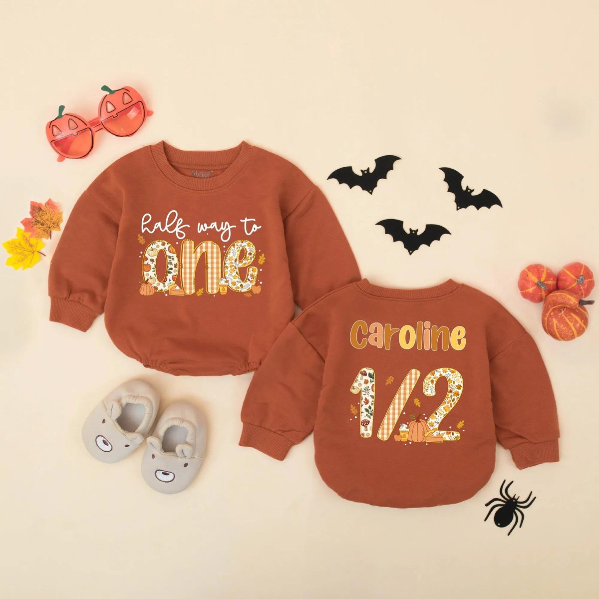 Custom Autumn Half Way to One Bubble Romper Personalized Thanksgiving Baby Outfits Fall 12 Birthday 436