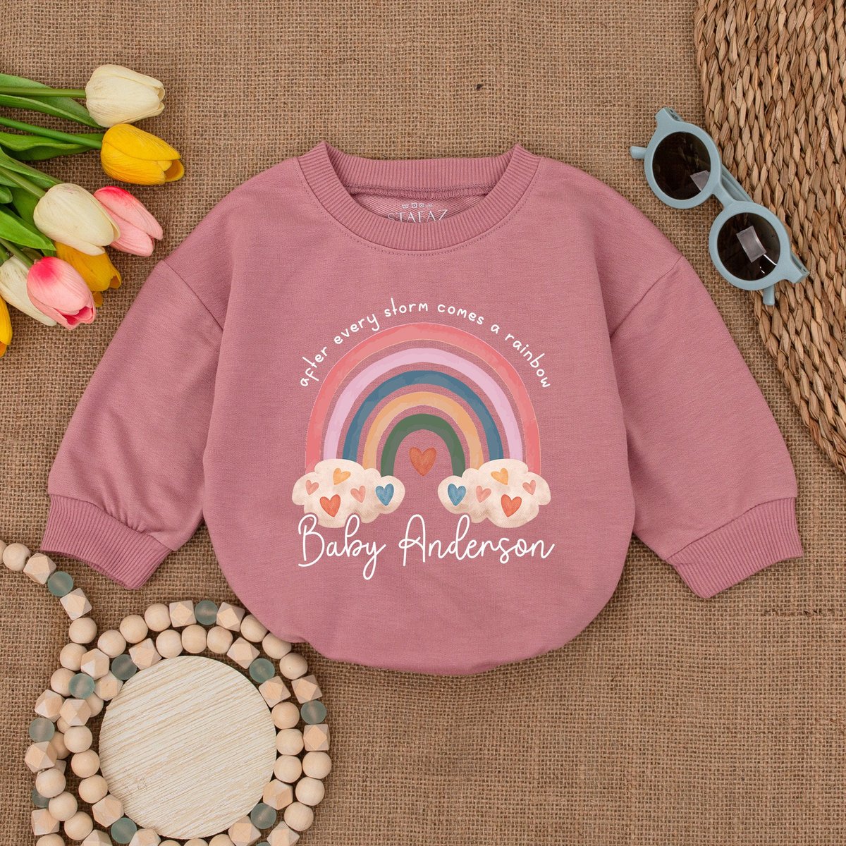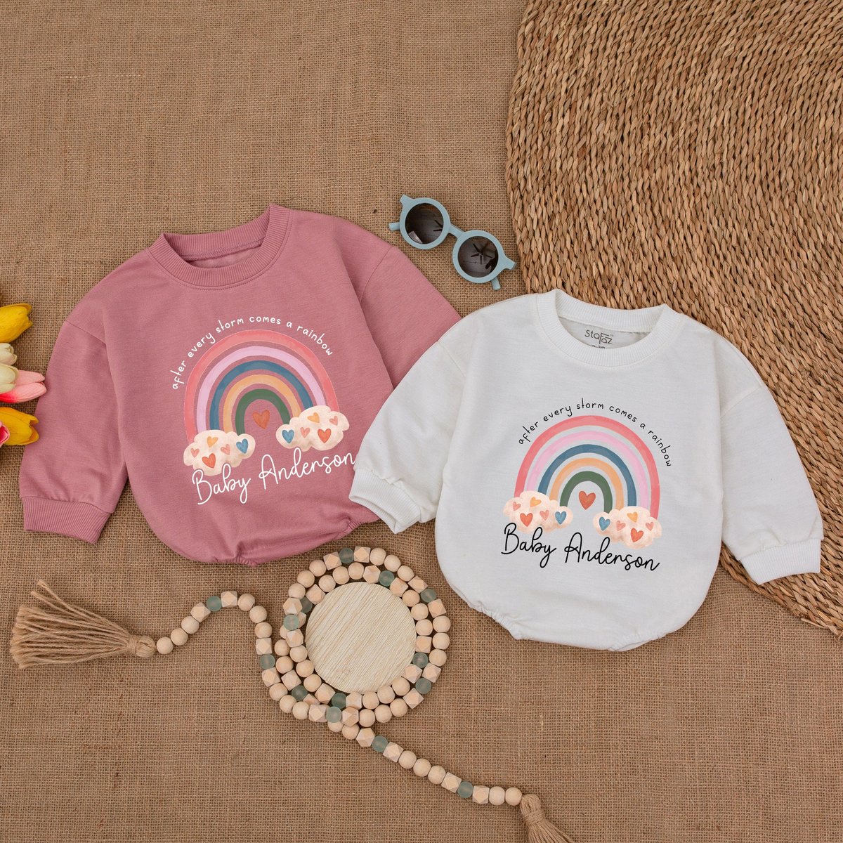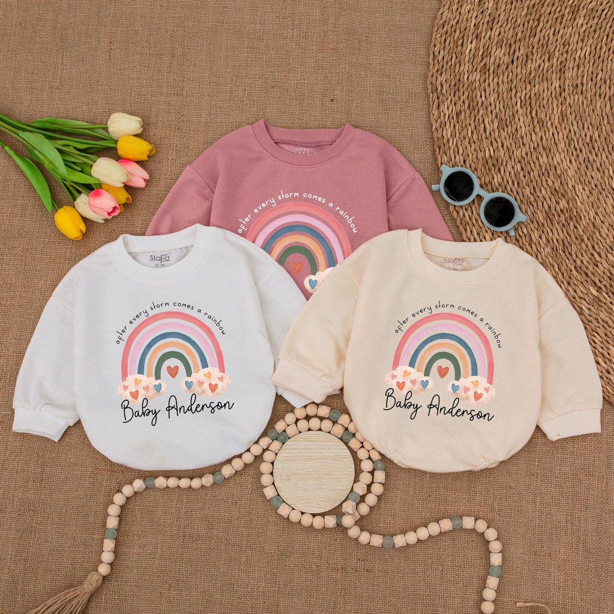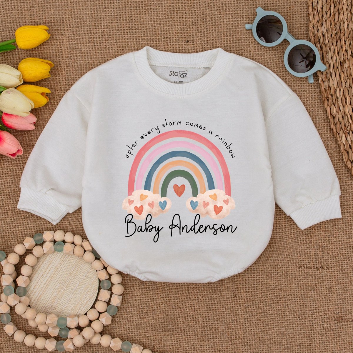 Custom Name After Every Storm Comes a Rainbow Romper IVF Baby Bodysuit Miracle Baby Bodysuit Rainbow 173