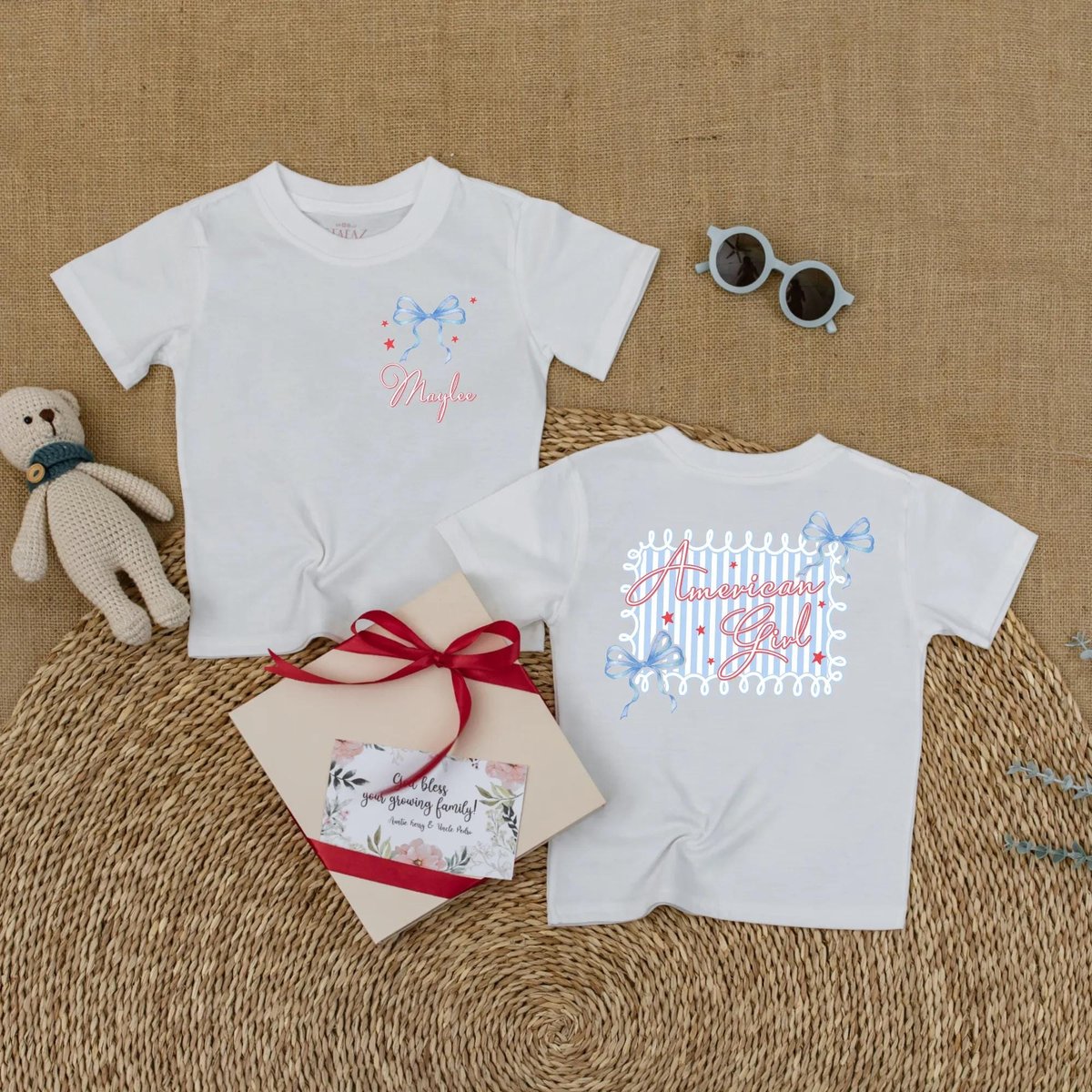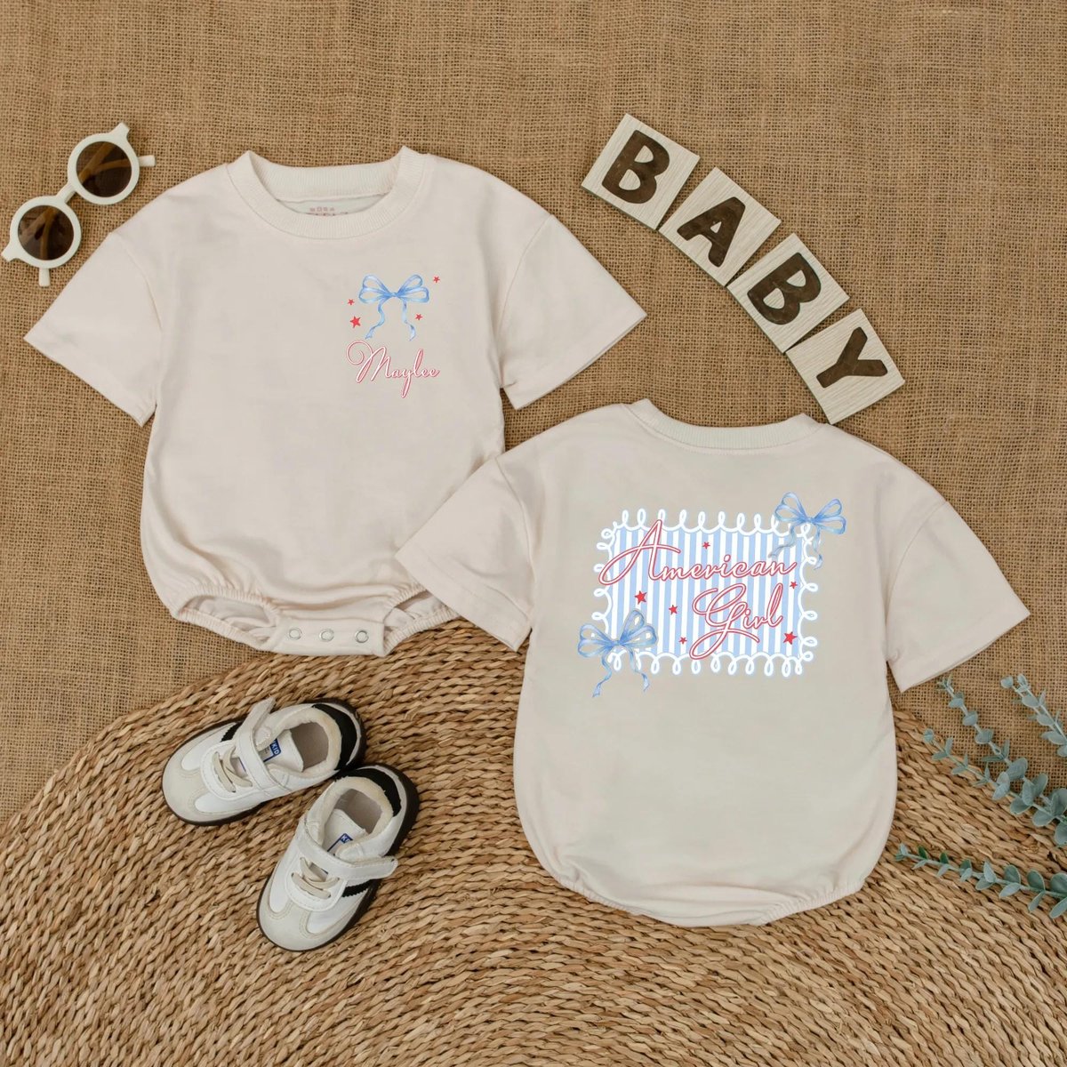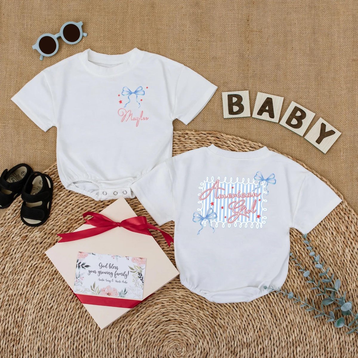 Personalized American Girl Flag and Bows Baby Romper Fourth of July Girly Baby Bodysuit Baby Girl Cl 430